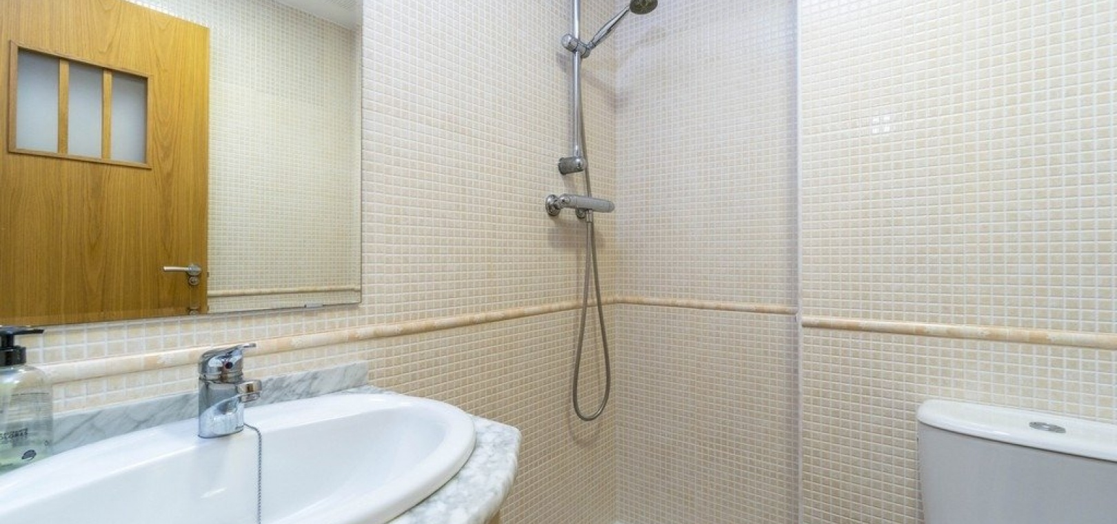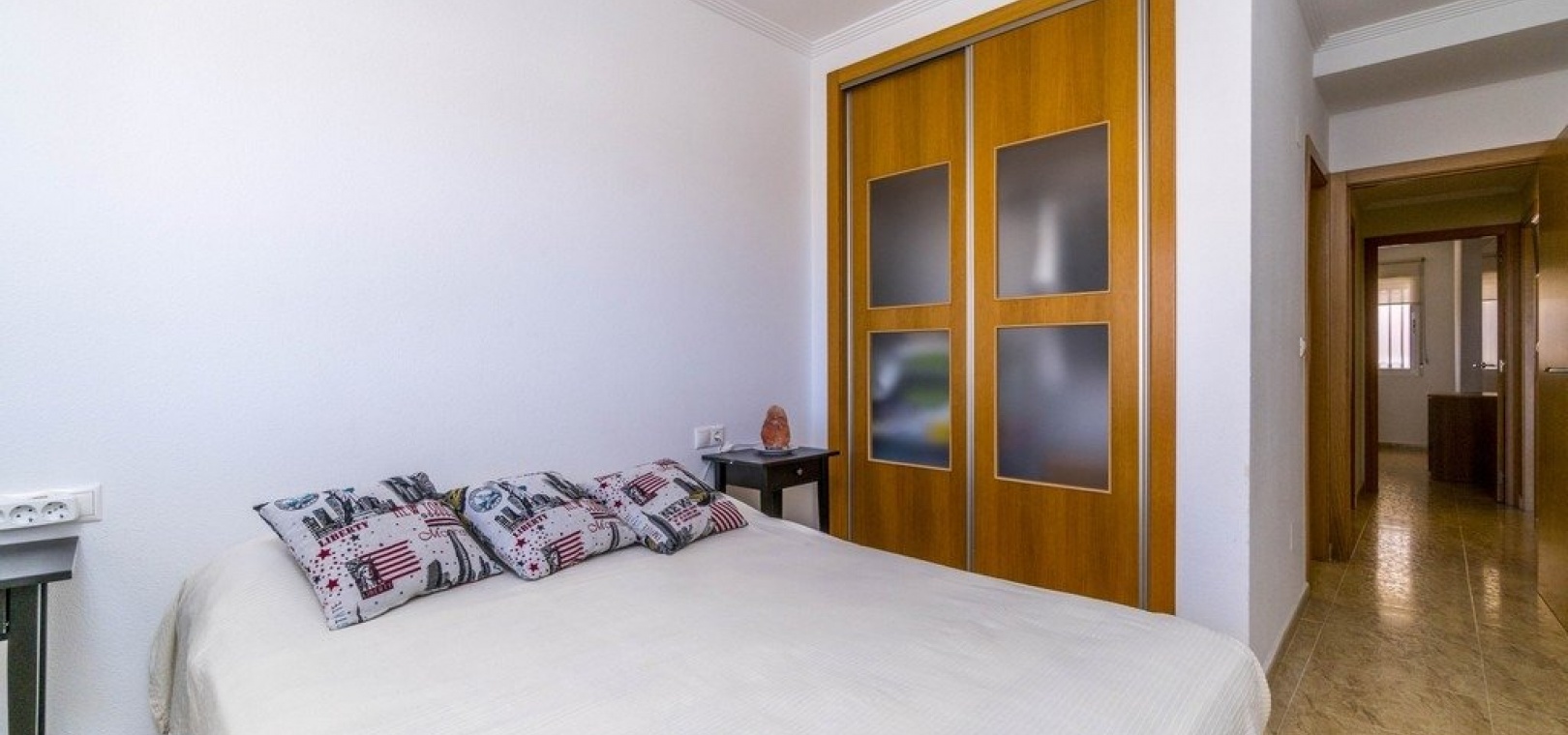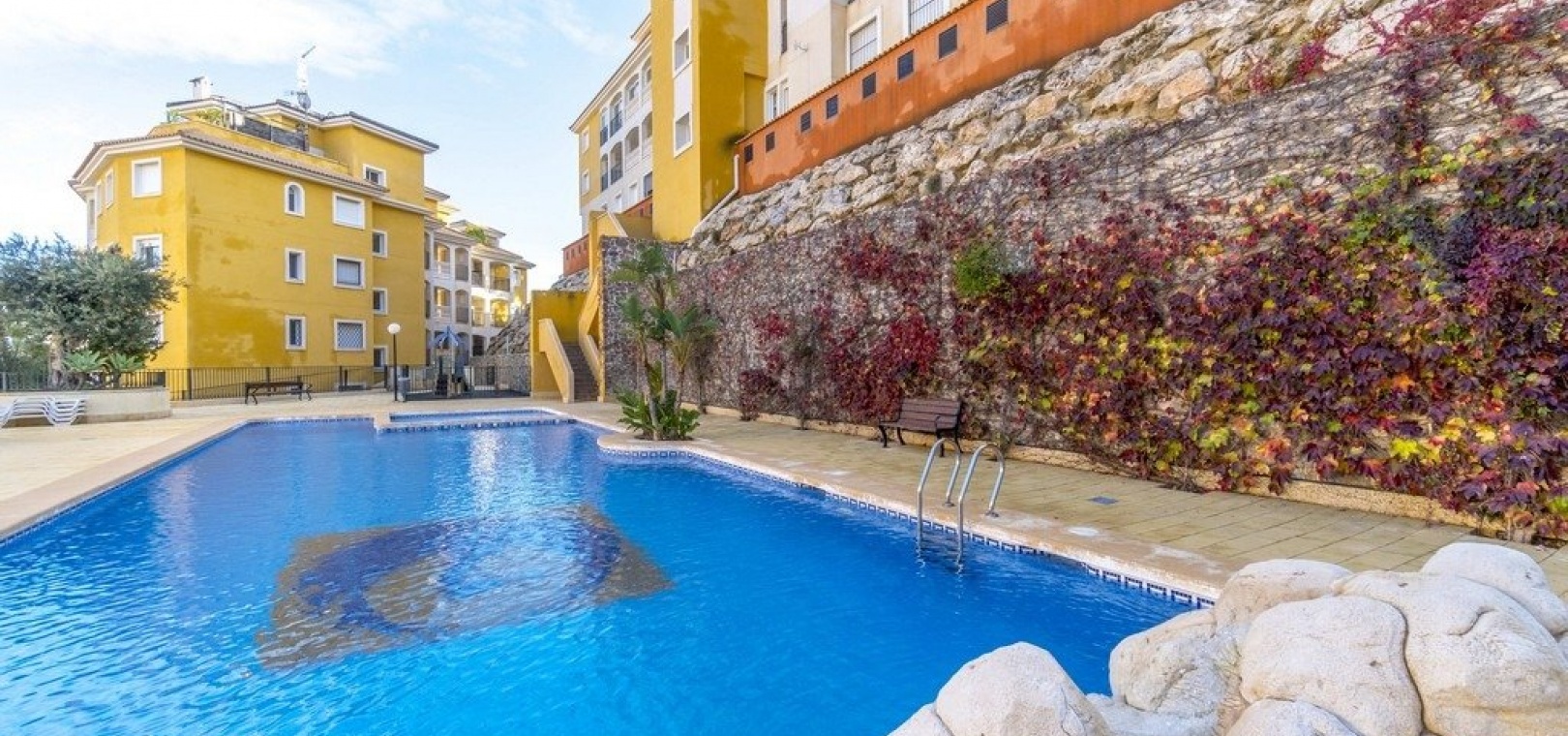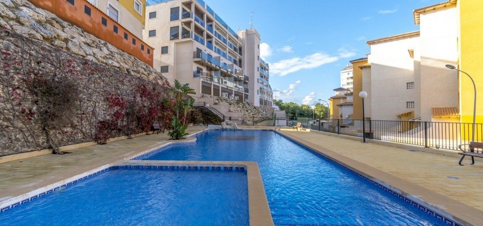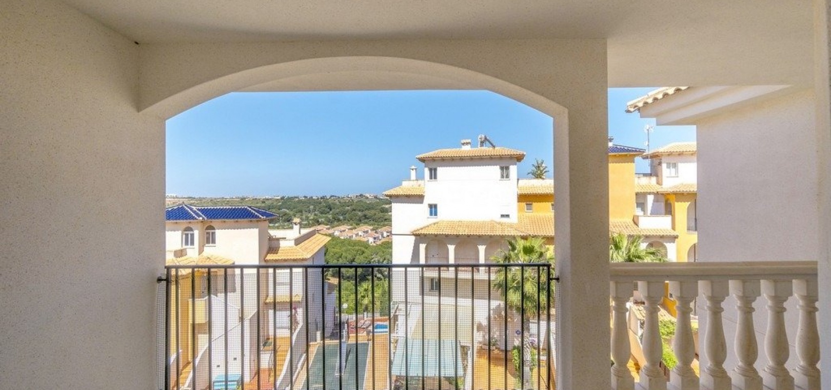 Vardagsrum/matsal med varm och kall A/C, ett fullt utrustat kök med öppen planlösning, 2 x dubbelrum, det största sovrummet har ett eget duschrum, 1 x familjebadrum, stor balkong utanför loungen havsutsikt, en mycket stor 50m2 privat takterrass med fantastisk utsikt, gemensam pool, barnpark, tennisbana och grönområden. & mycket mer.