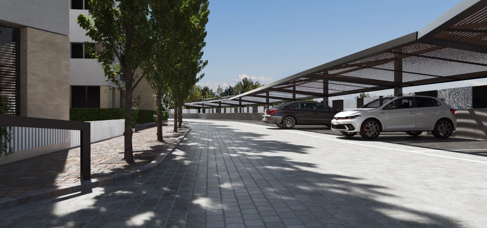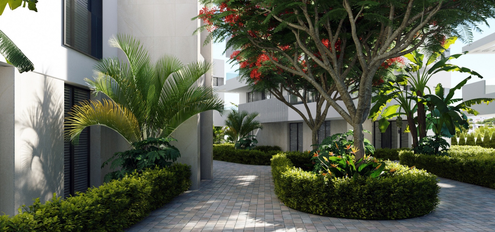 Fastigheter på bottenvåningen har en stor terrass och trädgård, fastigheter på mitten av våningen har balkong och fastigheter på översta våningen har balkong och privat solarium.