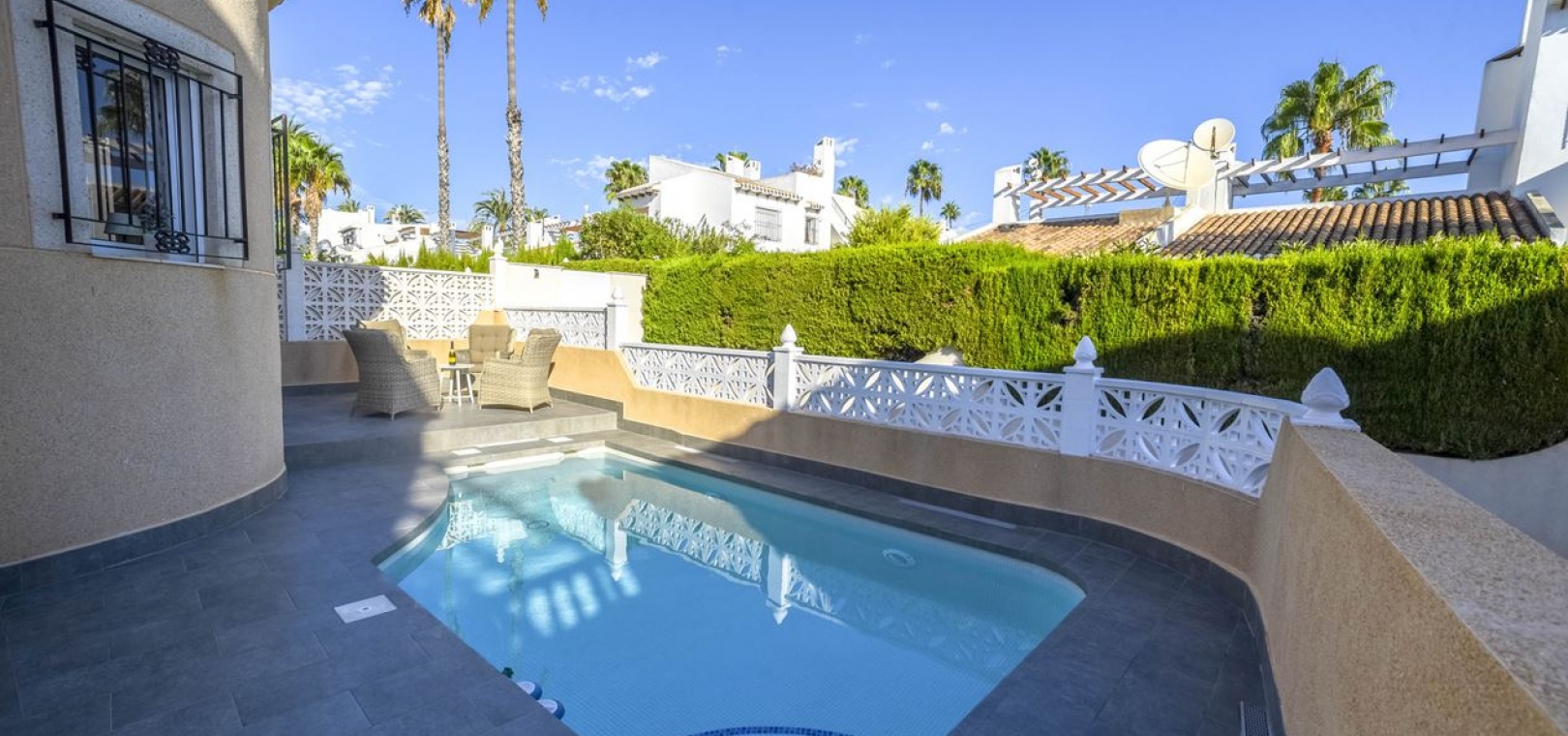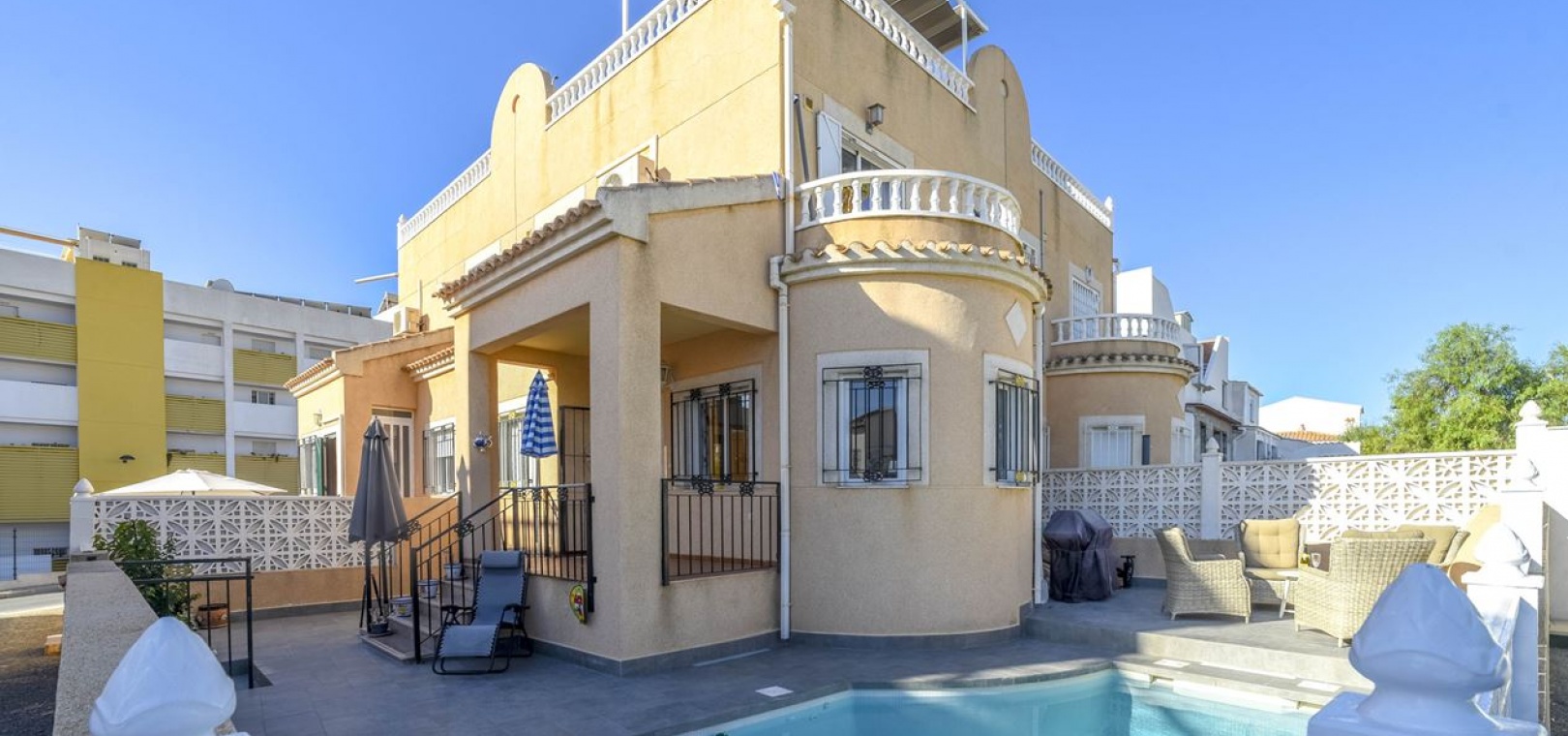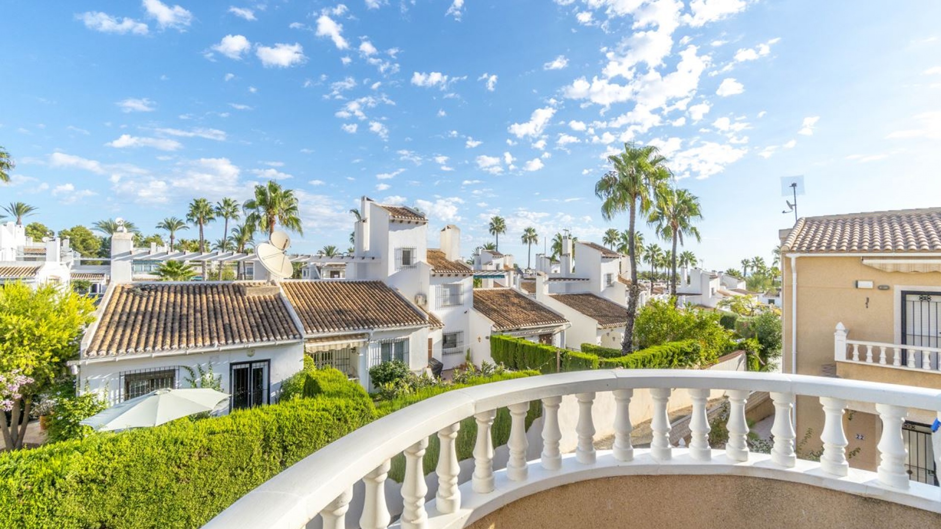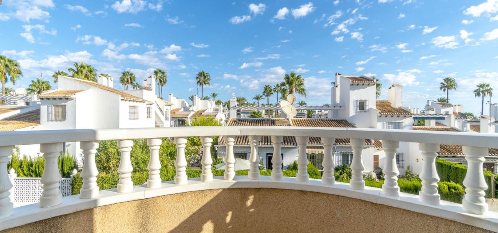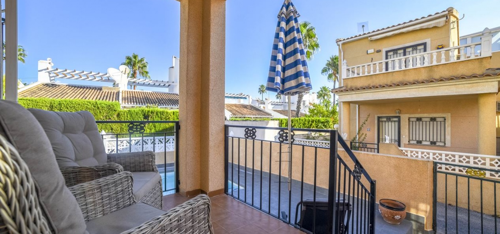 Ett fyrbäddshus med 3 sovrum och 2 badrum med privat pool beläget i La Fuente, Villamartin, Costa Blanca South. Denna härliga fastighet bjuds ut till försäljning i gott skick och består mycket kortfattat av följande: - På bottenvåningen finns ett vardagsrum/matsal med varm och kall luftkonditionering, ett fullt utrustat kök med öppen planlösning, 1 x sovrum och 1 x duschrum. Interna trappor leder till första våningen där det finns 2 x dubbelrum, båda med inbyggda garderober och varm och kall A/C, det största sovrummet har en privat balkong och 1 x familjebadrum. Från första våningen leder en inre trappa upp till solariet på taket som har underbar utsikt över det omgivande området. Utanför finns en täckt terrass och en privat pool. Lokala barer ligger bara 2 minuters promenad bort och snabbköpet Mercadona ligger bara 5 minuters promenad bort. La Fuente kommersiella centrum som har många barer, butiker, restauranger, stormarknader etc ligger bara 10 minuters promenad bort. Bussar och taxi stannar precis utanför La Fuente. Stränderna Golden Orihuela Costa ligger bara 5 minuters bilresa bort eller så kan du hoppa på lokalbussen. Det finns 4 golfbanor alla inom 5 minuters bilresa från denna fastighet och Alicantes flygplats ligger 50 minuter bort.