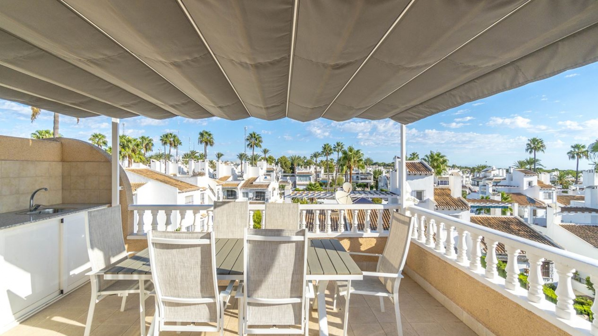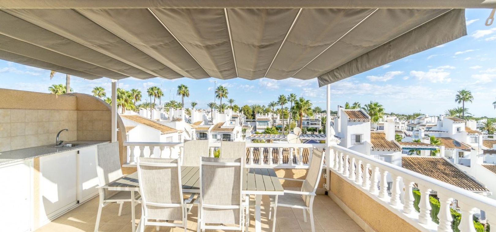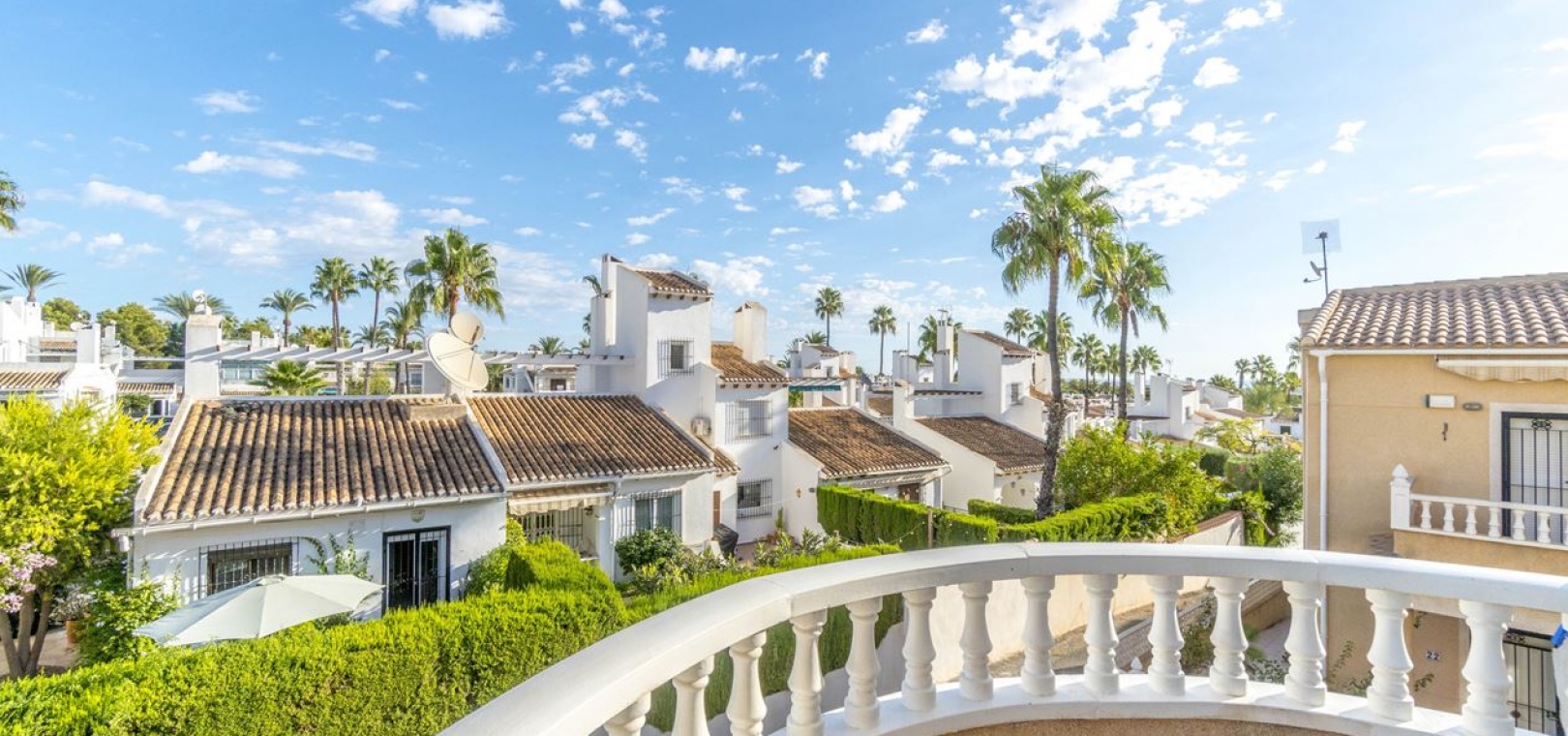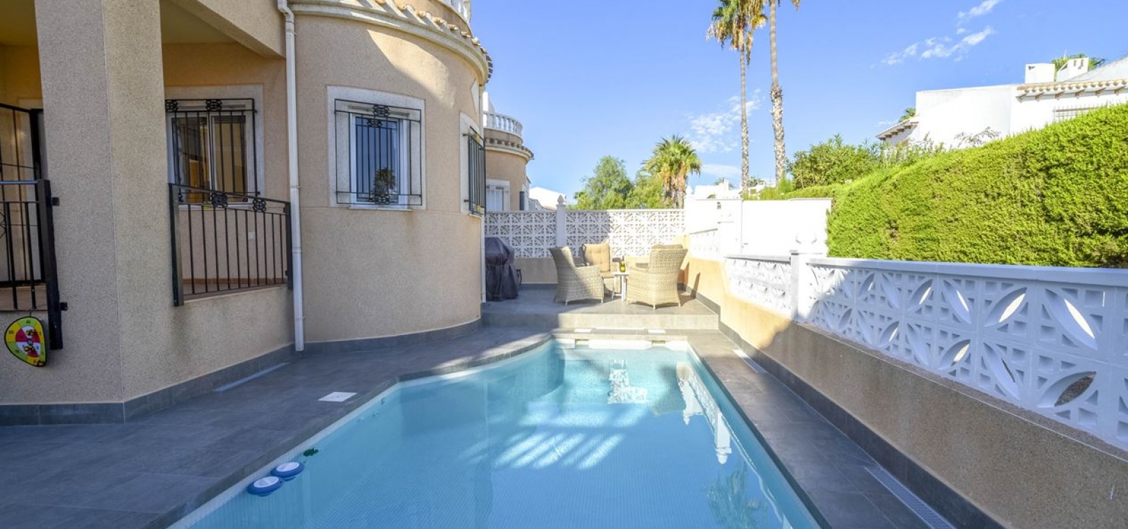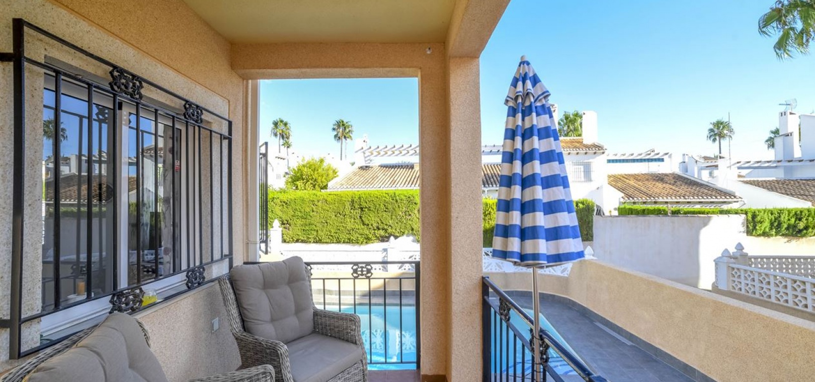 Ett fyrbäddshus med 3 sovrum och 2 badrum med privat pool beläget i La Fuente, Villamartin, Costa Blanca South. Denna härliga fastighet bjuds ut till försäljning i gott skick och består mycket kortfattat av följande: - På bottenvåningen finns ett vardagsrum/matsal med varm och kall luftkonditionering, ett fullt utrustat kök med öppen planlösning, 1 x sovrum och 1 x duschrum. Interna trappor leder till första våningen där det finns 2 x dubbelrum, båda med inbyggda garderober och varm och kall A/C, det största sovrummet har en privat balkong och 1 x familjebadrum. Från första våningen leder en inre trappa upp till solariet på taket som har underbar utsikt över det omgivande området. Utanför finns en täckt terrass och en privat pool. Lokala barer ligger bara 2 minuters promenad bort och snabbköpet Mercadona ligger bara 5 minuters promenad bort. La Fuente kommersiella centrum som har många barer, butiker, restauranger, stormarknader etc ligger bara 10 minuters promenad bort. Bussar och taxi stannar precis utanför La Fuente. Stränderna Golden Orihuela Costa ligger bara 5 minuters bilresa bort eller så kan du hoppa på lokalbussen. Det finns 4 golfbanor alla inom 5 minuters bilresa från denna fastighet och Alicantes flygplats ligger 50 minuter bort.