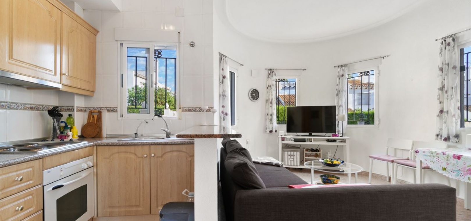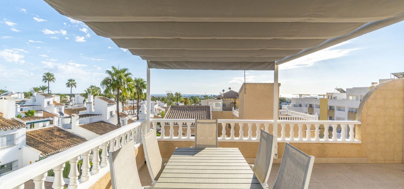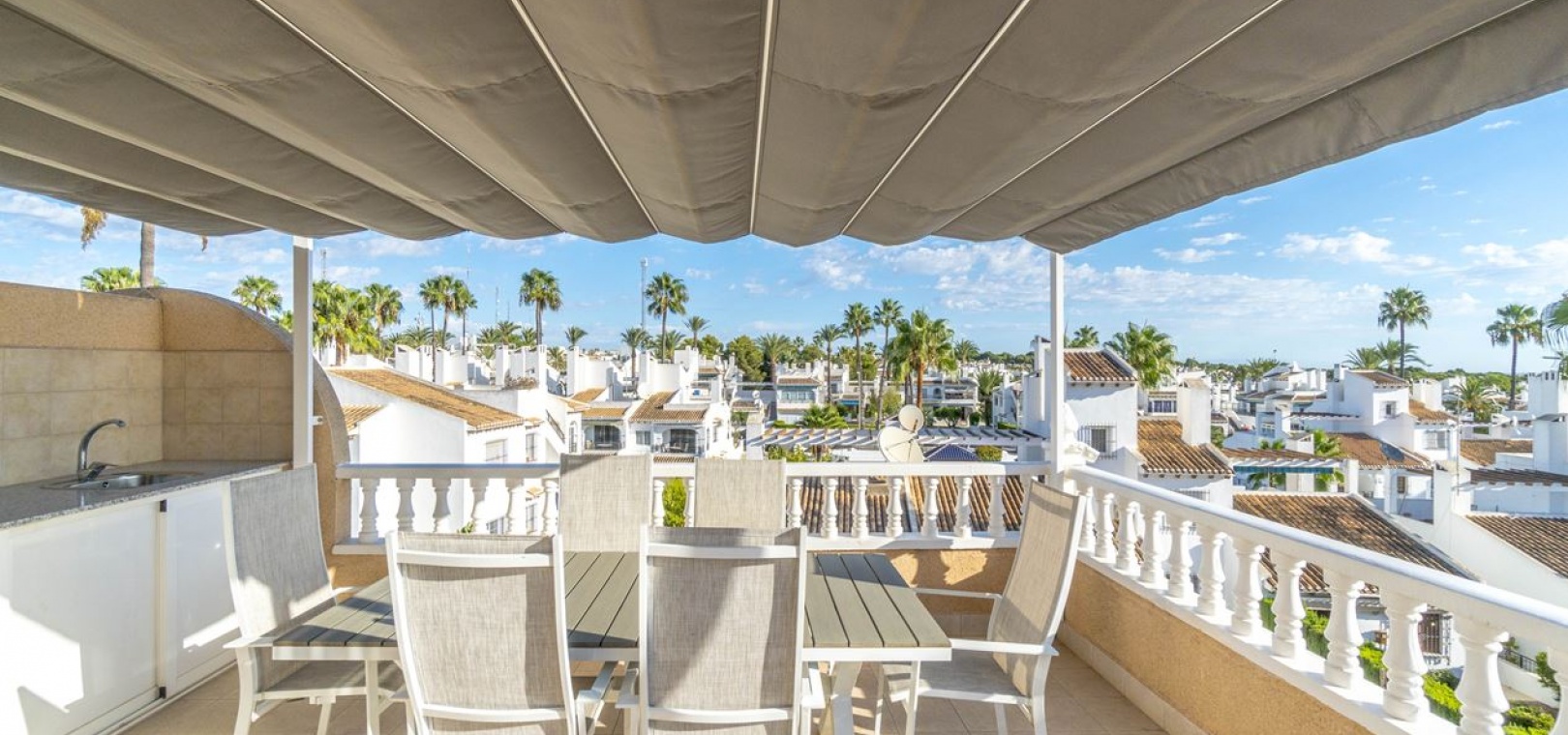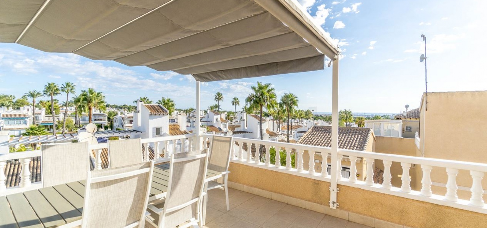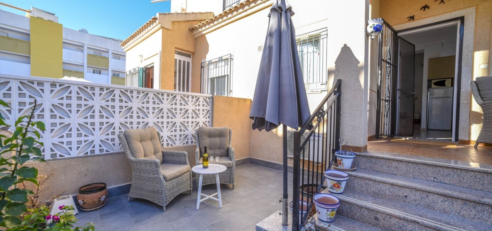 Ett fyrbäddshus med 3 sovrum och 2 badrum med privat pool beläget i La Fuente, Villamartin, Costa Blanca South. Denna härliga fastighet bjuds ut till försäljning i gott skick och består mycket kortfattat av följande: - På bottenvåningen finns ett vardagsrum/matsal med varm och kall luftkonditionering, ett fullt utrustat kök med öppen planlösning, 1 x sovrum och 1 x duschrum. Interna trappor leder till första våningen där det finns 2 x dubbelrum, båda med inbyggda garderober och varm och kall A/C, det största sovrummet har en privat balkong och 1 x familjebadrum. Från första våningen leder en inre trappa upp till solariet på taket som har underbar utsikt över det omgivande området. Utanför finns en täckt terrass och en privat pool. Lokala barer ligger bara 2 minuters promenad bort och snabbköpet Mercadona ligger bara 5 minuters promenad bort. La Fuente kommersiella centrum som har många barer, butiker, restauranger, stormarknader etc ligger bara 10 minuters promenad bort. Bussar och taxi stannar precis utanför La Fuente. Stränderna Golden Orihuela Costa ligger bara 5 minuters bilresa bort eller så kan du hoppa på lokalbussen. Det finns 4 golfbanor alla inom 5 minuters bilresa från denna fastighet och Alicantes flygplats ligger 50 minuter bort.