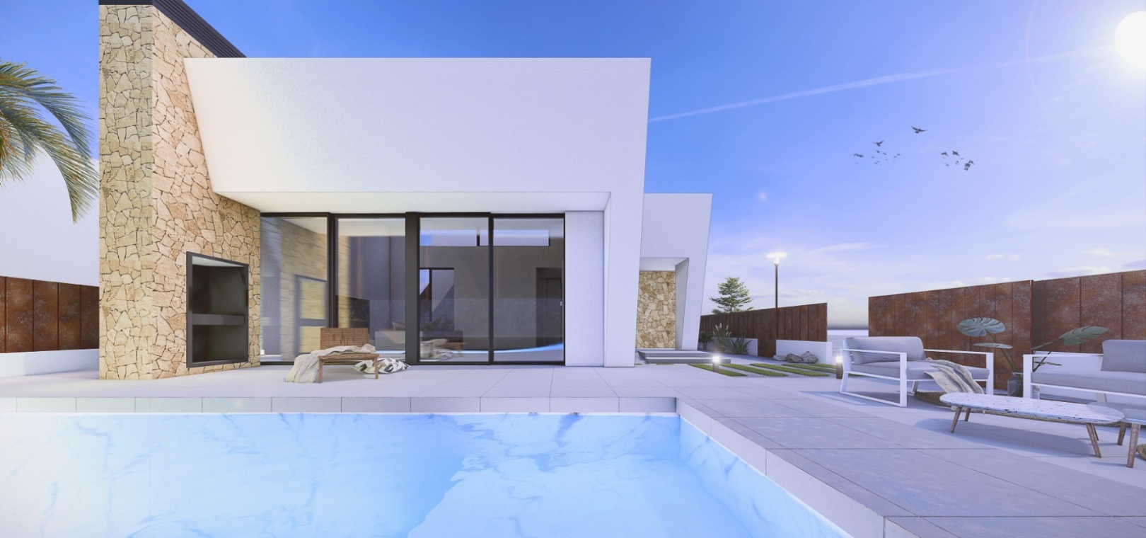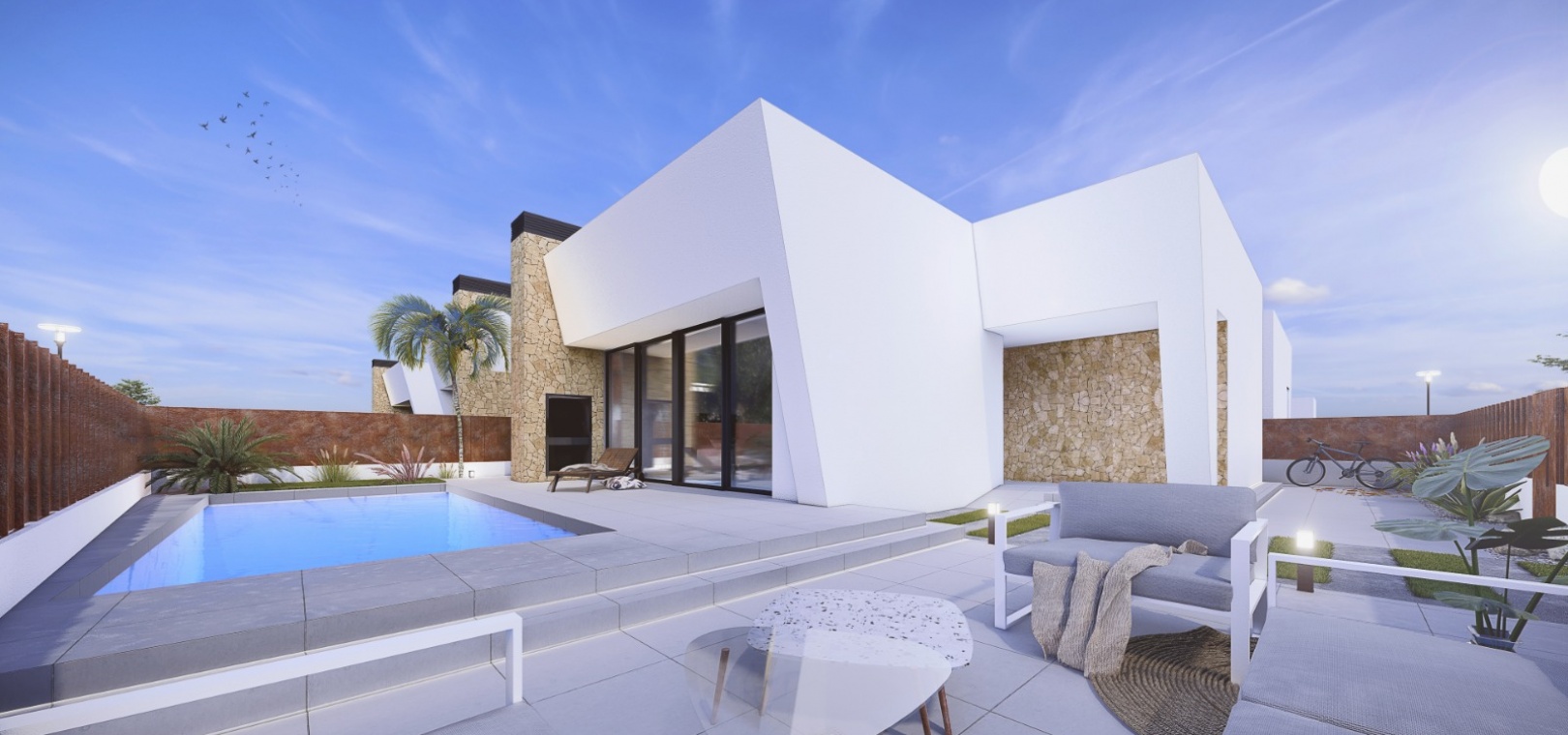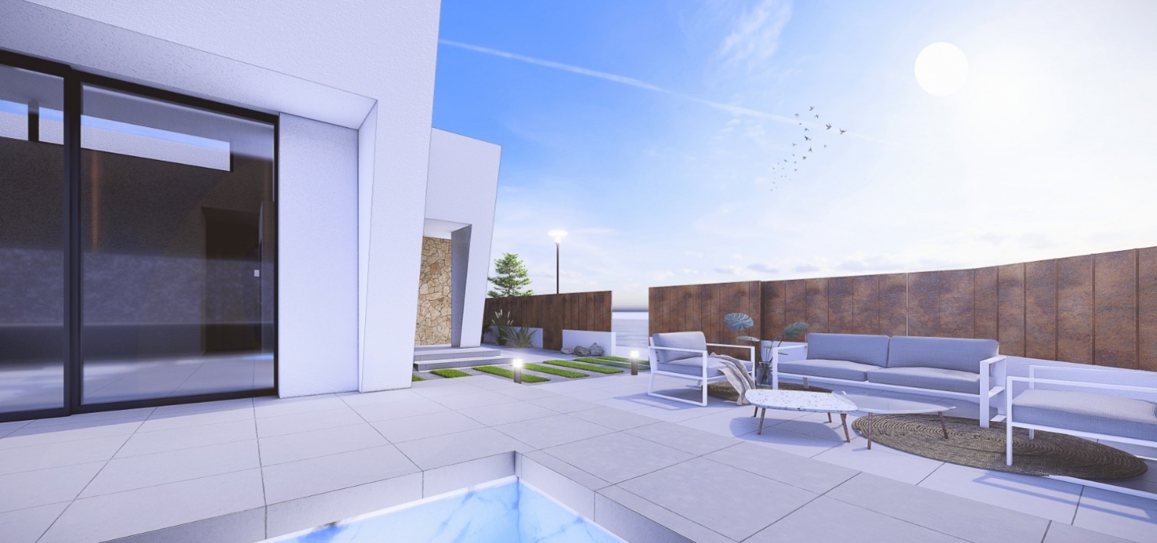 Nybyggd modern design 3 sovrum 2 badrum fristående villor med privat pool belägna i Res. Sunset Villa Lux i den vackra kuststaden San Pedro, Mar Menor, Murcia.