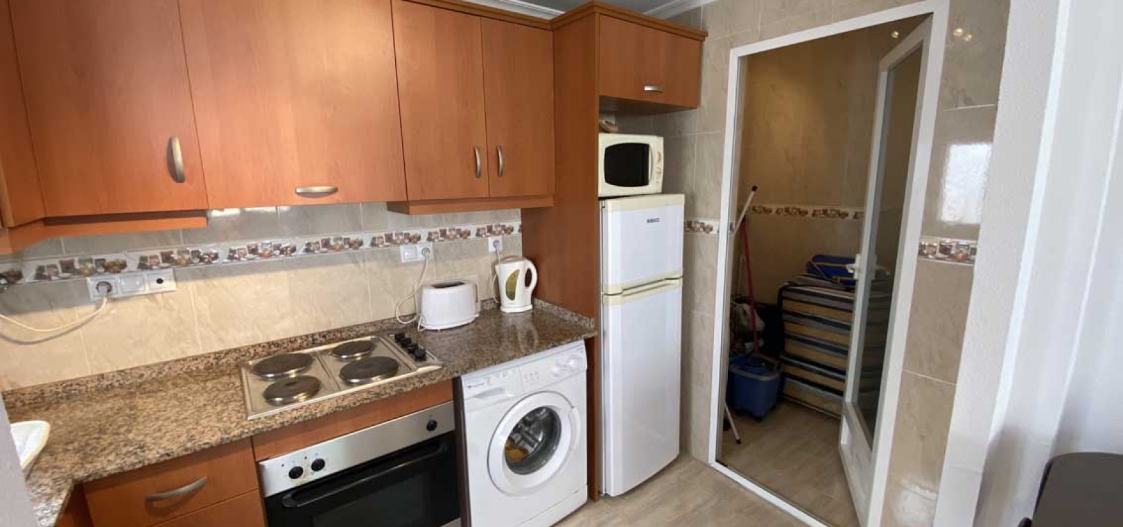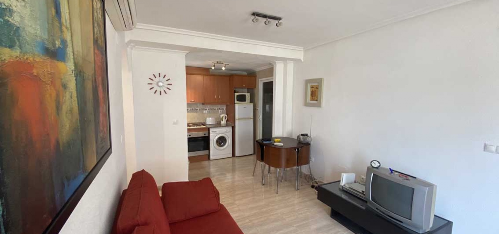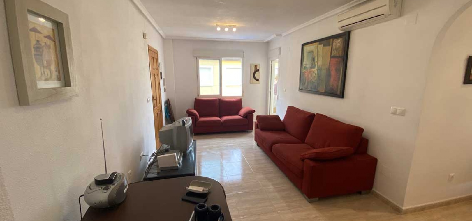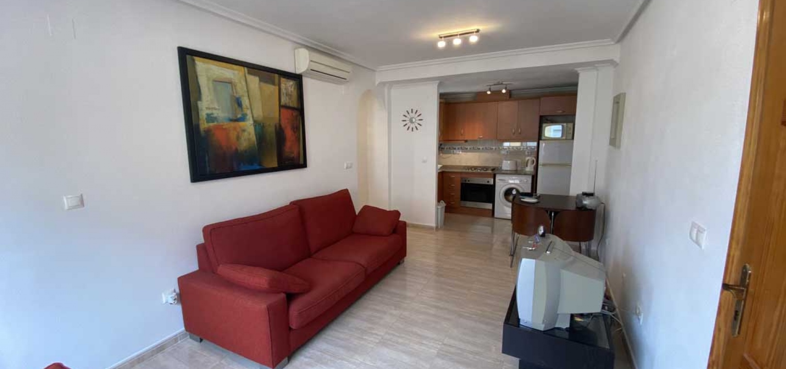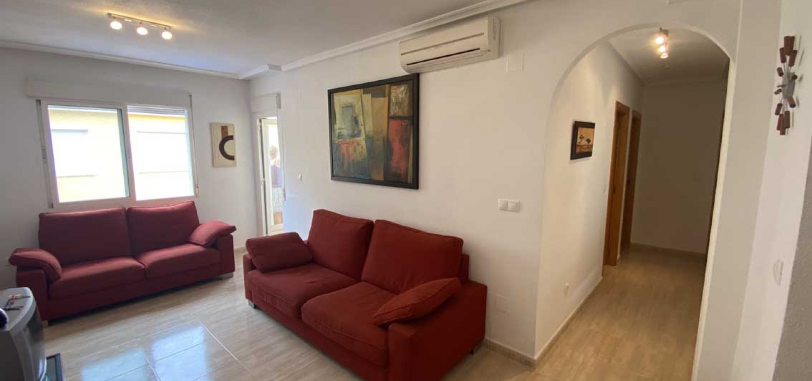 Vardagsrum/matrum med varm och kall A/C, separat fullt utrustat kök med separat bruksområde, 2 x dubbelrum, det största sovrummet har inbyggda garderober, 1 x familjebadrum, balkong och ett privat takterrass.