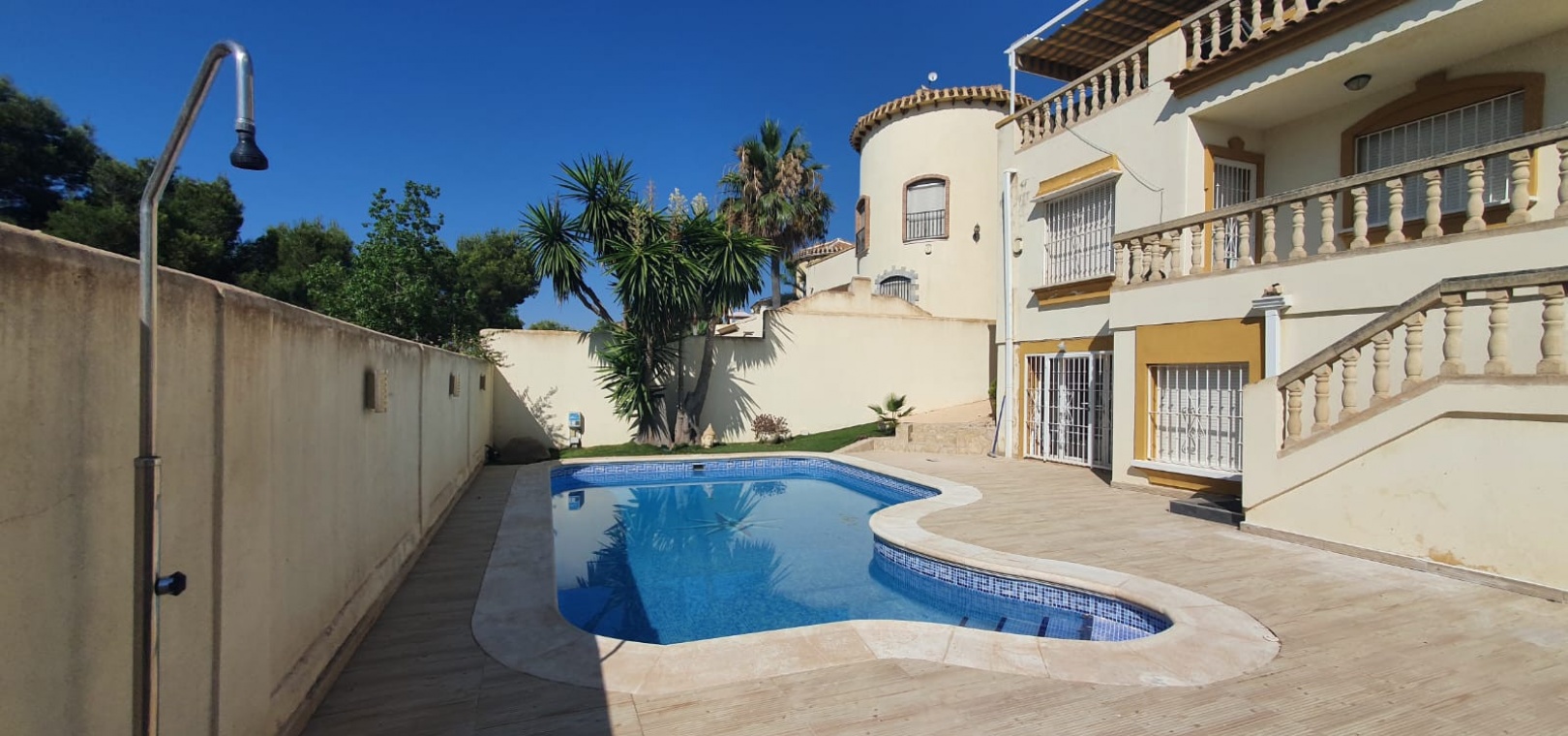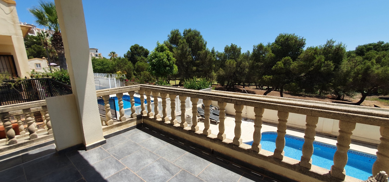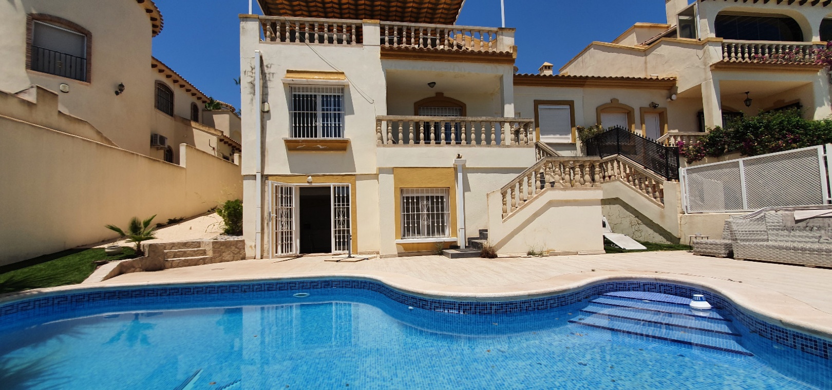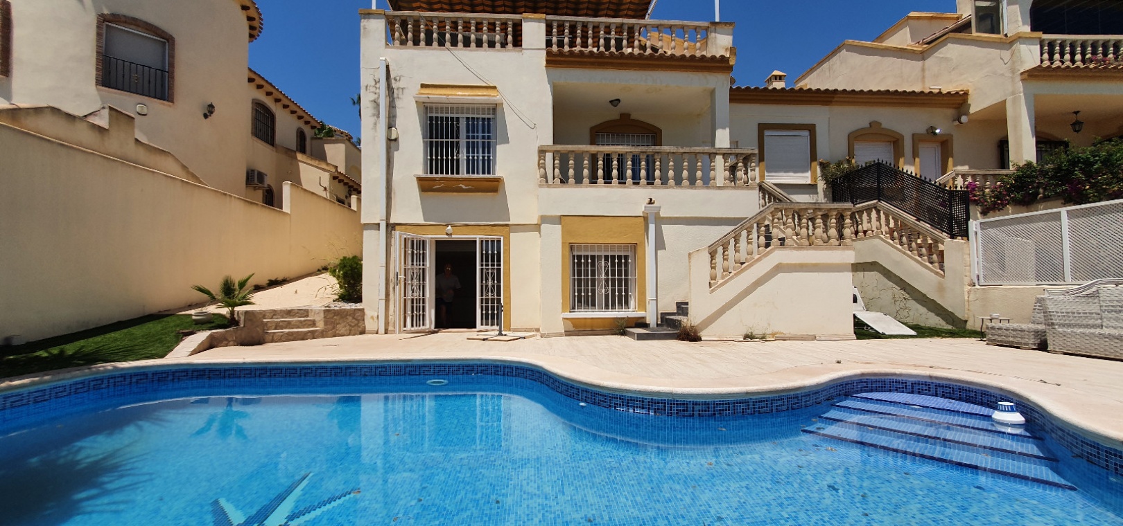 En fristående villa med 5 bäddar och 3,5 badrum med privat pool 1:a raden till den vackra golfbanan Las Ramblas, Villamartin, Costa Blanca South. Denna rymliga fastighet av hög kvalitet bjuds ut till försäljning i gott skick, delvis möblerad och består mycket kortfattat av följande:- Belägen på en lugn återvändsgränd, ligger denna villa på en stor tomt med lågt underhåll. In genom gångporten till vänster är en uppfart med plats för flera bilar och tillgång till det helt slutna garaget. På bottenvåningen finns 3 x dubbelrum med inbyggda garderober, det största sovrummet har ett eget badrum och altandörrar som tar dig ner till poolområdet. Det finns också ett familjebadrum. Interna trappor tar dig upp till första våningen där det finns ett mycket rymligt och ljust vardagsrum/matsal med en öppen spis och altandörrar som leder vidare till den stora bakre balkongen med en solmarkis och fantastisk utsikt. Från balkongen finns det trappsteg upp till ett litet solarium på taket. Det finns också altandörrar som leder ut till den främre balkongen. Det finns också en dörr som öppnar upp till trappsteg som tar dig ner till poolområdet. På första våningen hittar du också ett rymligt fullt utrustat oberoende kök och ett grovkök / förråd med toalett. Det finns en stor fristående källare med en lounge, ett öppet kök, 2 x dubbelrum, 1 x duschrum och ett förråd. Utanför fastigheten finns en stor tomt med en stor kaklad terrass runt den stora privata poolen. Från terrassen runt poolen kan du nå garaget och ett litet underbyggt förråd. Denna fastighet har gas centralvärme. Denna härliga fastighet ligger bara några minuter från klubbhuset och restaurangen och mindre än 20 minuters promenad från La Fuentes kommersiella centrum där du hittar många barer och restauranger, snabbköp, apotek, banker, en taxistation och den lokala busshållplatsen. De gyllene stränderna Orihuela Costa ligger mindre än 10 minuters bilresa bort, liksom köpcentret Zenia Boulevard. Alicantes flygplats ligger 50 minuters bilresa bort och Murcia Corvera flygplats ligger 35 minuters bilresa bort.