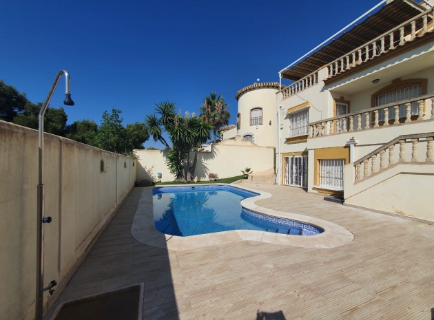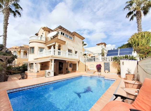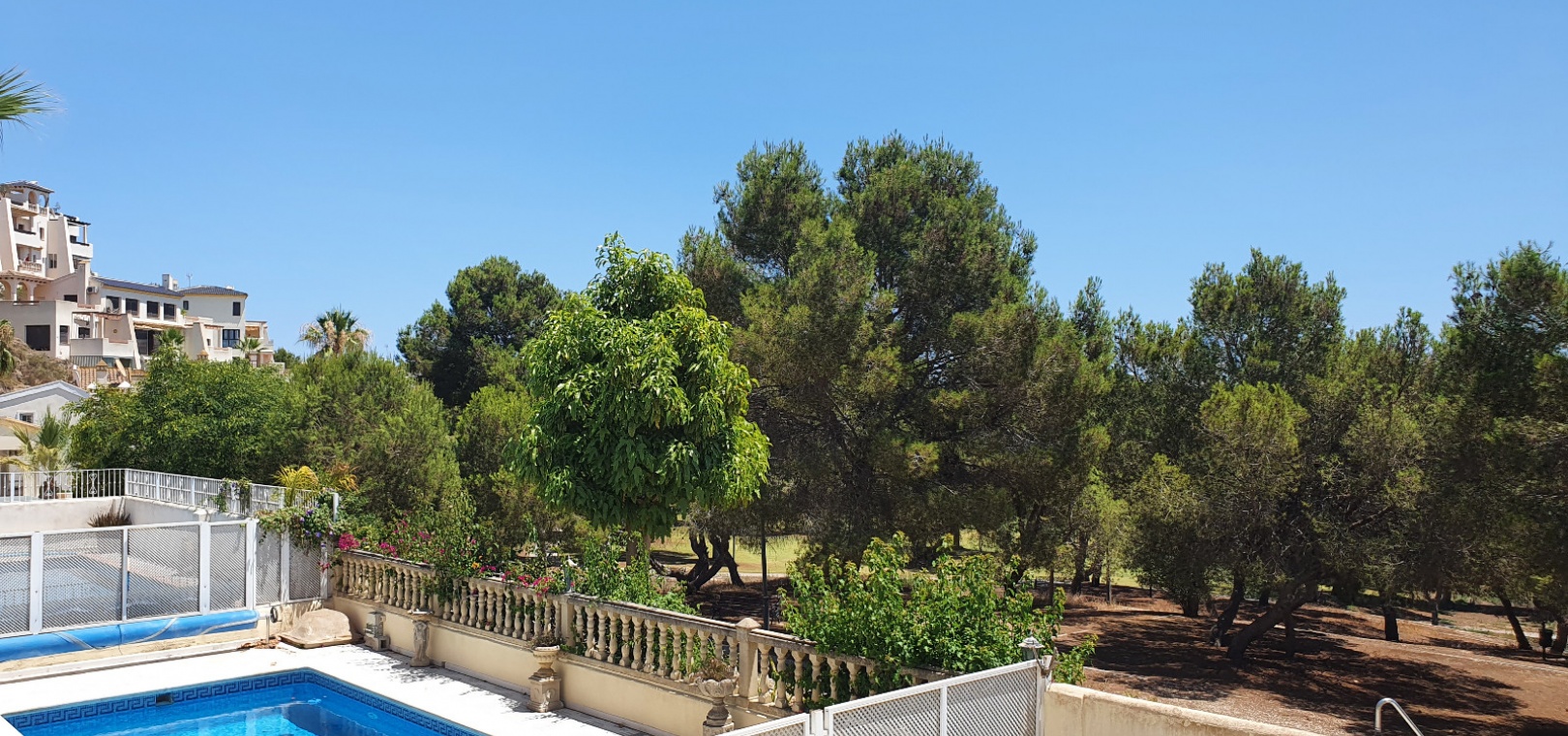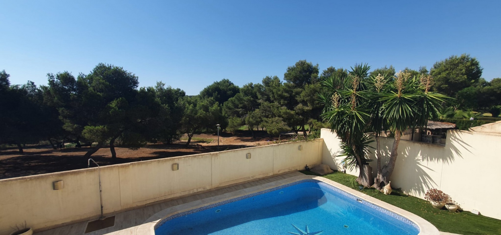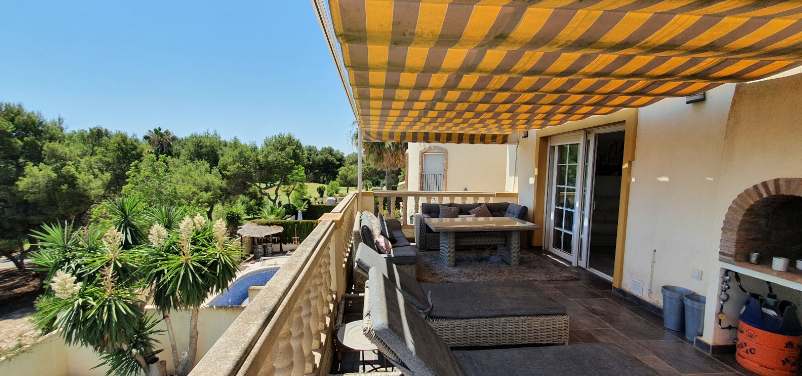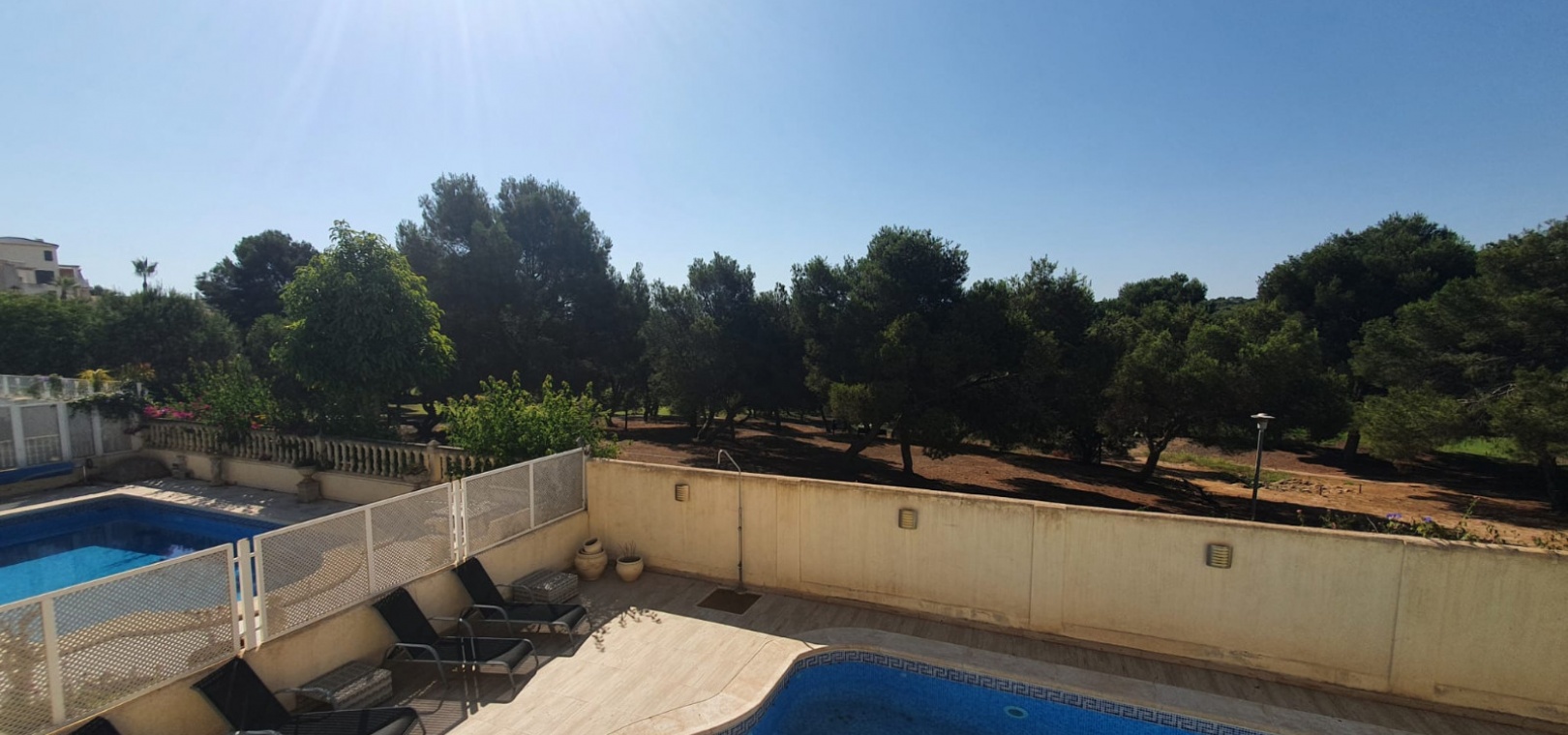 En fristående villa med 5 bäddar och 3,5 badrum med privat pool 1:a raden till den vackra golfbanan Las Ramblas, Villamartin, Costa Blanca South. Denna rymliga fastighet av hög kvalitet bjuds ut till försäljning i gott skick, delvis möblerad och består mycket kortfattat av följande:- Belägen på en lugn återvändsgränd, ligger denna villa på en stor tomt med lågt underhåll. In genom gångporten till vänster är en uppfart med plats för flera bilar och tillgång till det helt slutna garaget. På bottenvåningen finns 3 x dubbelrum med inbyggda garderober, det största sovrummet har ett eget badrum och altandörrar som tar dig ner till poolområdet. Det finns också ett familjebadrum. Interna trappor tar dig upp till första våningen där det finns ett mycket rymligt och ljust vardagsrum/matsal med en öppen spis och altandörrar som leder vidare till den stora bakre balkongen med en solmarkis och fantastisk utsikt. Från balkongen finns det trappsteg upp till ett litet solarium på taket. Det finns också altandörrar som leder ut till den främre balkongen. Det finns också en dörr som öppnar upp till trappsteg som tar dig ner till poolområdet. På första våningen hittar du också ett rymligt fullt utrustat oberoende kök och ett grovkök / förråd med toalett. Det finns en stor fristående källare med en lounge, ett öppet kök, 2 x dubbelrum, 1 x duschrum och ett förråd. Utanför fastigheten finns en stor tomt med en stor kaklad terrass runt den stora privata poolen. Från terrassen runt poolen kan du nå garaget och ett litet underbyggt förråd. Denna fastighet har gas centralvärme. Denna härliga fastighet ligger bara några minuter från klubbhuset och restaurangen och mindre än 20 minuters promenad från La Fuentes kommersiella centrum där du hittar många barer och restauranger, snabbköp, apotek, banker, en taxistation och den lokala busshållplatsen. De gyllene stränderna Orihuela Costa ligger mindre än 10 minuters bilresa bort, liksom köpcentret Zenia Boulevard. Alicantes flygplats ligger 50 minuters bilresa bort och Murcia Corvera flygplats ligger 35 minuters bilresa bort.