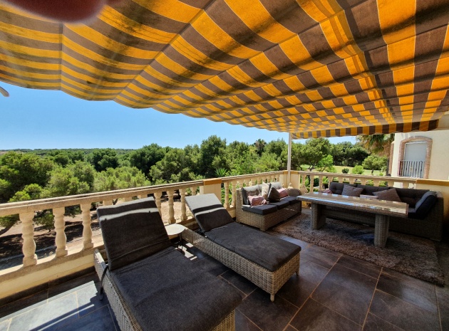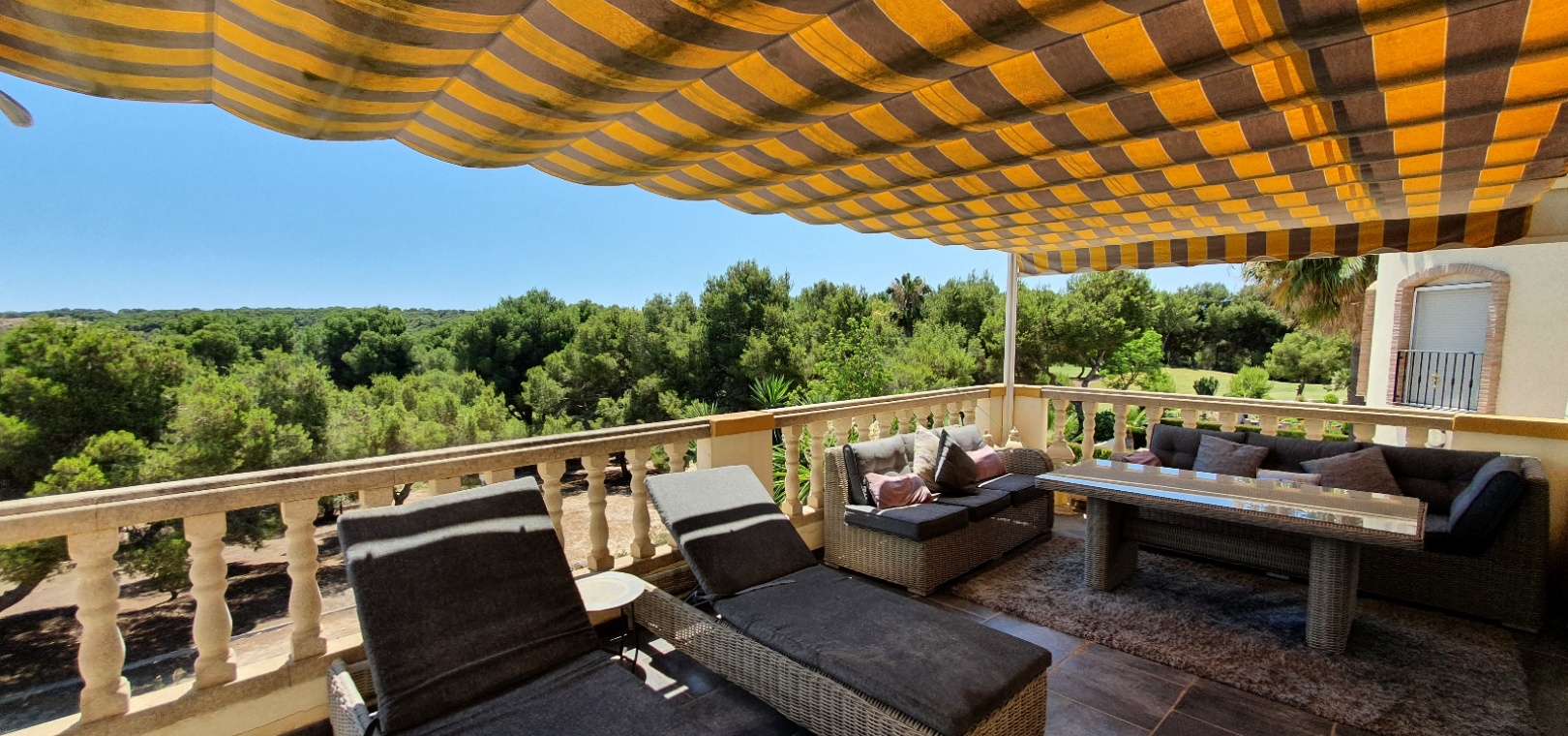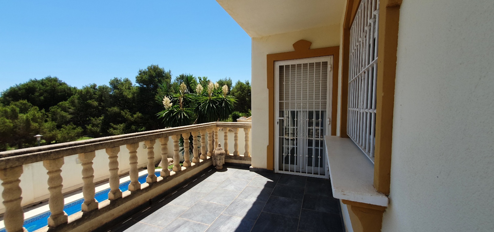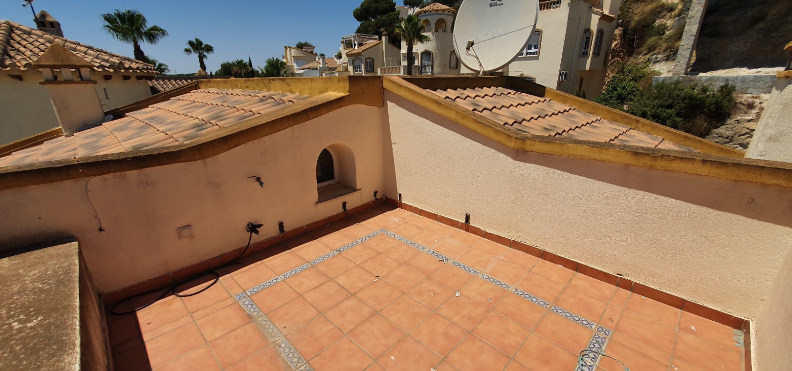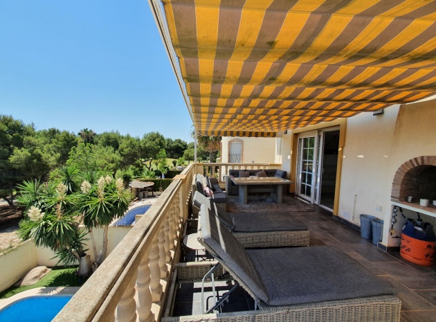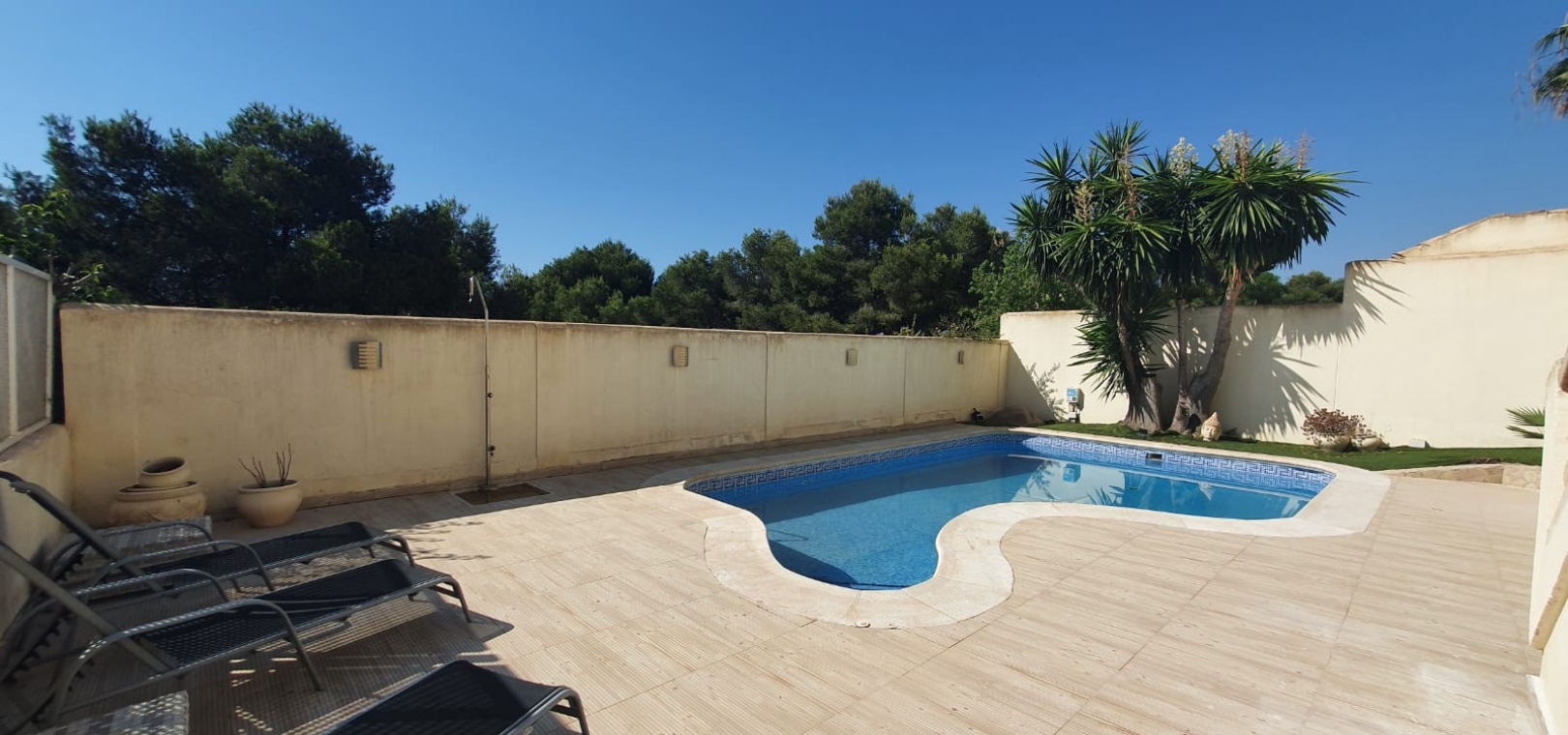 En fristående villa med 5 bäddar och 3,5 badrum med privat pool 1:a raden till den vackra golfbanan Las Ramblas, Villamartin, Costa Blanca South. Denna rymliga fastighet av hög kvalitet bjuds ut till försäljning i gott skick, delvis möblerad och består mycket kortfattat av följande:- Belägen på en lugn återvändsgränd, ligger denna villa på en stor tomt med lågt underhåll. In genom gångporten till vänster är en uppfart med plats för flera bilar och tillgång till det helt slutna garaget. På bottenvåningen finns 3 x dubbelrum med inbyggda garderober, det största sovrummet har ett eget badrum och altandörrar som tar dig ner till poolområdet. Det finns också ett familjebadrum. Interna trappor tar dig upp till första våningen där det finns ett mycket rymligt och ljust vardagsrum/matsal med en öppen spis och altandörrar som leder vidare till den stora bakre balkongen med en solmarkis och fantastisk utsikt. Från balkongen finns det trappsteg upp till ett litet solarium på taket. Det finns också altandörrar som leder ut till den främre balkongen. Det finns också en dörr som öppnar upp till trappsteg som tar dig ner till poolområdet. På första våningen hittar du också ett rymligt fullt utrustat oberoende kök och ett grovkök / förråd med toalett. Det finns en stor fristående källare med en lounge, ett öppet kök, 2 x dubbelrum, 1 x duschrum och ett förråd. Utanför fastigheten finns en stor tomt med en stor kaklad terrass runt den stora privata poolen. Från terrassen runt poolen kan du nå garaget och ett litet underbyggt förråd. Denna fastighet har gas centralvärme. Denna härliga fastighet ligger bara några minuter från klubbhuset och restaurangen och mindre än 20 minuters promenad från La Fuentes kommersiella centrum där du hittar många barer och restauranger, snabbköp, apotek, banker, en taxistation och den lokala busshållplatsen. De gyllene stränderna Orihuela Costa ligger mindre än 10 minuters bilresa bort, liksom köpcentret Zenia Boulevard. Alicantes flygplats ligger 50 minuters bilresa bort och Murcia Corvera flygplats ligger 35 minuters bilresa bort.