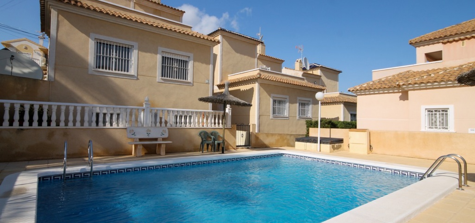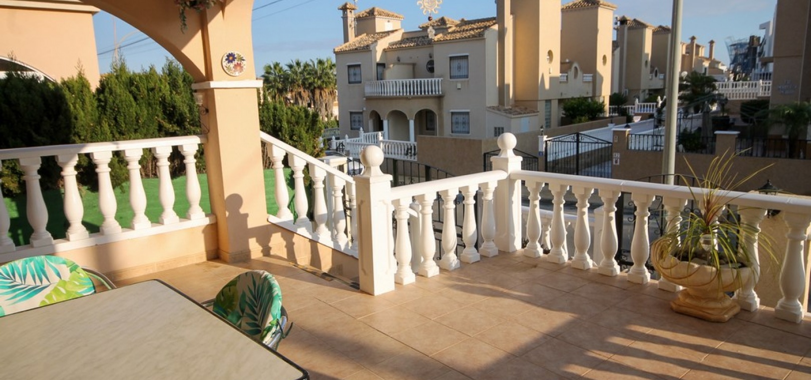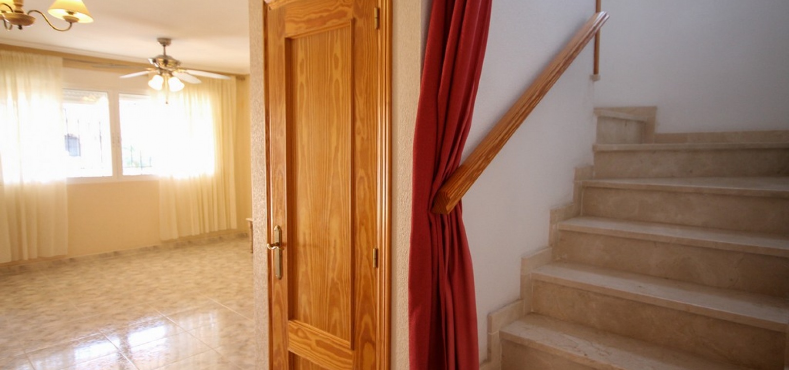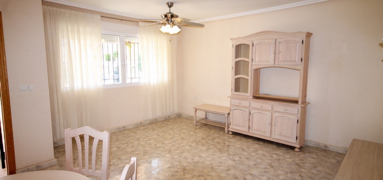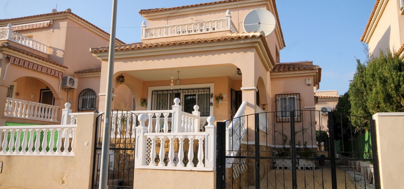 En fristående villa med 3 sovrum och 2 badrum i söderläge i El Galan, Villamartin, Costa Blanca. Denna rymliga fastighet ligger i ett litet samhälle med bara 12 villor, bjuds ut till försäljning i gott skick men behöver lite TLC, säljs delvis möblerad och består mycket kortfattat av följande: - På bottenvåningen finns en lounge/matsal, kök i öppen planlösning, under trappskåp, 2 x dubbelrum med inbyggda garderober och 1 x duschrum. På första våningen finns det största sovrummet med inbyggda garderober, ett eget badrum och en privat balkong, det finns också en balkong på baksidan. Utanför finns en terrass på framsidan, trädgård med lågt underhåll med uppfart för off-road parkering, gemensam simning och mycket mer. Denna fastighet ligger bara en kort promenad till alla bekvämligheter, 5 minuter med bil till stranden La Zenia eller så kan du hoppa på lokalbussen, Mindre än 5 minuter med bil till 4 golfbanor och 50 minuter till Alicantes flygplats.