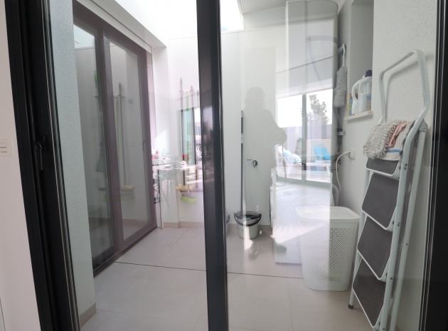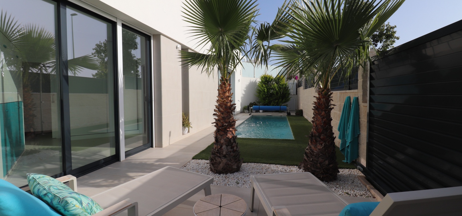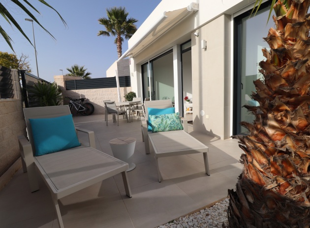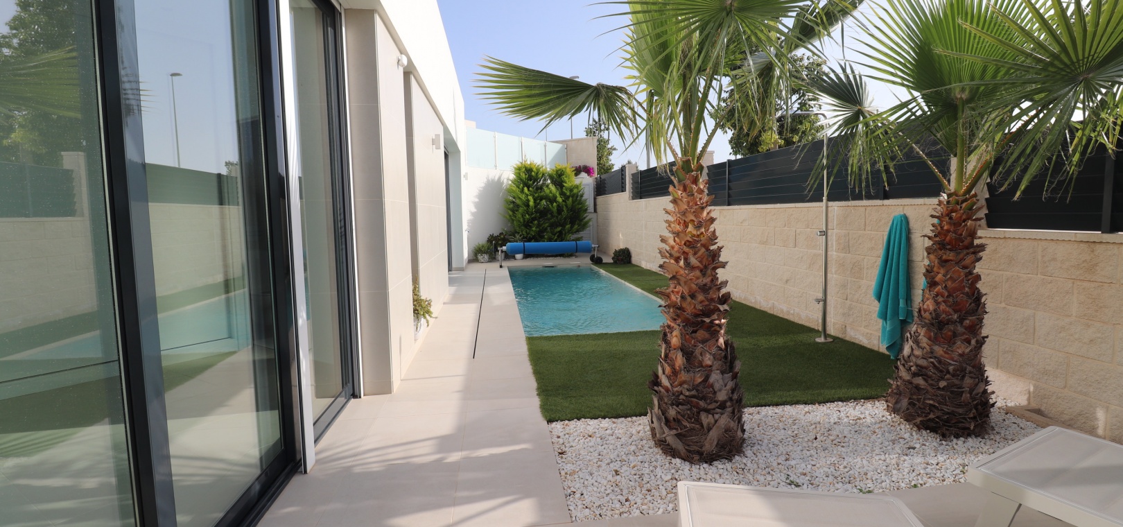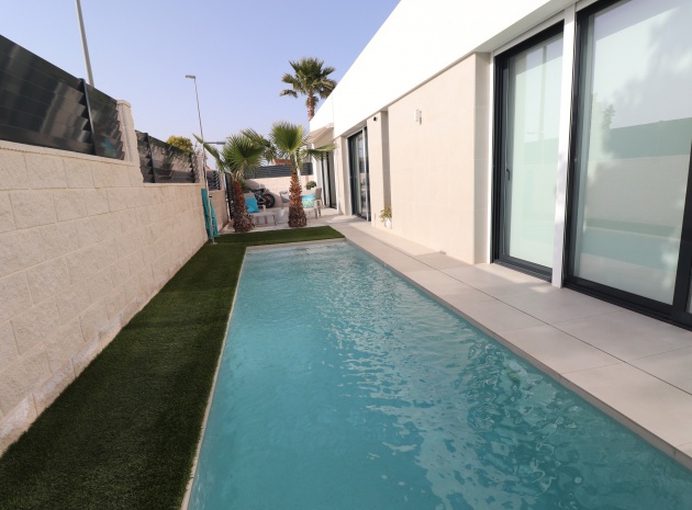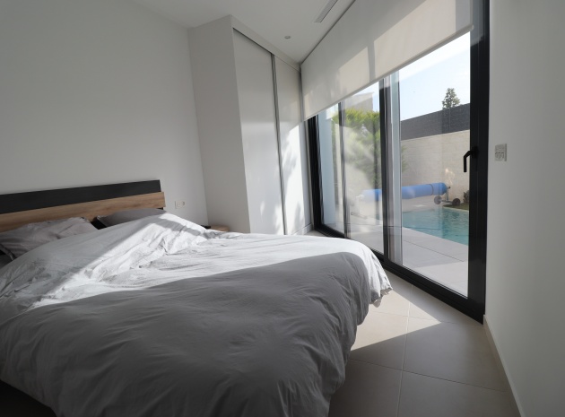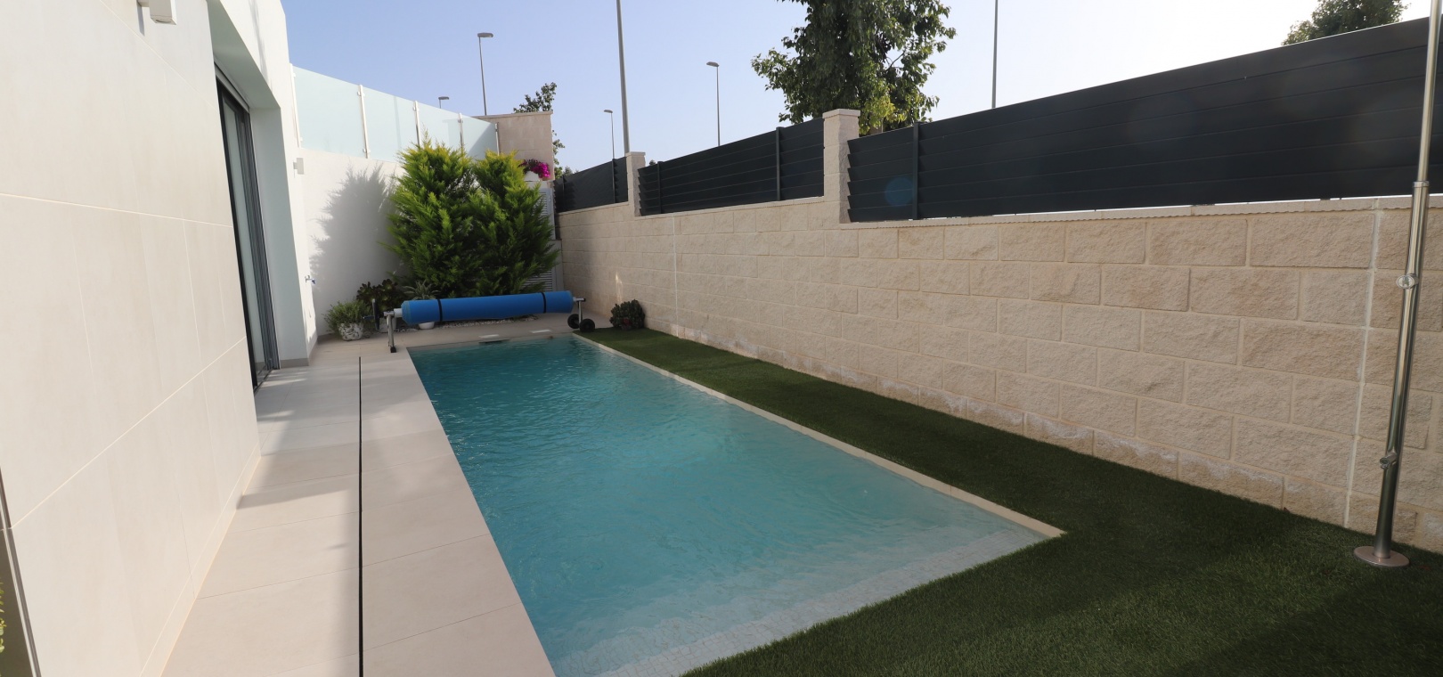 Denna egendomliga, moderna, sydvästläge, fristående villa med tre sovrum i Benijofar ligger bara några minuters promenad till huvudgatan och centrum, med alla dess bekvämligheter + faciliteter... Beläget i Benijofar själv finns kommersiella centra, med en rad barer, restauranger, affärer, bagerier, banker, apotek och mycket mer... De vackra blåflaggade stränderna i Guardamar del Segura ligger också bara 12 minuters bilresa bort! Denna 2020 byggda fastighet är obefläckad och fantastisk, med en ovanlig, men ändå attraktiv design, bestående av ett fullt utrustat kök med öppen planlösning; vardagsrum/matsal med skjutdörrar ut till fronten soldränkt terrass, trädgård och pool; två dubbelrum med tillgång till en innergård och verktyg/förråd; ett tredje dubbelrum med eget badrum och direkt tillgång till de vackra trädgårdarna på framsidan; och ett familjeduschrum. Utanför finns en anlagd trädgård med kakel, konstgräs, palmer och privat, uppvärmd pool på 2,2 x 7 m, plus möjligheten till en parkeringsplats utanför vägen via den elektriska grinden. Extra med den här egenskapen är att inkludera hopfällbara sängar i varje sovrum för extra utrymme när du inte sover, luftkonditionering överallt, persienner med fjärrkontroll, 120 liters varmvattenpanna, bevattning i trädgården, larmsystem och inte att förglömma 8 x Solar paneler!
