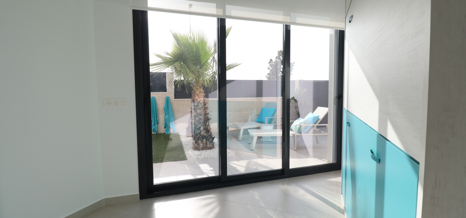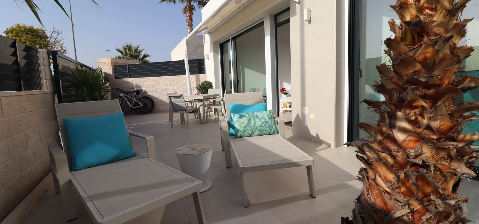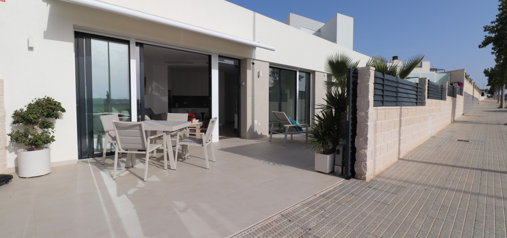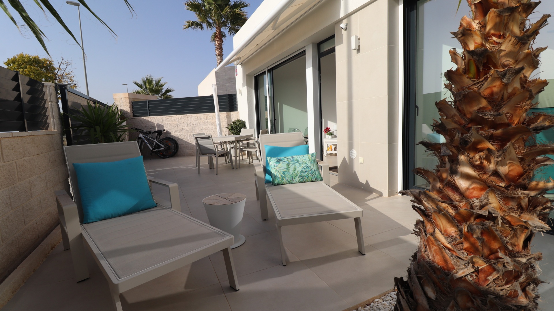 Denna egendomliga, moderna, sydvästläge, fristående villa med tre sovrum i Benijofar ligger bara några minuters promenad till huvudgatan och centrum, med alla dess bekvämligheter + faciliteter... Beläget i Benijofar själv finns kommersiella centra, med en rad barer, restauranger, affärer, bagerier, banker, apotek och mycket mer... De vackra blåflaggade stränderna i Guardamar del Segura ligger också bara 12 minuters bilresa bort! Denna 2020 byggda fastighet är obefläckad och fantastisk, med en ovanlig, men ändå attraktiv design, bestående av ett fullt utrustat kök med öppen planlösning; vardagsrum/matsal med skjutdörrar ut till fronten soldränkt terrass, trädgård och pool; två dubbelrum med tillgång till en innergård och verktyg/förråd; ett tredje dubbelrum med eget badrum och direkt tillgång till de vackra trädgårdarna på framsidan; och ett familjeduschrum. Utanför finns en anlagd trädgård med kakel, konstgräs, palmer och privat, uppvärmd pool på 2,2 x 7 m, plus möjligheten till en parkeringsplats utanför vägen via den elektriska grinden. Extra med den här egenskapen är att inkludera hopfällbara sängar i varje sovrum för extra utrymme när du inte sover, luftkonditionering överallt, persienner med fjärrkontroll, 120 liters varmvattenpanna, bevattning i trädgården, larmsystem och inte att förglömma 8 x Solar paneler!