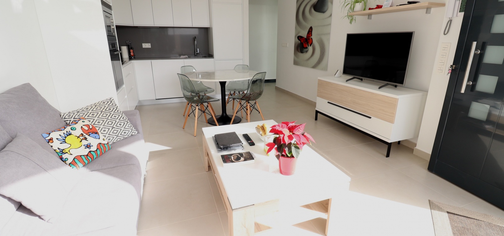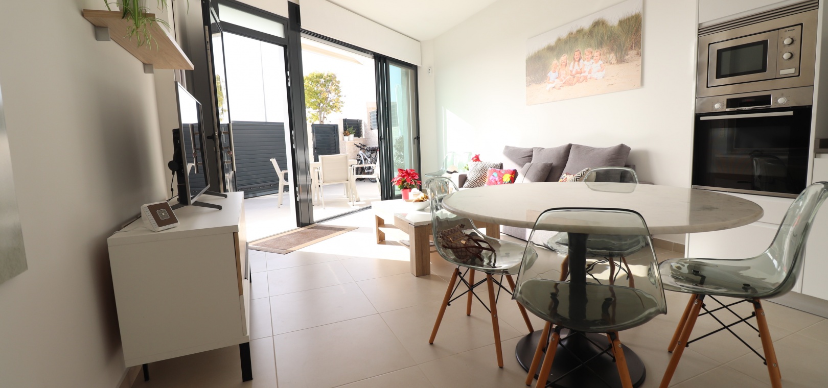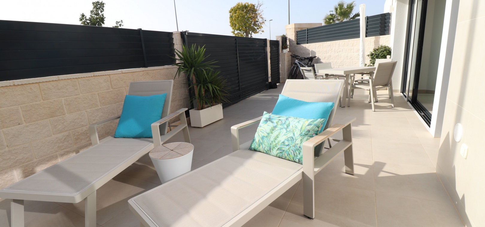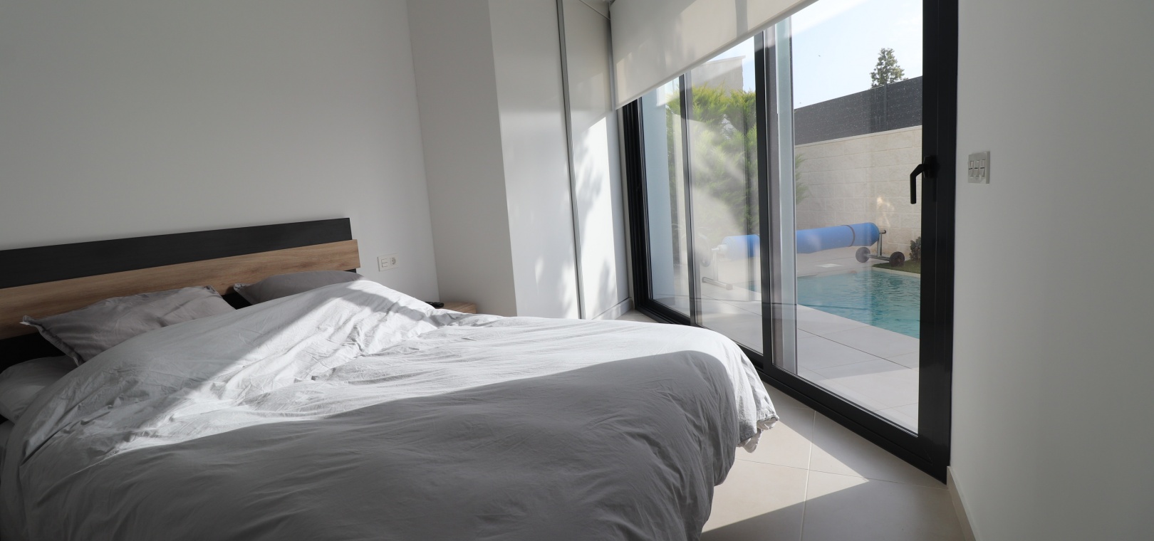 Denna egendomliga, moderna, sydvästläge, fristående villa med tre sovrum i Benijofar ligger bara några minuters promenad till huvudgatan och centrum, med alla dess bekvämligheter + faciliteter... Beläget i Benijofar själv finns kommersiella centra, med en rad barer, restauranger, affärer, bagerier, banker, apotek och mycket mer... De vackra blåflaggade stränderna i Guardamar del Segura ligger också bara 12 minuters bilresa bort! Denna 2020 byggda fastighet är obefläckad och fantastisk, med en ovanlig, men ändå attraktiv design, bestående av ett fullt utrustat kök med öppen planlösning; vardagsrum/matsal med skjutdörrar ut till fronten soldränkt terrass, trädgård och pool; två dubbelrum med tillgång till en innergård och verktyg/förråd; ett tredje dubbelrum med eget badrum och direkt tillgång till de vackra trädgårdarna på framsidan; och ett familjeduschrum. Utanför finns en anlagd trädgård med kakel, konstgräs, palmer och privat, uppvärmd pool på 2,2 x 7 m, plus möjligheten till en parkeringsplats utanför vägen via den elektriska grinden. Extra med den här egenskapen är att inkludera hopfällbara sängar i varje sovrum för extra utrymme när du inte sover, luftkonditionering överallt, persienner med fjärrkontroll, 120 liters varmvattenpanna, bevattning i trädgården, larmsystem och inte att förglömma 8 x Solar paneler!