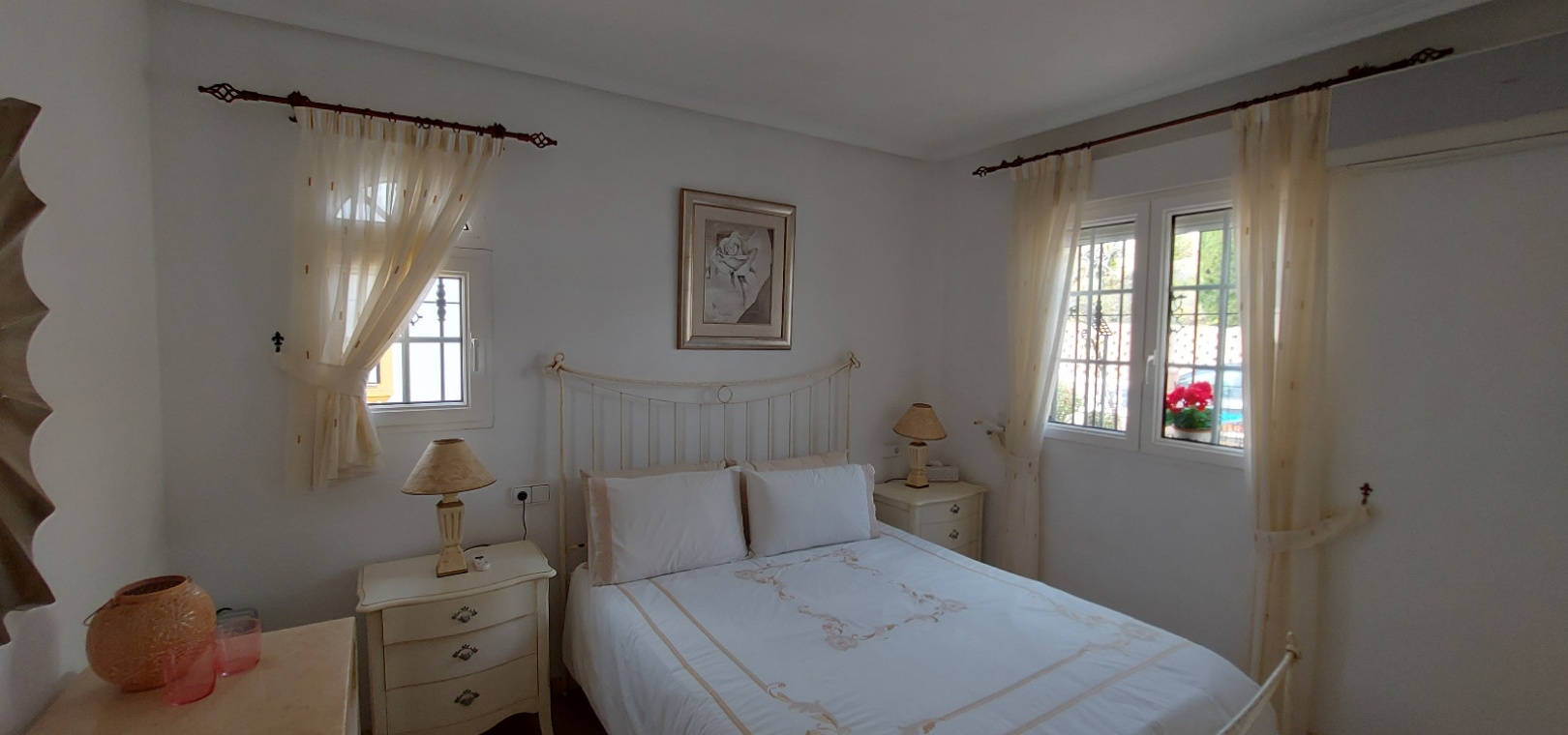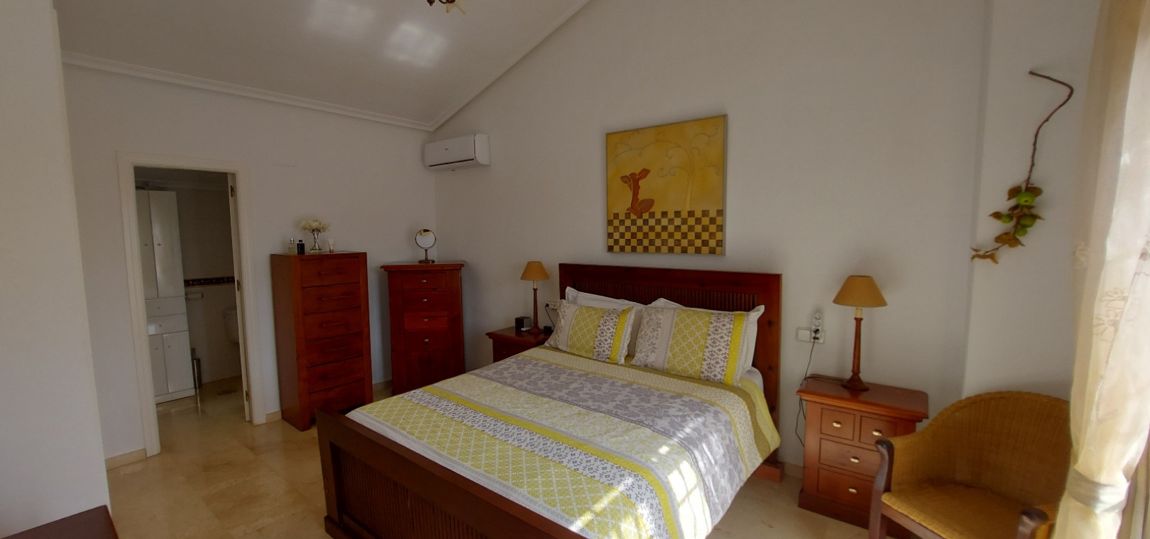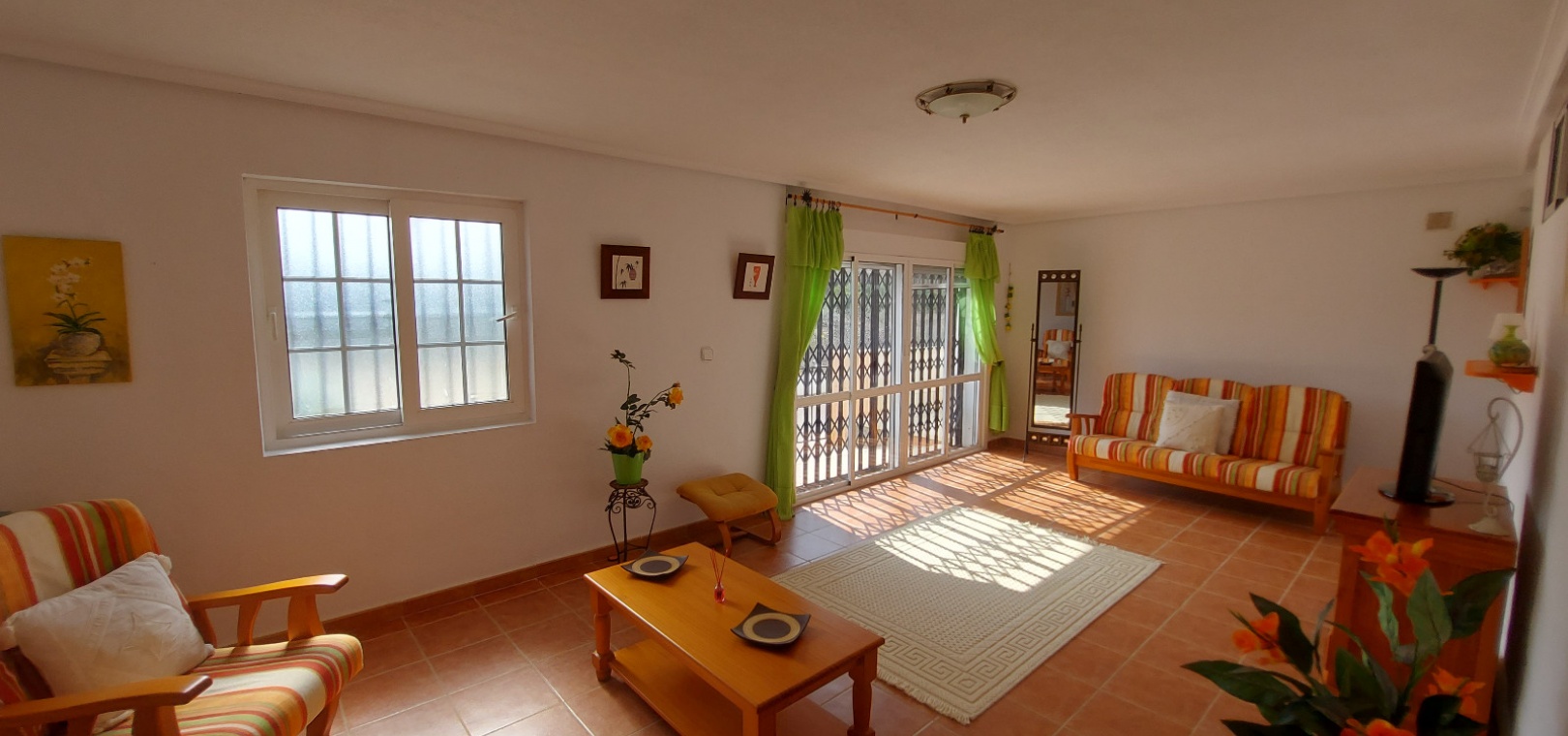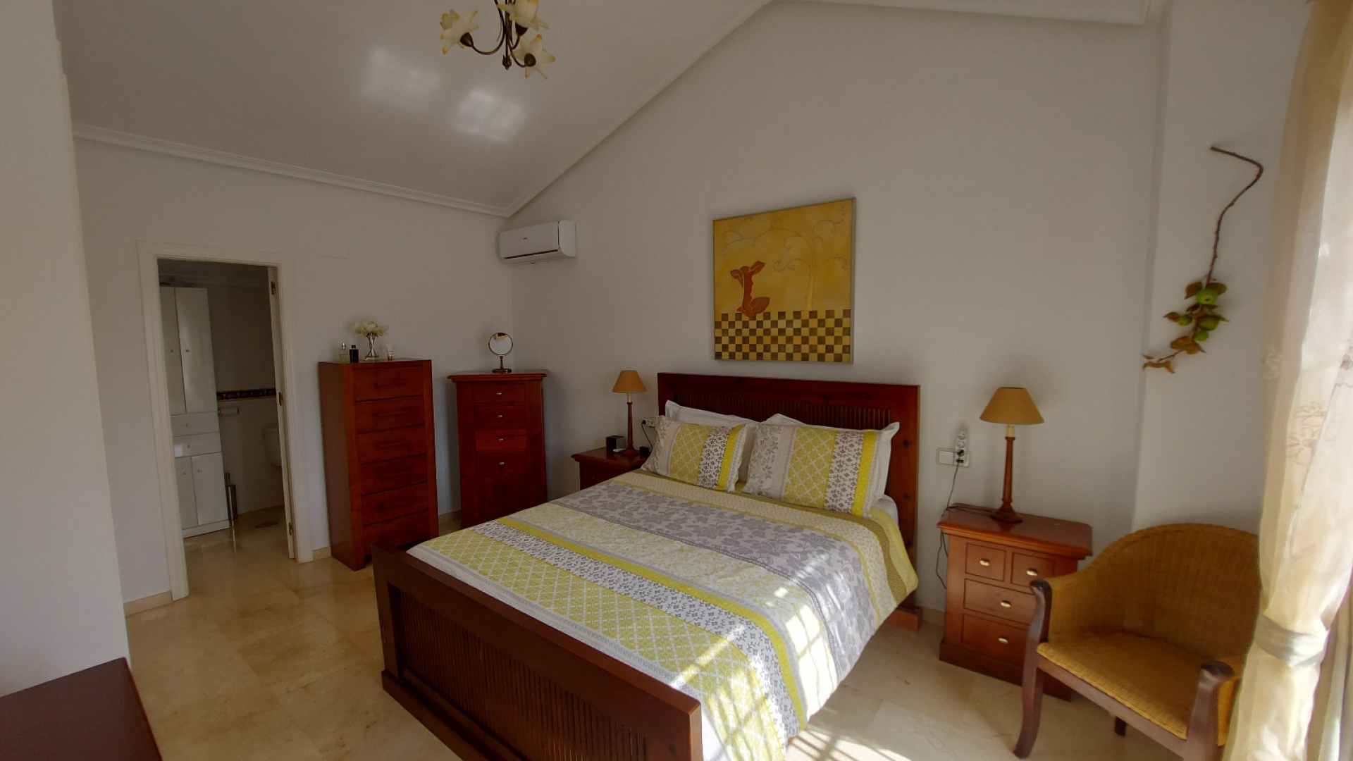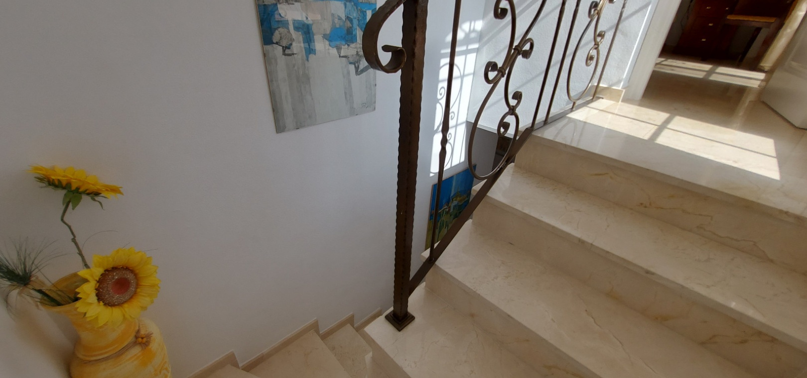 Från det stora sovrummet och även från trappavsatsen finns dörrar ut till det stora och mycket soliga solariumet som har en solmarkis och härlig öppen utsikt över citronlundarna.