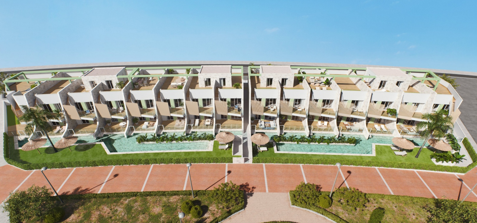 Vardagsrum/matsal, utrustat kök i amerikansk stil, 3 x dubbelrum alla med inbyggda garderober, 2 x badrum med golvvärme, terrass fram och bak eller främre balkong och solarium, alla fastigheter med utsikt över den härliga gemensamma poolen, gemensam parkeringsplats, pre installerad varm och kall A/C och mycket mycket mer.