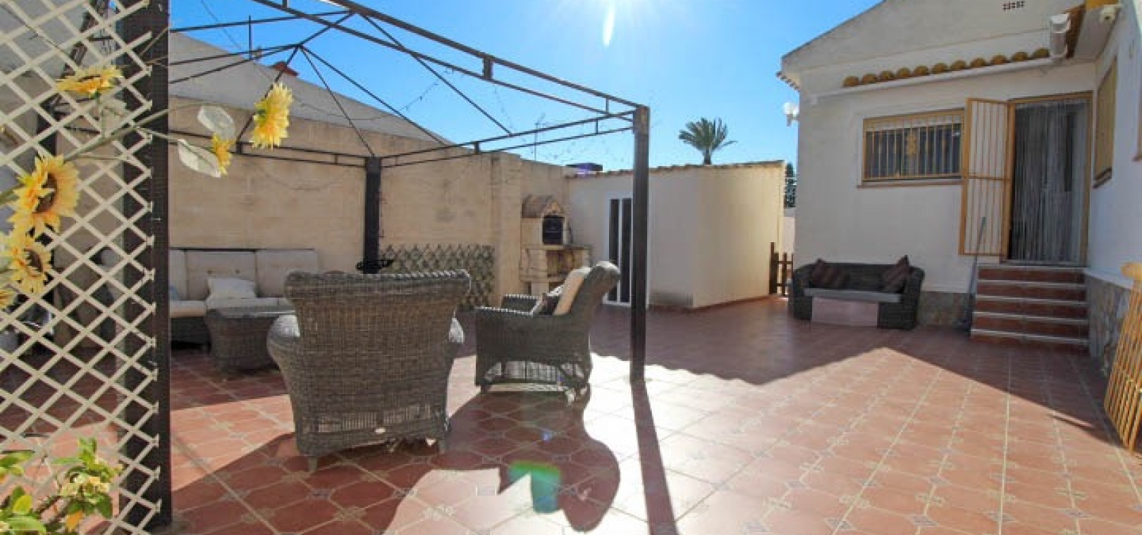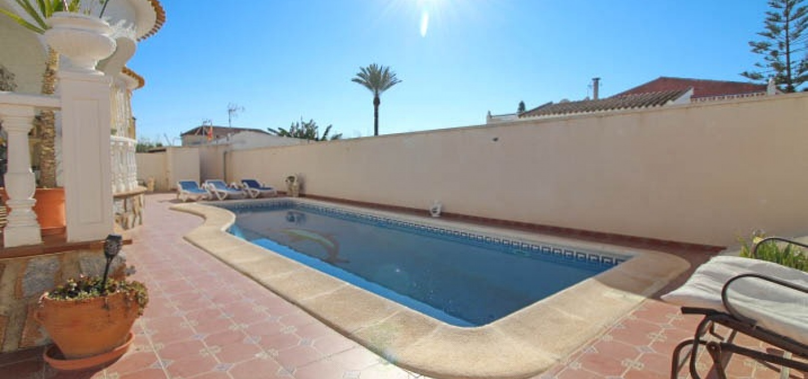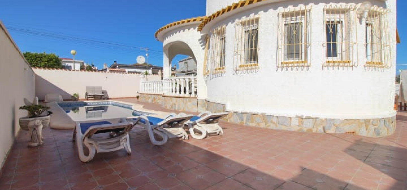 En fristående villa med 4 bäddar och 2 badrum i sydvästläge med en privat pool på en 487m2 tomt belägen i Monte Zenia, La Zenia, Costa Blanca.