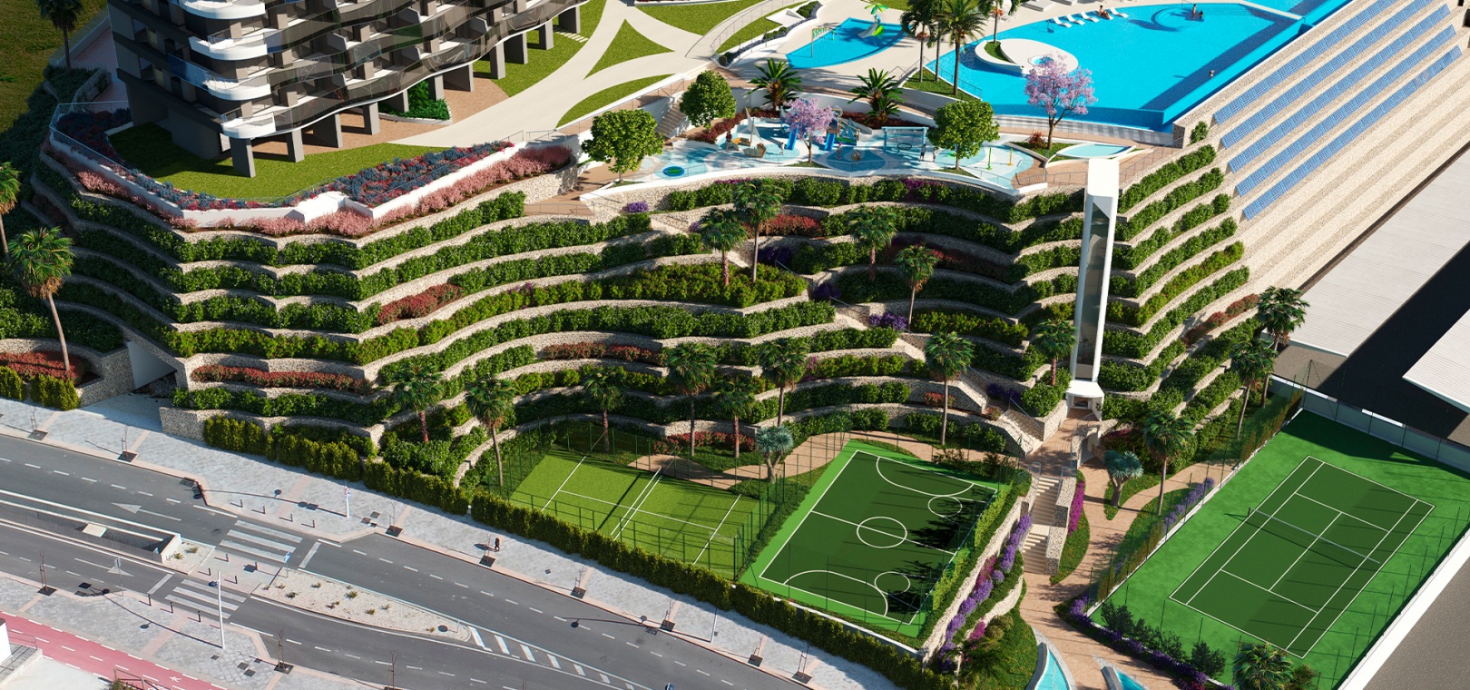 De kommer att byggas till en mycket hög kvalitet och är belägna i 2 x fantastiska torn med glasfasader på ett fantastiskt komplex beläget 2:a linjen till Medelhavet.