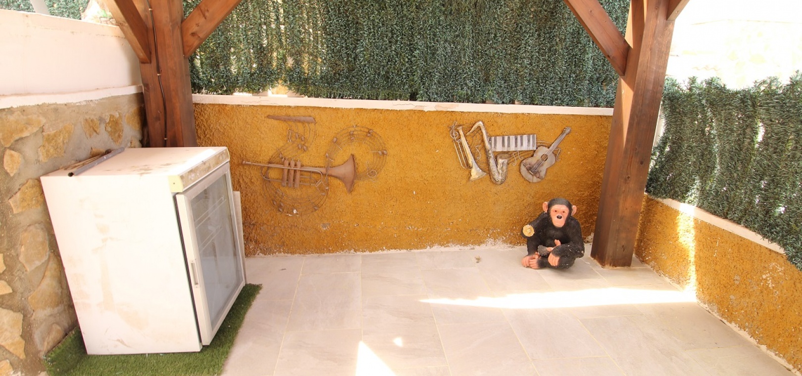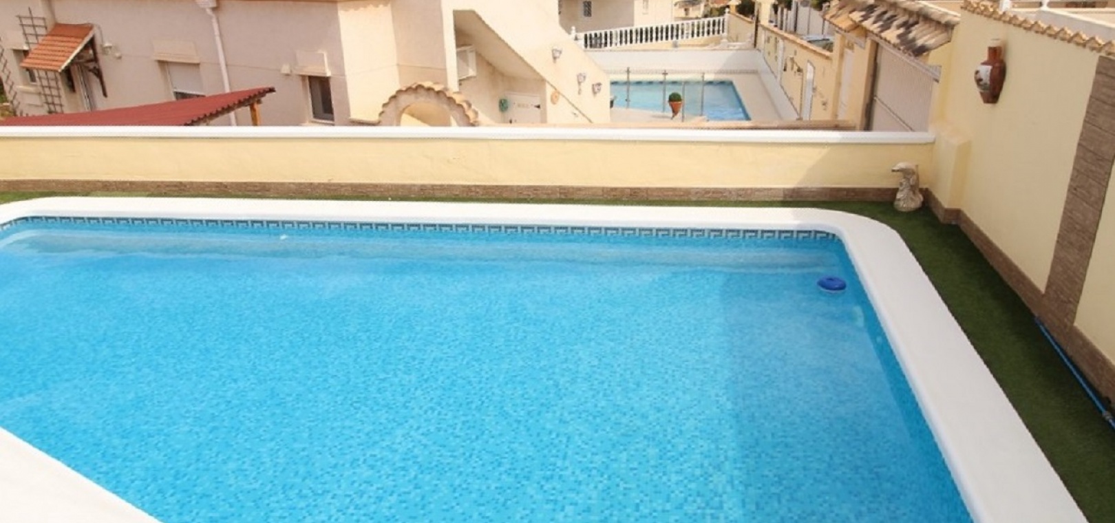 Utanför finns en 10m2 inglasad terrass/matplats, ett privat takterrass, ett förråd, en trädgård med låg underhållsnivå med en bar med en träpergola och en privat pool.