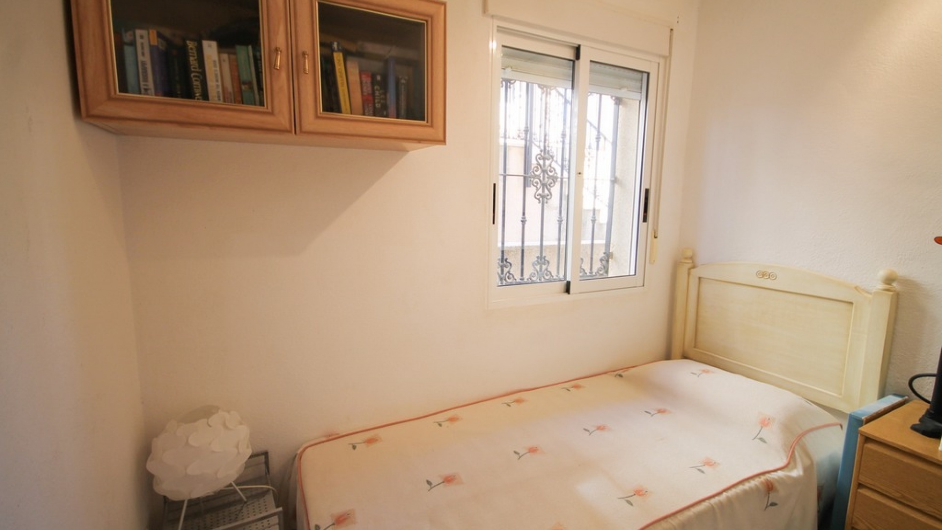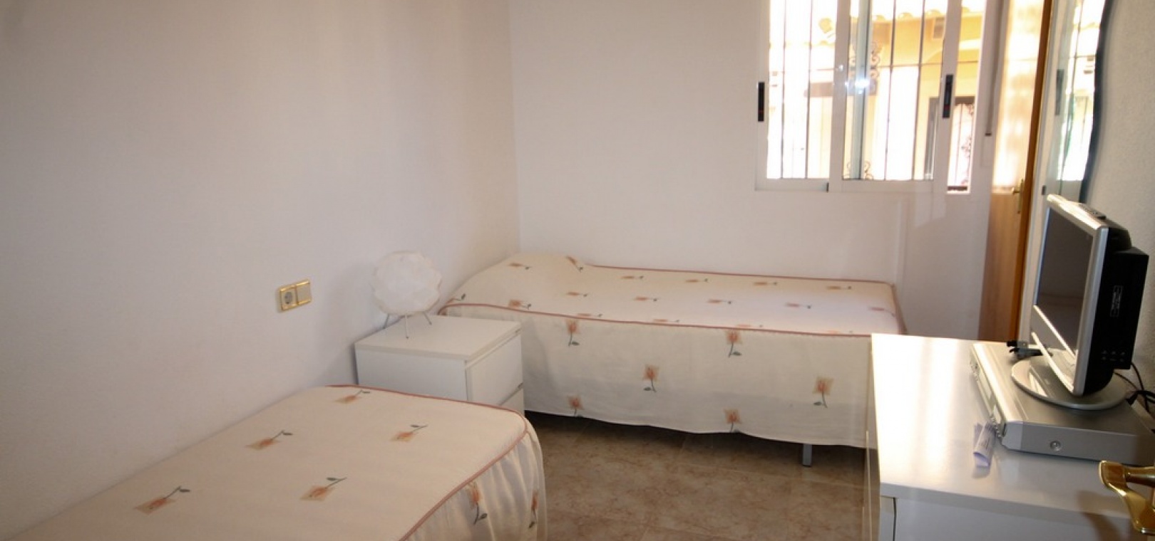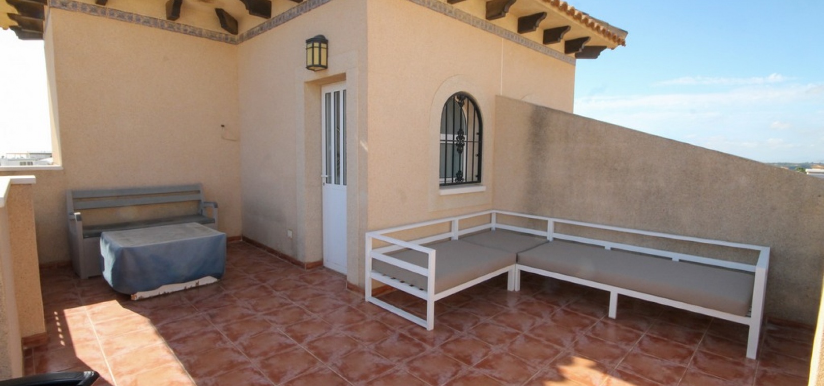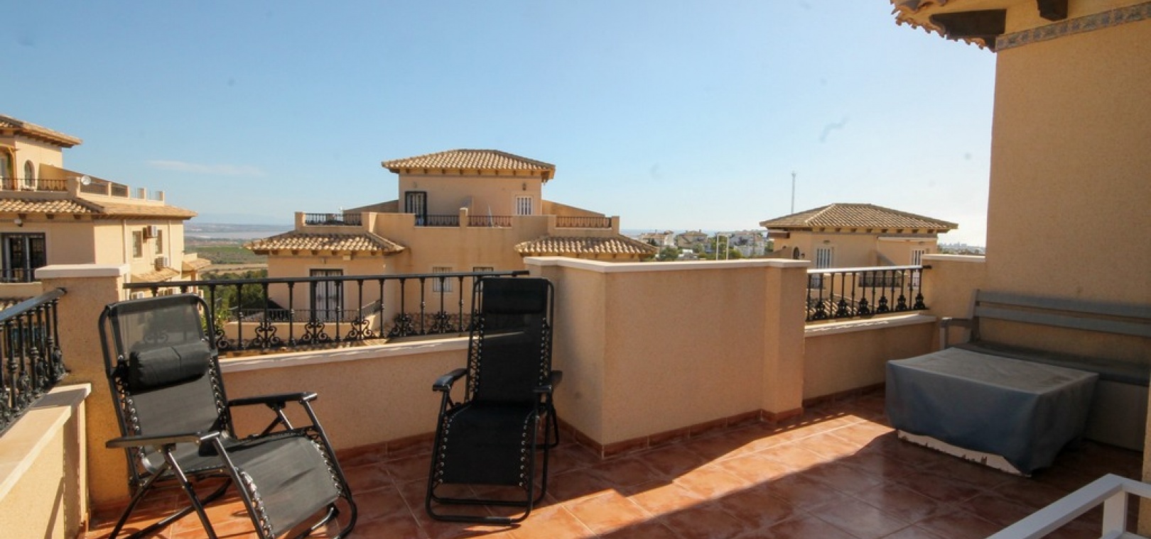 Intern trappa leder till 1: a våningen där det finns 2 x dubbelrum båda med inbyggda garderober, det största sovrummet har en privat balkong med utsikt över den gemensamma poolen och 1 x badrum. Trappor från trappavsatsen leder dig upp till det rymliga solariet på taket som har utsikt mot bergen, saltsjön och havet.