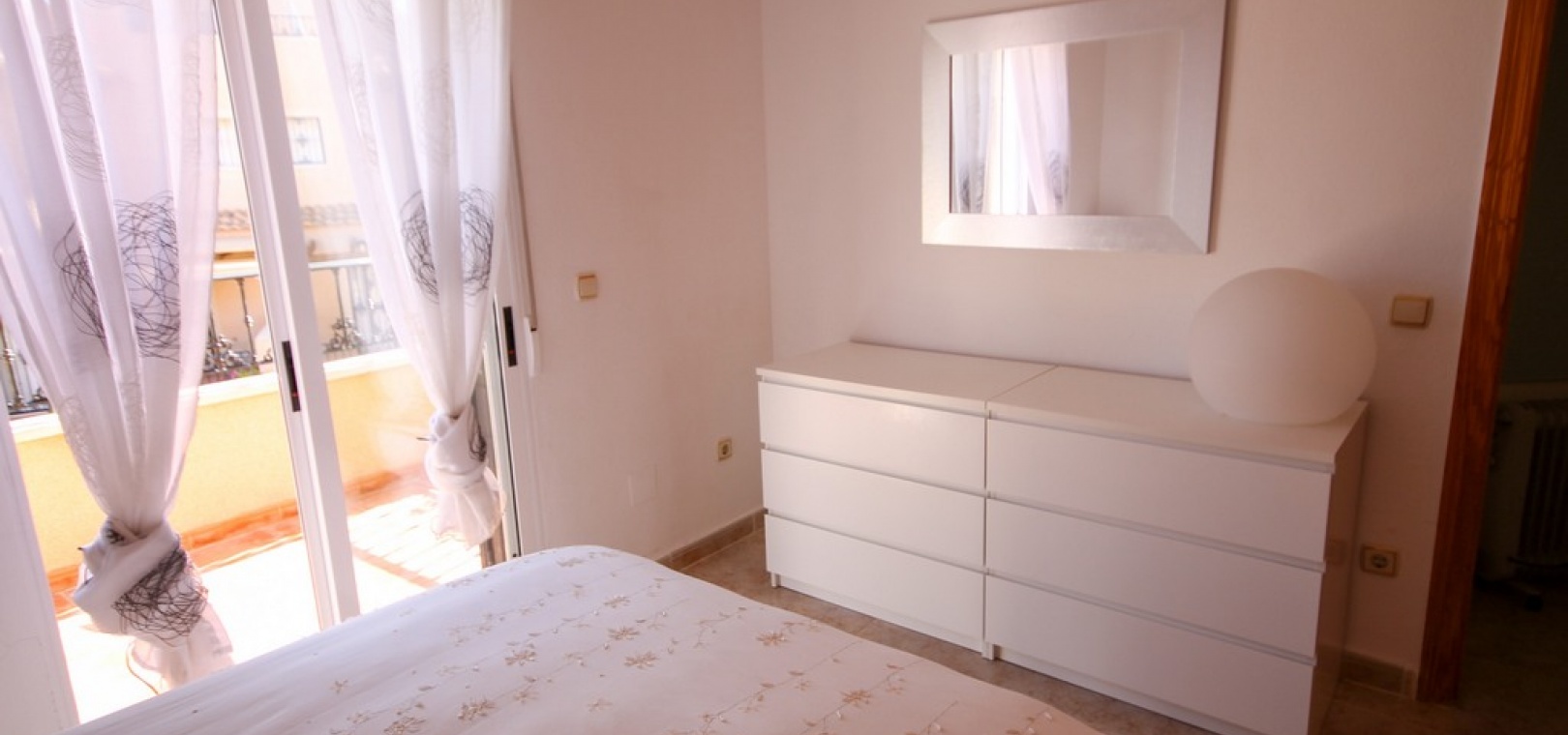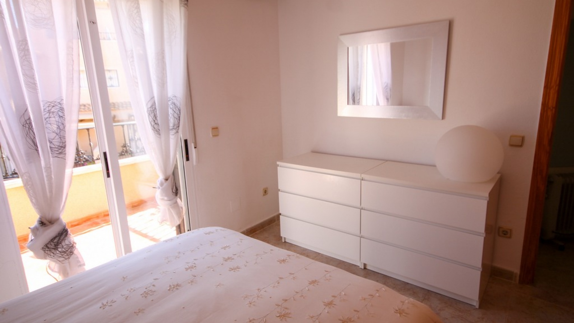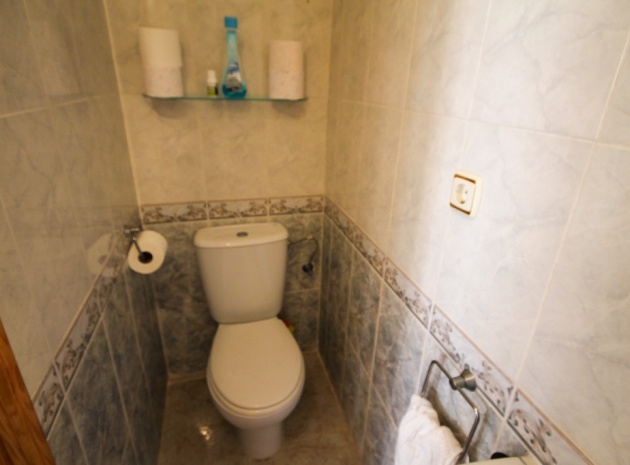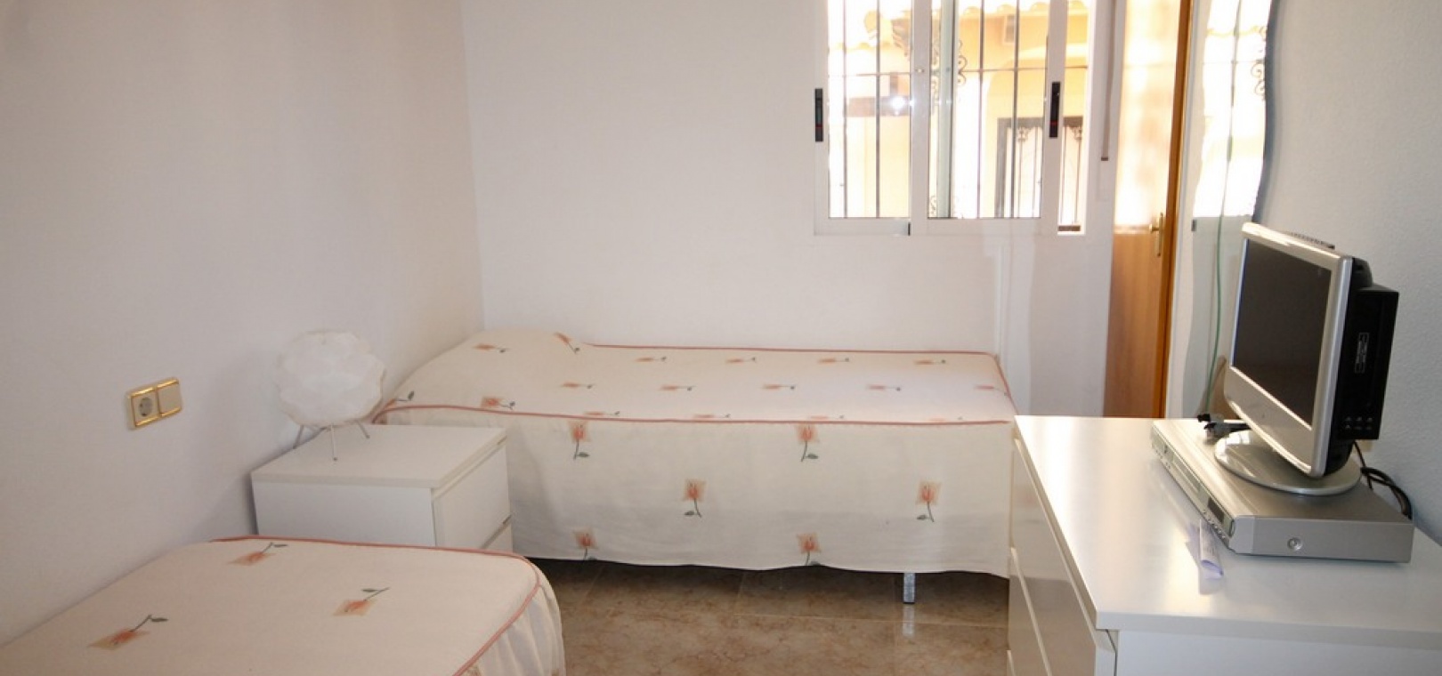 Intern trappa leder till 1: a våningen där det finns 2 x dubbelrum båda med inbyggda garderober, det största sovrummet har en privat balkong med utsikt över den gemensamma poolen och 1 x badrum. Trappor från trappavsatsen leder dig upp till det rymliga solariet på taket som har utsikt mot bergen, saltsjön och havet.