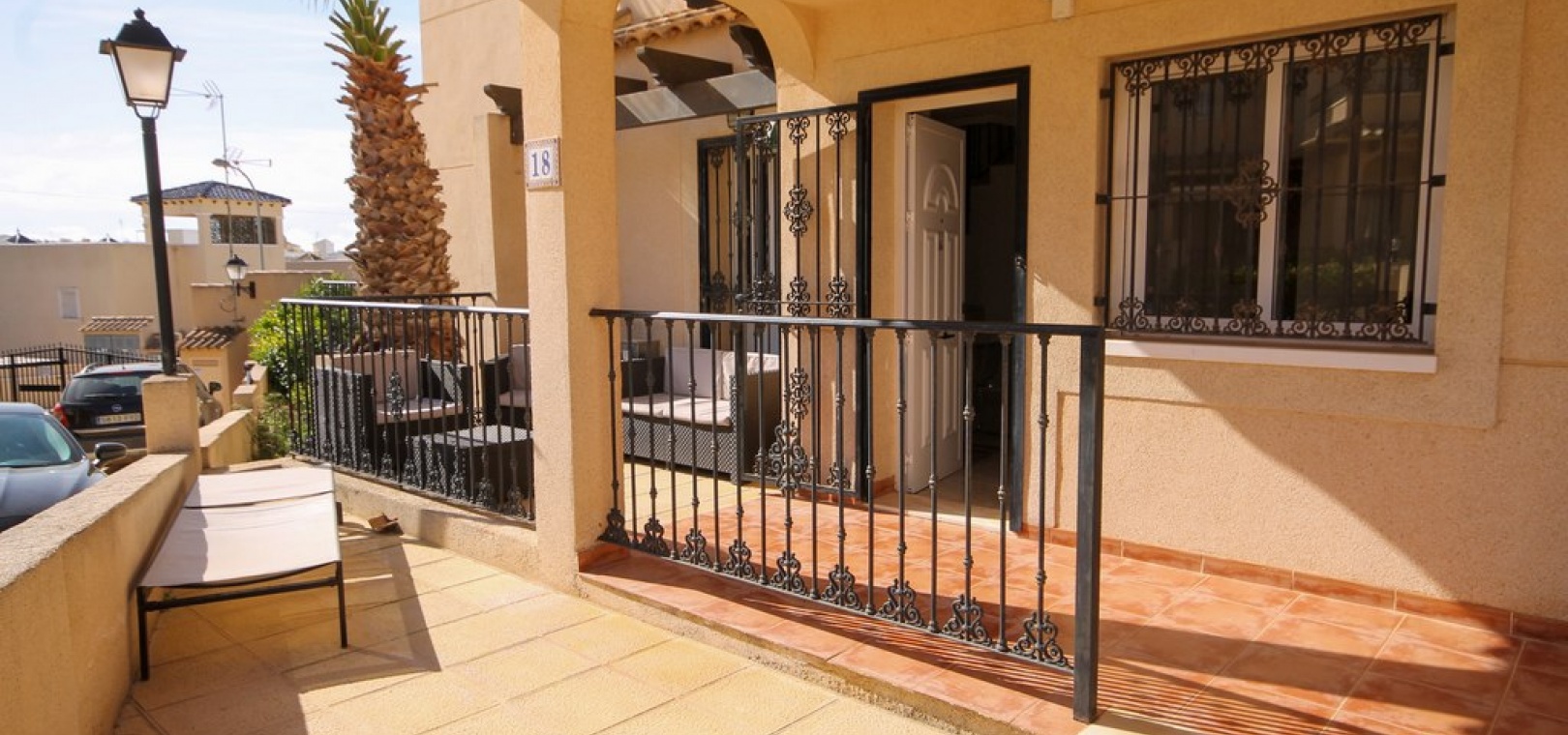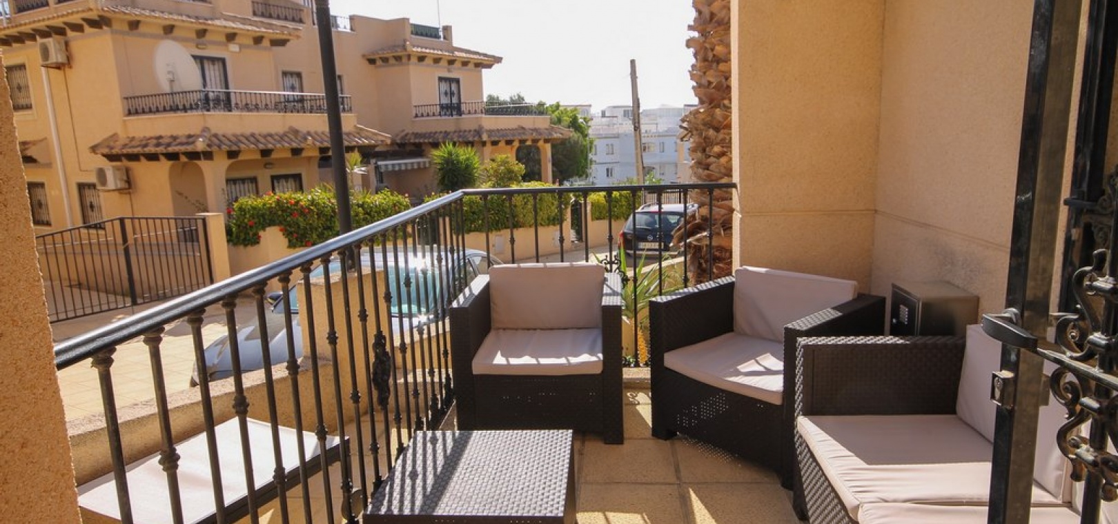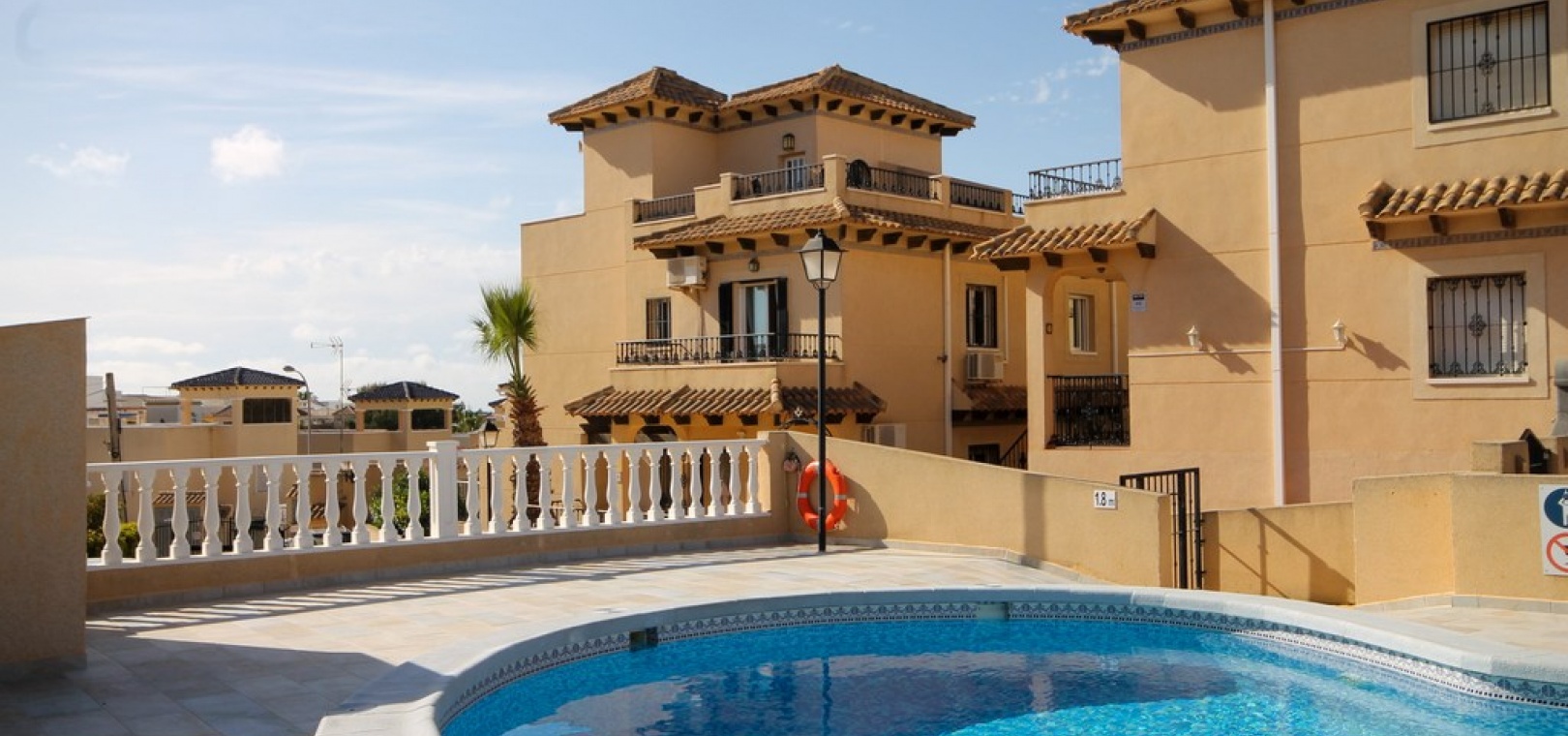 Denna fastighet har enkel tillgång till de fyra förstklassiga golfbanorna i området: Villamartin, Campoamor, Las Ramblas och Las Colinas. Stränderna Golden Orihuela Costa ligger mindre än 10 minuters bilresa bort, liksom köpcentret Zenia Boulevard (största köpcentret i Alicante-provinsen). Lokala barer, butiker, restauranger, snabbköp etc. ligger bara några minuter bort. Det finns tennisbanor och tennisträning tillgängligt på det närliggande hotellet Campoamor. Alicantes flygplats ligger 45 minuter bort och Murcia Corvera flygplats ligger 35 minuters bilresa bort.