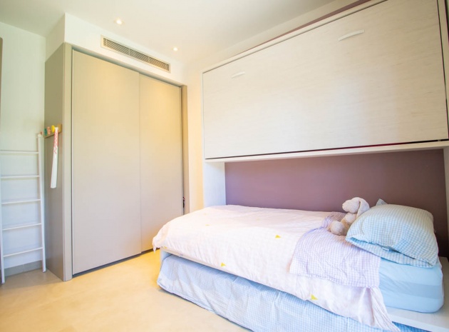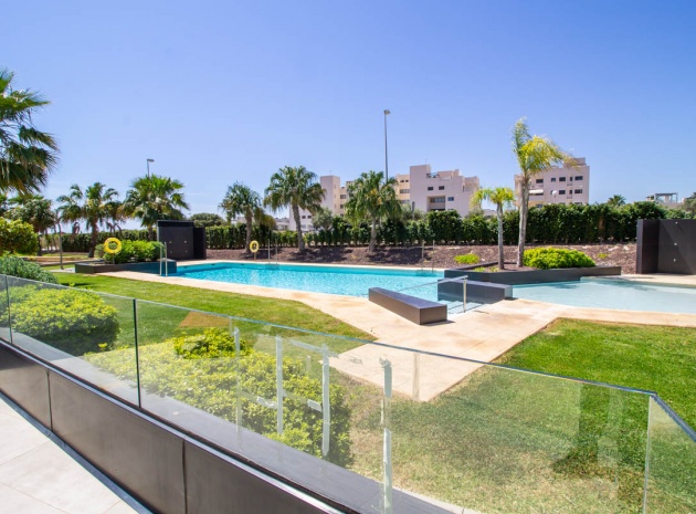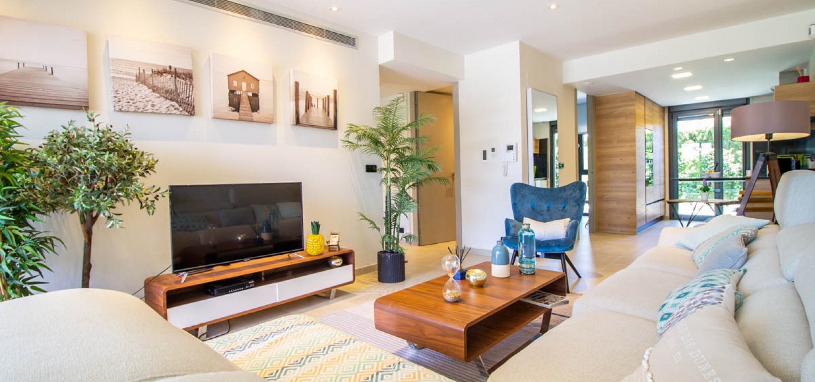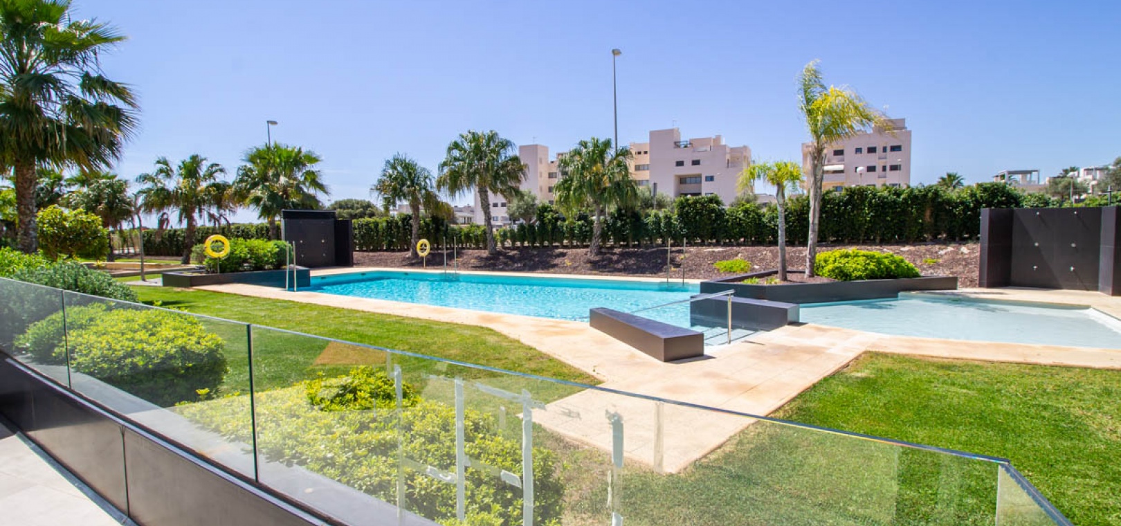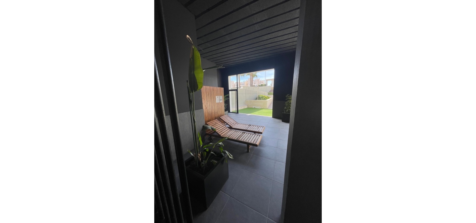 Ett stort vardagsrum/matrum med altandörrar ut till den 64m2 stora terrassen med fantastisk utsikt över den gemensamma poolen och trädgårdarna. Ett fullt utrustat kök med öppen planlösning med alla vitvaror inkluderade och ett separat bruksområde, en trädgård på 23 m2 på baksidan, 2 x stora dubbelrum med inbyggda garderober. Det största sovrummet har ett eget duschrum, 1 x gästduschrum, mycket solig 64m2 terrass med utsikt över en av de gemensamma poolerna och en underjordisk parkeringsplats med ett förråd. Det finns varm och kall A/C i alla rum.