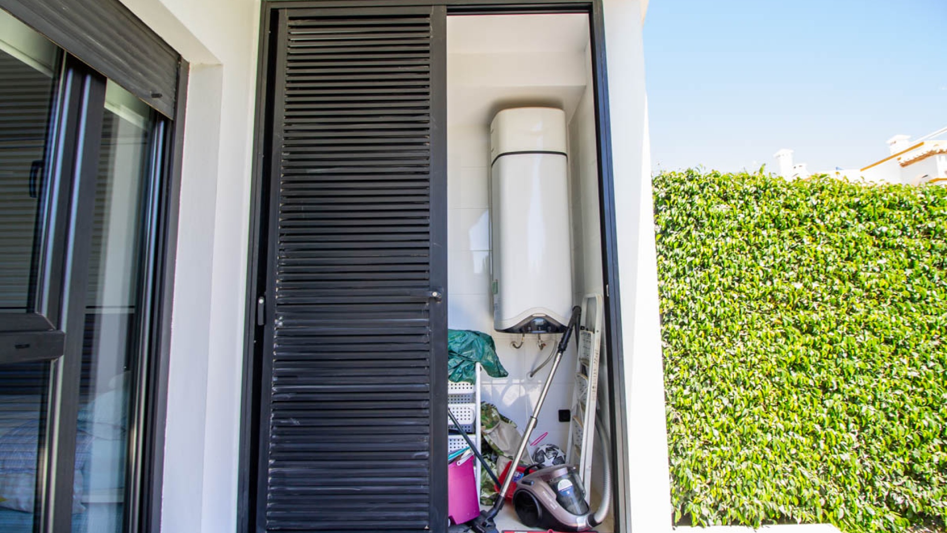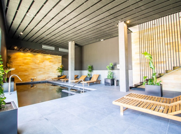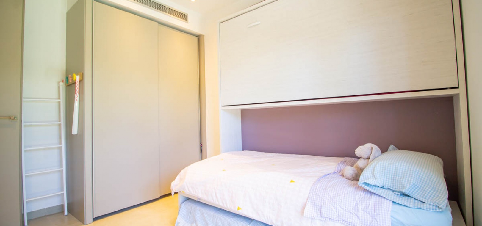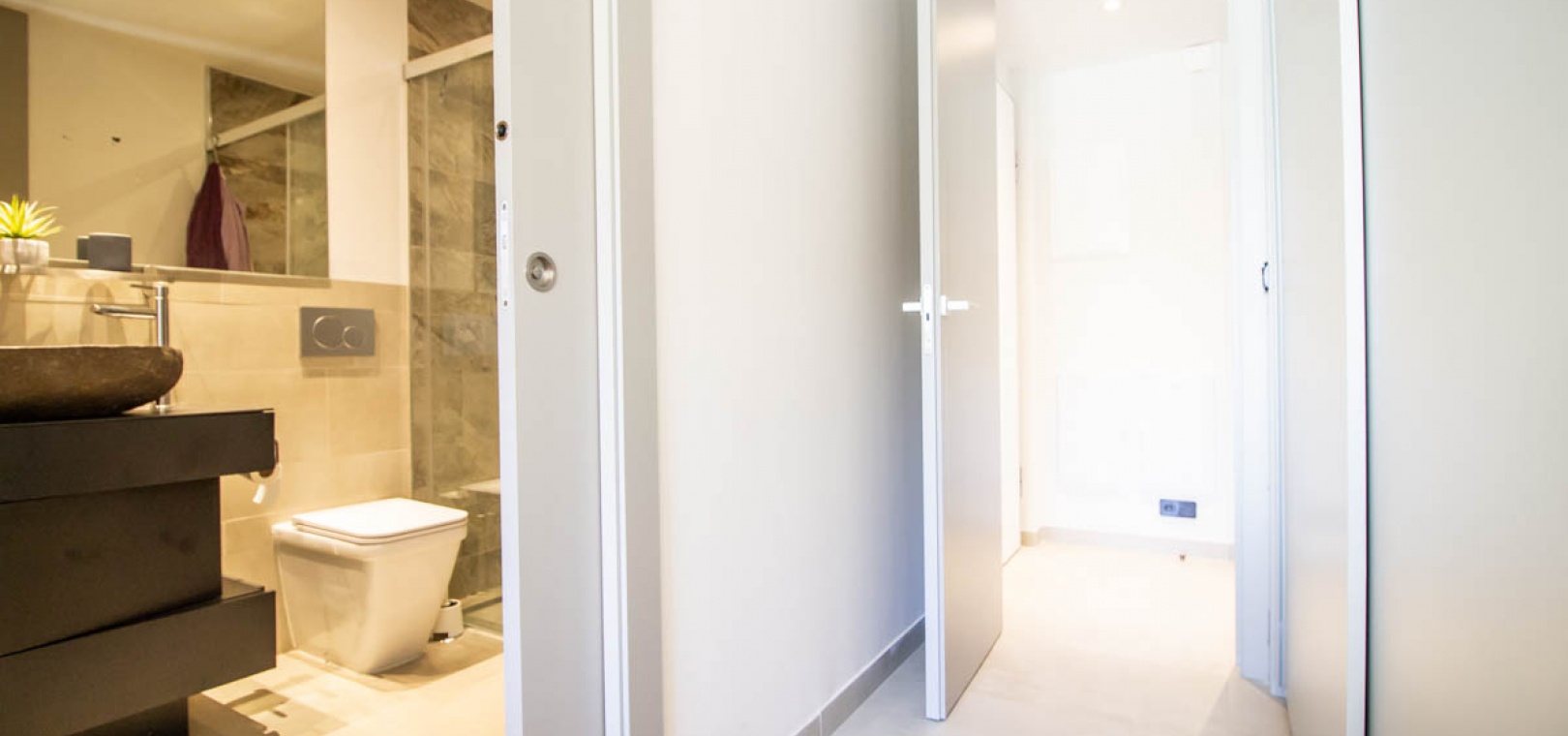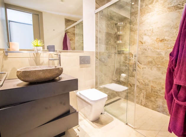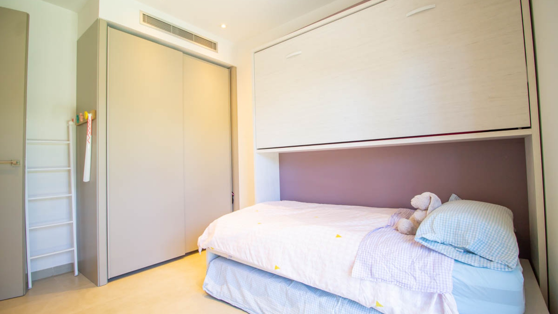 Ett stort vardagsrum/matrum med altandörrar ut till den 64m2 stora terrassen med fantastisk utsikt över den gemensamma poolen och trädgårdarna. Ett fullt utrustat kök med öppen planlösning med alla vitvaror inkluderade och ett separat bruksområde, en trädgård på 23 m2 på baksidan, 2 x stora dubbelrum med inbyggda garderober. Det största sovrummet har ett eget duschrum, 1 x gästduschrum, mycket solig 64m2 terrass med utsikt över en av de gemensamma poolerna och en underjordisk parkeringsplats med ett förråd. Det finns varm och kall A/C i alla rum.