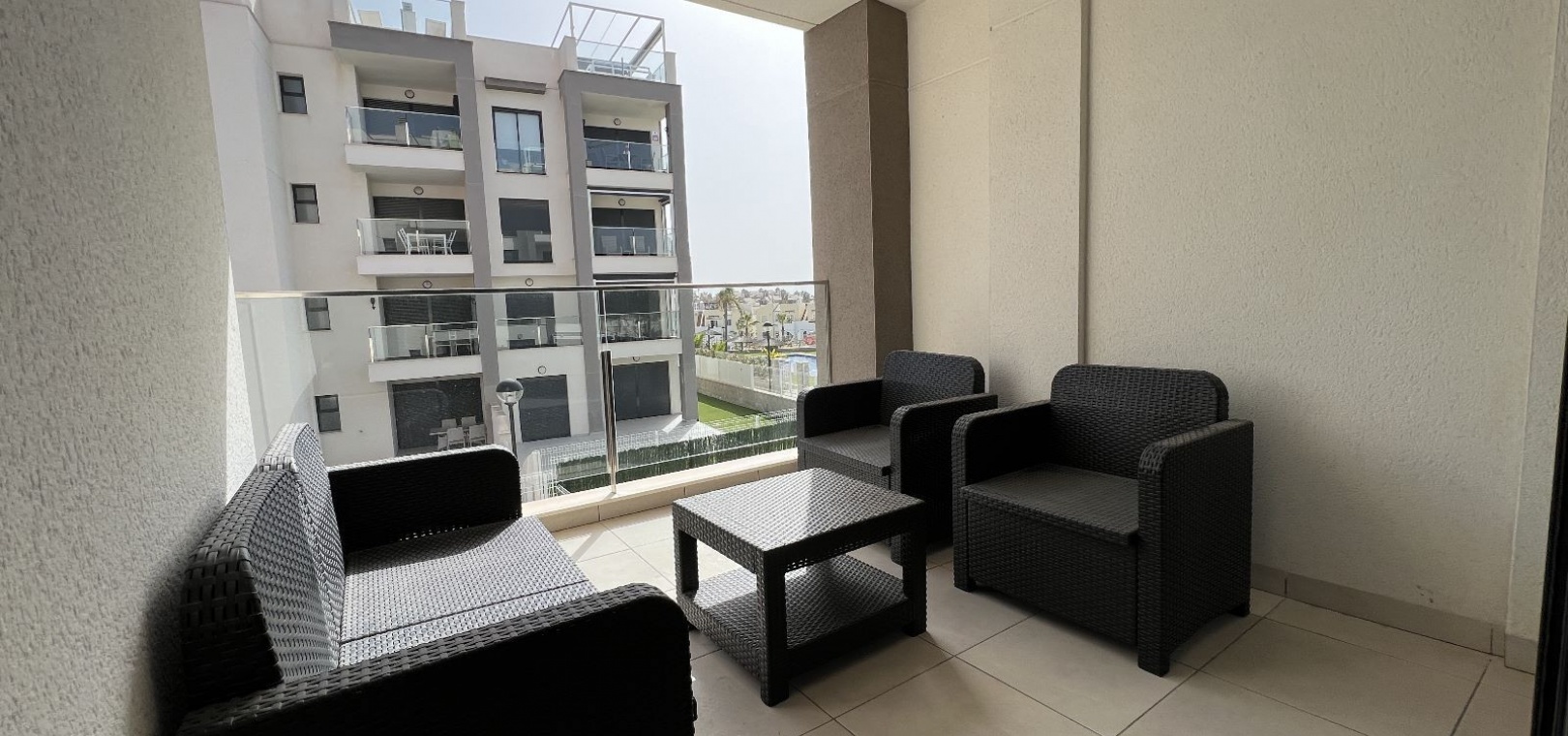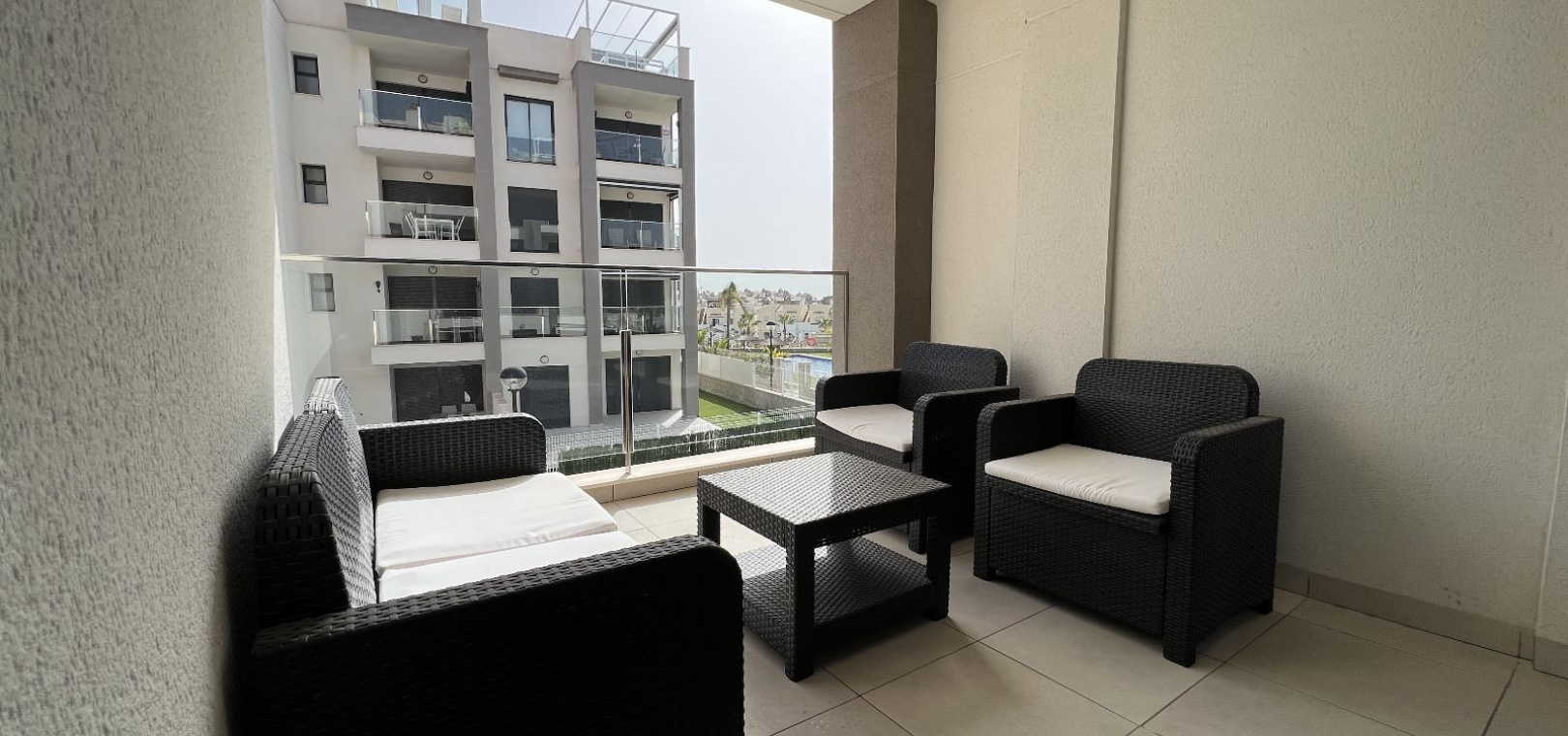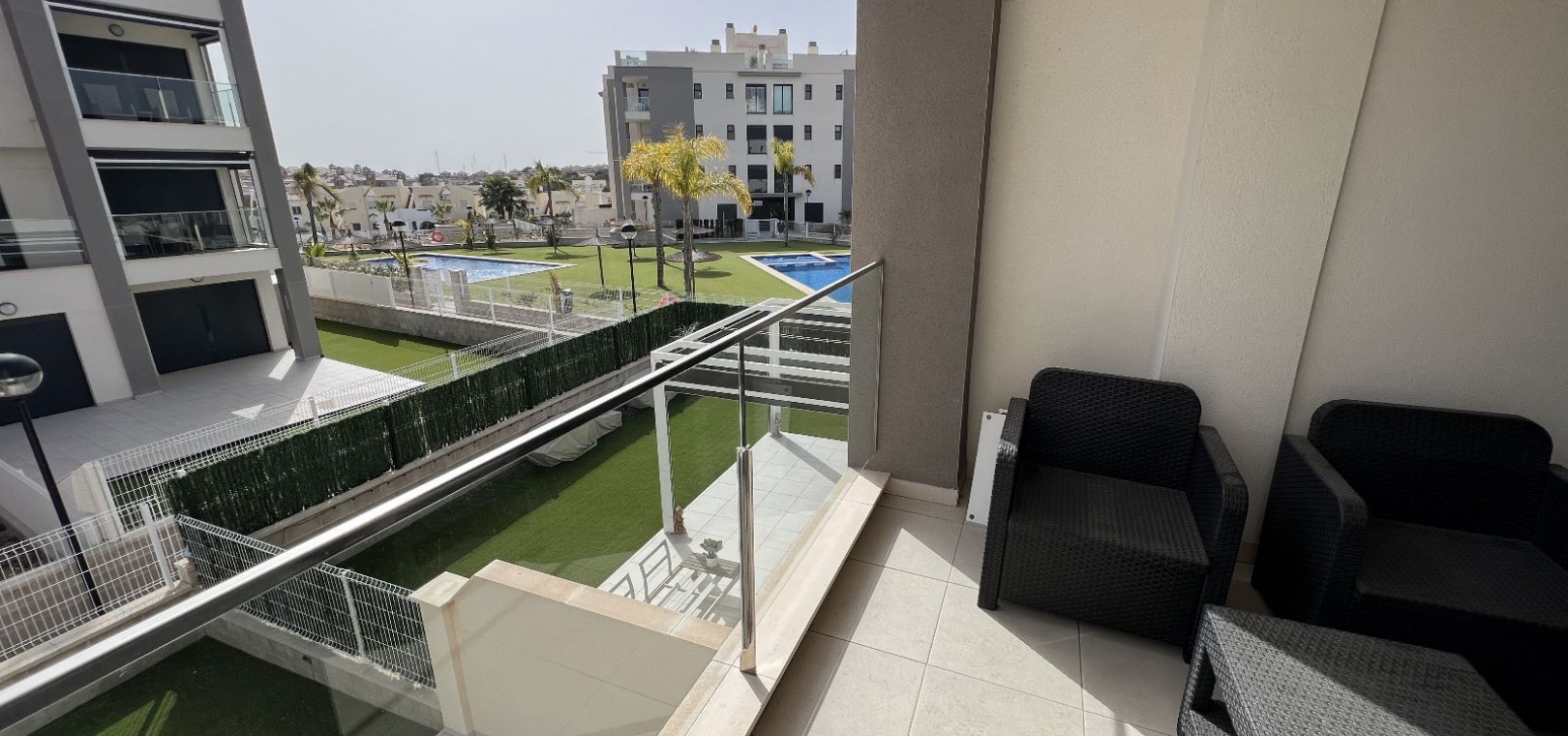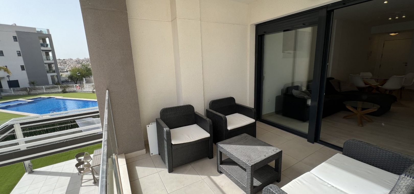 En sydostläge lyxig lägenhet med 2 sovrum och 2 badrum på första våningen med utsikt över den gemensamma poolen i Res. Valentino Golf, Villamartin, Costa Blanca.