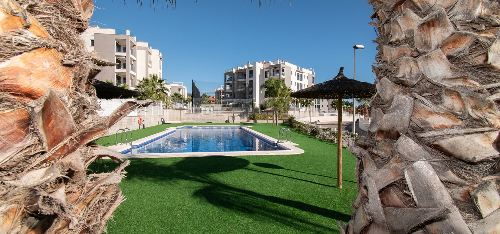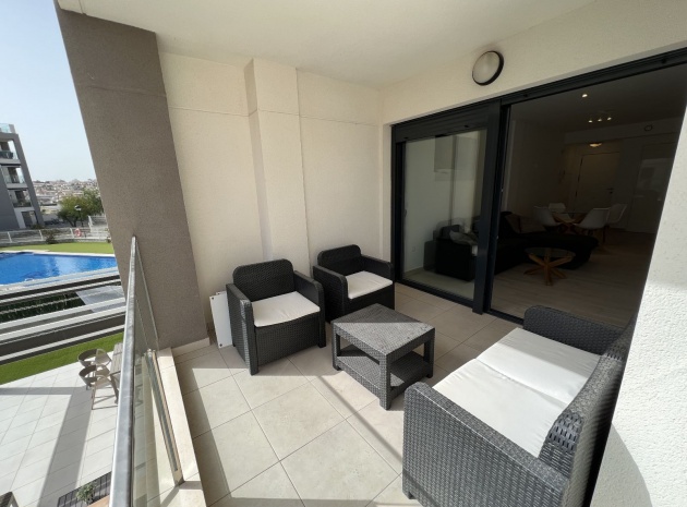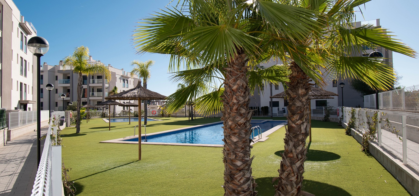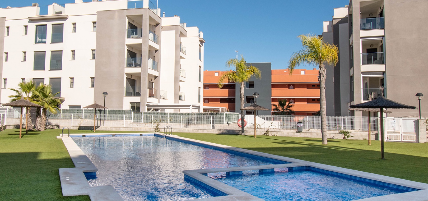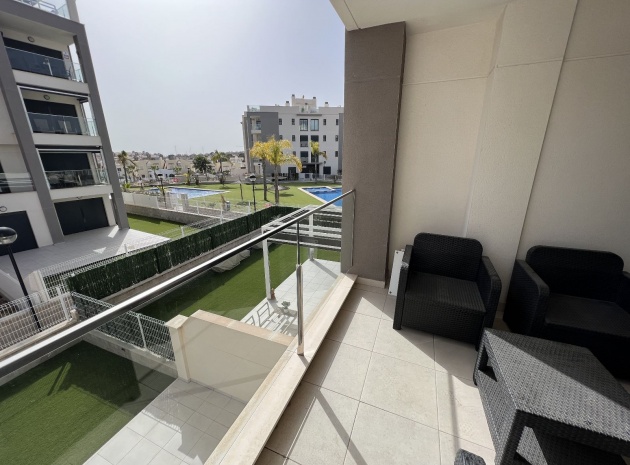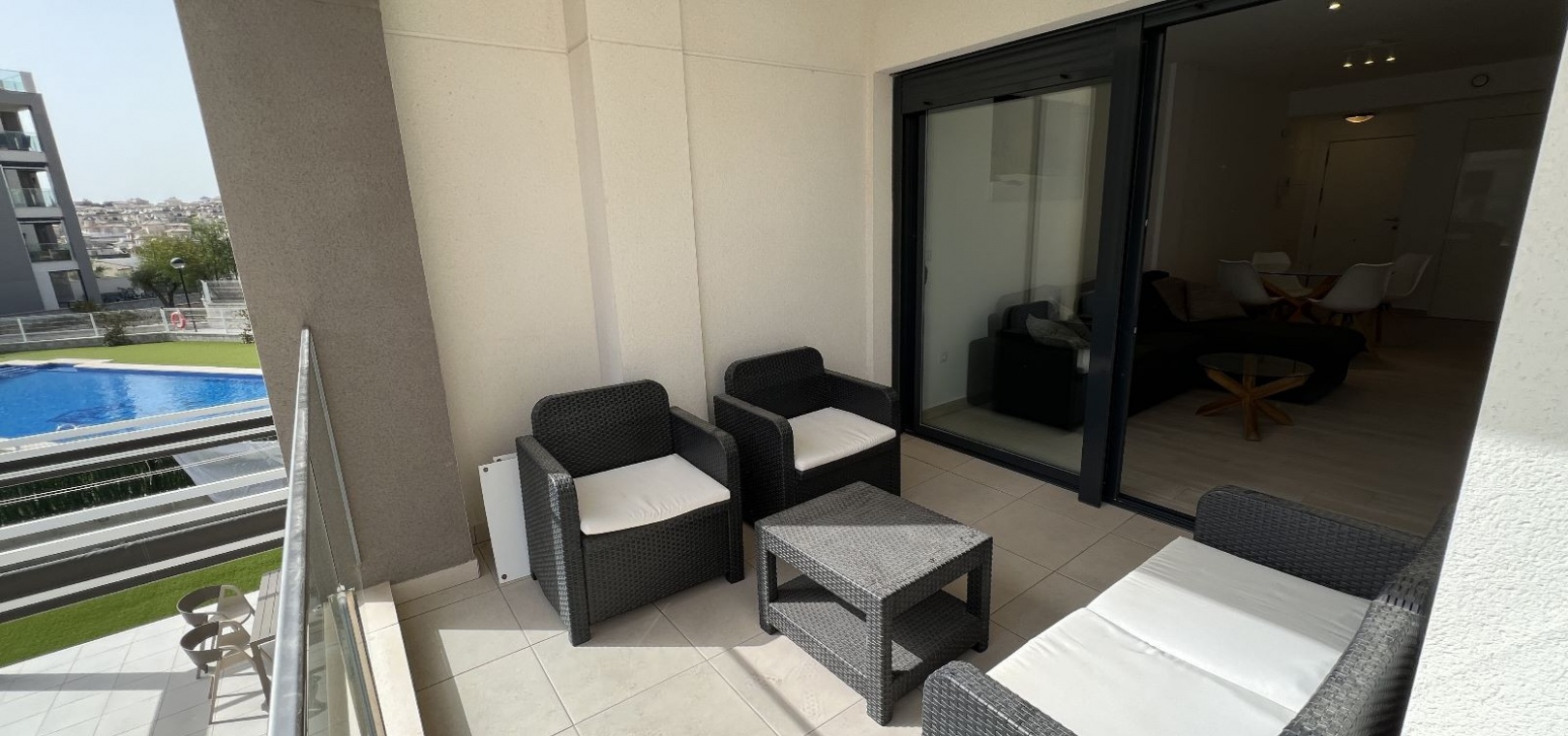 En sydostläge lyxig lägenhet med 2 sovrum och 2 badrum på första våningen med utsikt över den gemensamma poolen i Res. Valentino Golf, Villamartin, Costa Blanca.