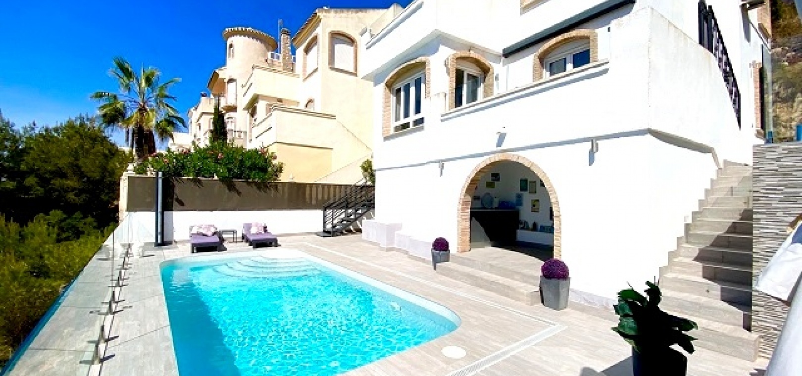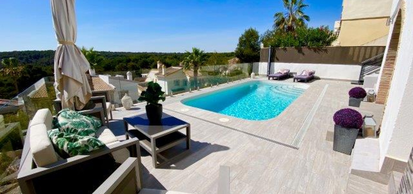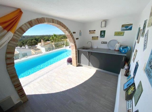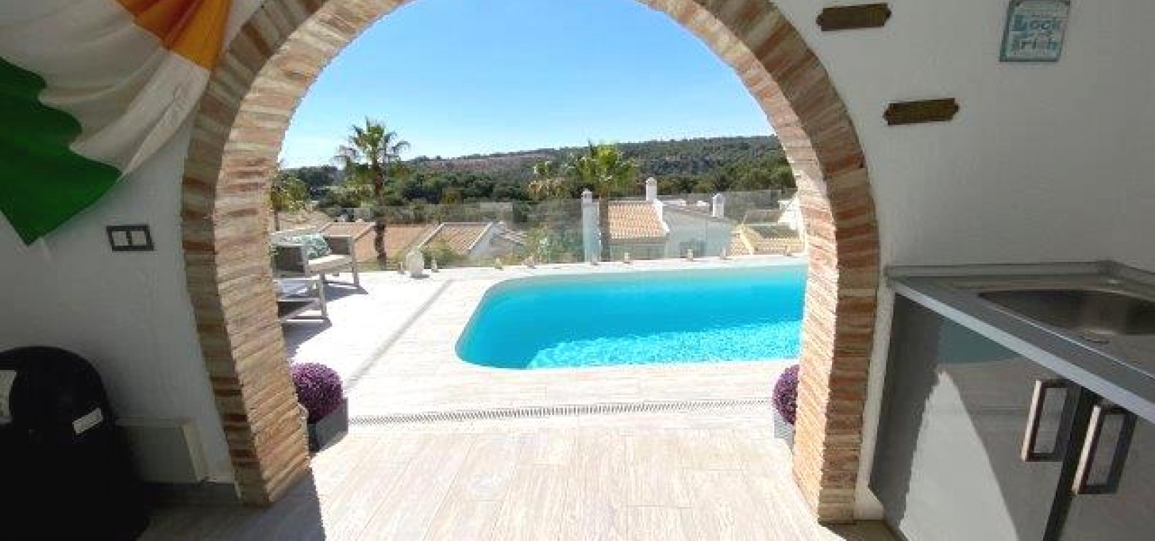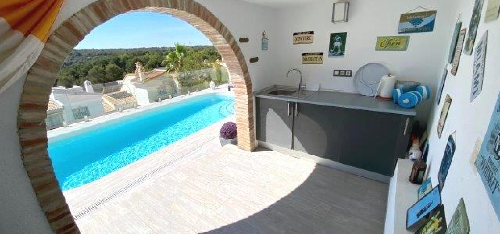 Utanför finns en privat pool i modern stil med glasvägg, massor av utrymme för sol/stolar och ytterligare en stor terrass perfekt för grillning och måltider utomhus. En stor del av den här fastigheten är utomhusköket med diskbänk och kylskåp, du behöver inte gå tillbaka till huset för att grilla eller en kall öl och ett glas vin!