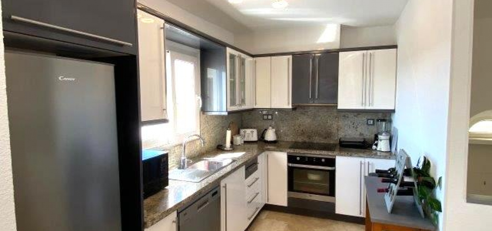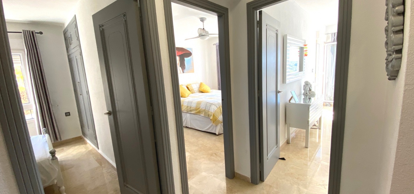 Interna trappor tar oss ner till bottenvåningen med 3 x dubbelrum alla med inbyggda garderober, det största sovrummet har ett eget badrum och dörrar som leder ut till en annan terrass och till poolområdet och stort familjestort gästtoalett.
