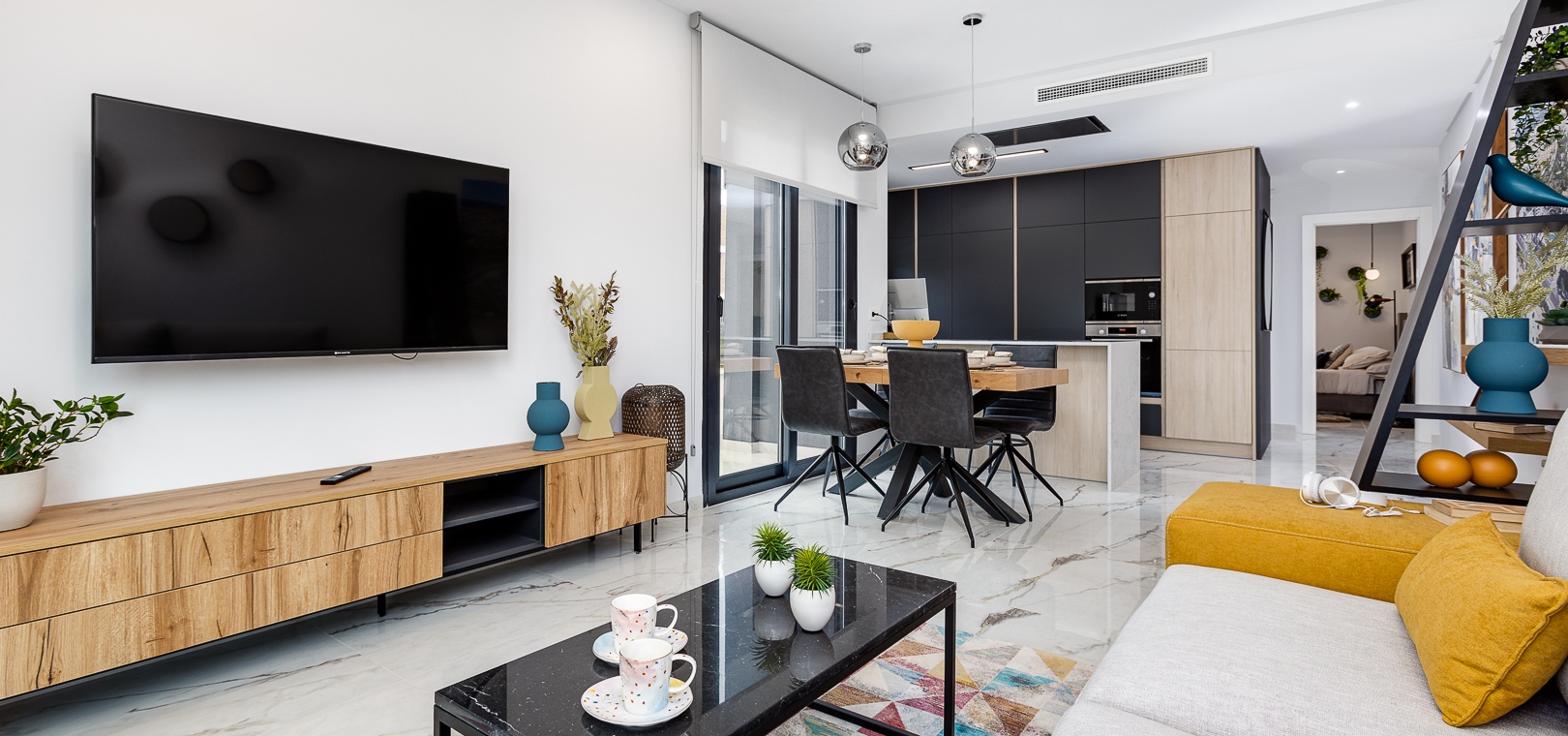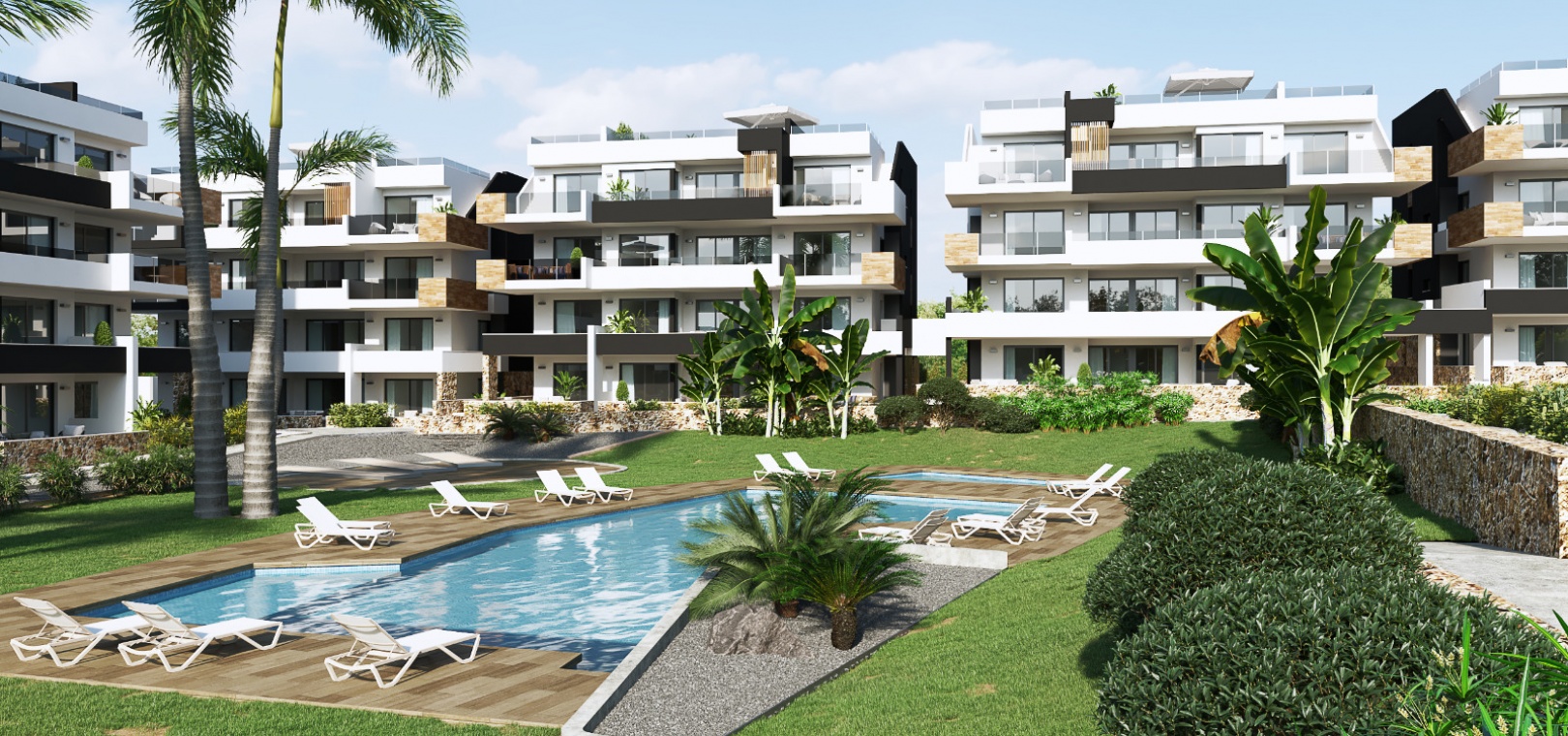Vardagsrum/matsal, fullt utrustat kök med öppen planlösning, 2 x dubbelrum, det största sovrummet har ett eget duschrum, 1 x gästduschrum, trädgård på framsidan, terrass eller solarium, härlig gemensam pool, underjordisk parkeringsplats och förråd , ultramodern design, förstklassiga byggmaterial och mycket mer.