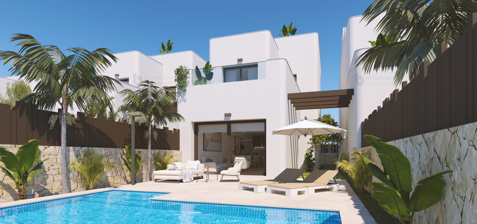 Denna lyxiga utveckling består av fristående villor med 3 sovrum, 3 badrum, vardagsrum / matsal, lyxigt kök, 15m2 terrass, 27m2 solarium, 91m2 trädgård, uppfart för off-road parkering och en privat pool.