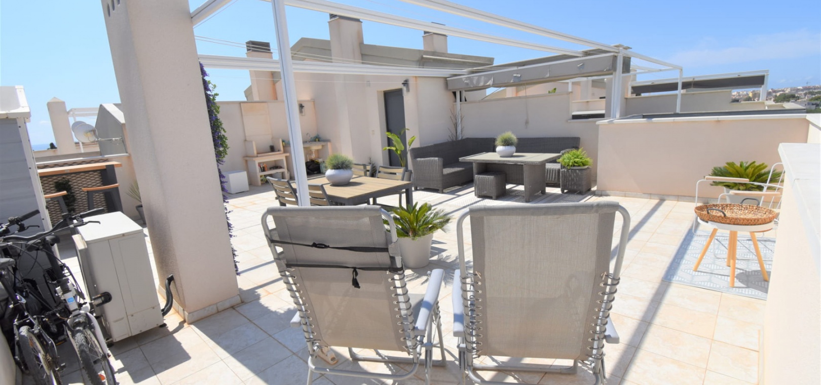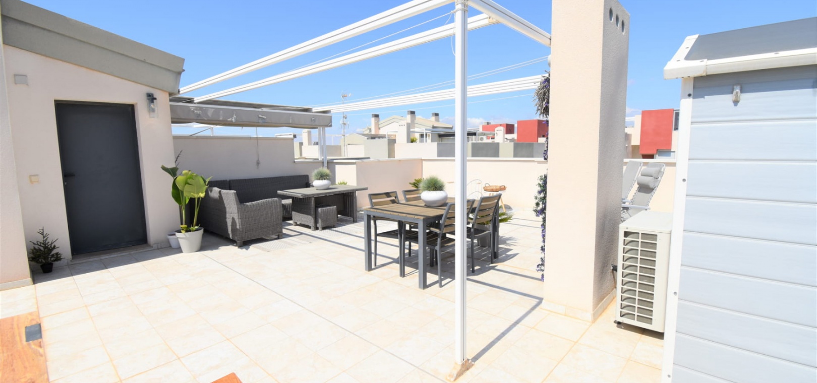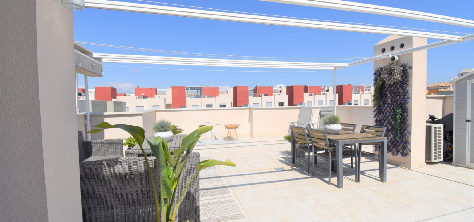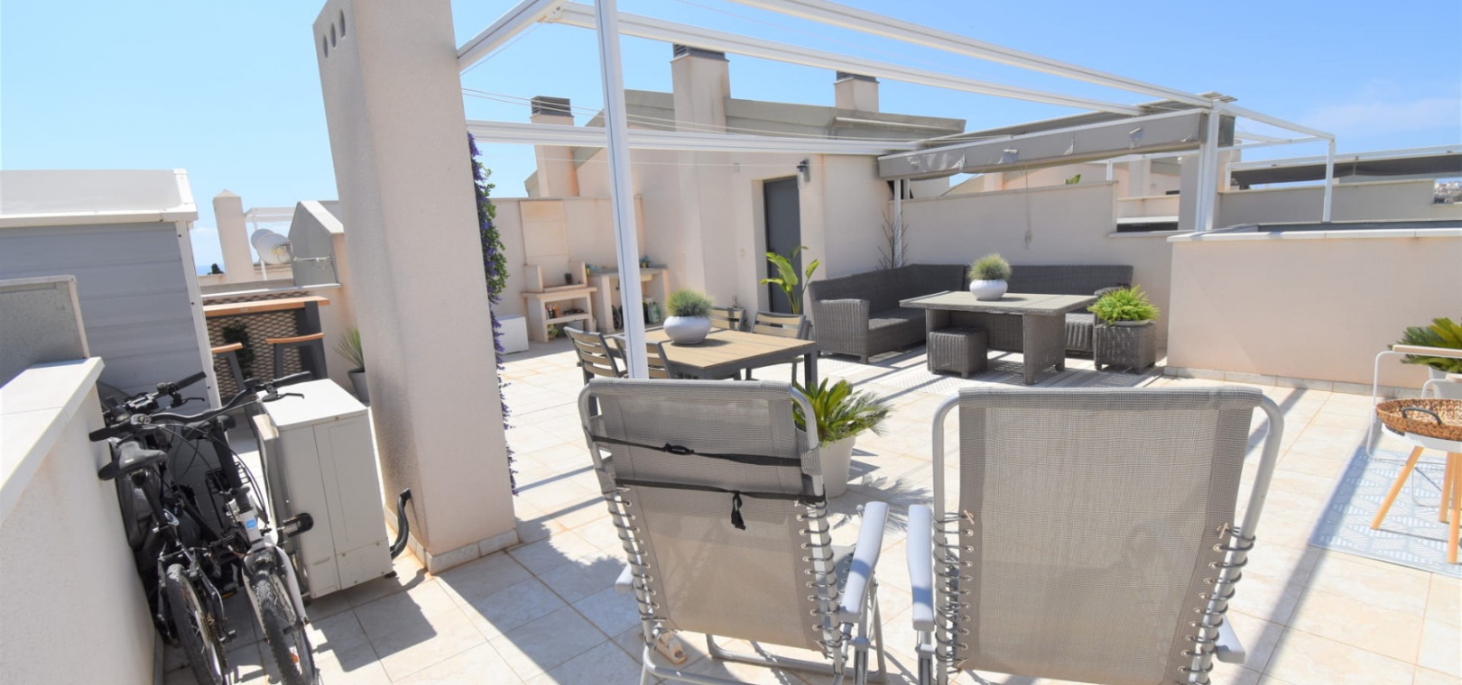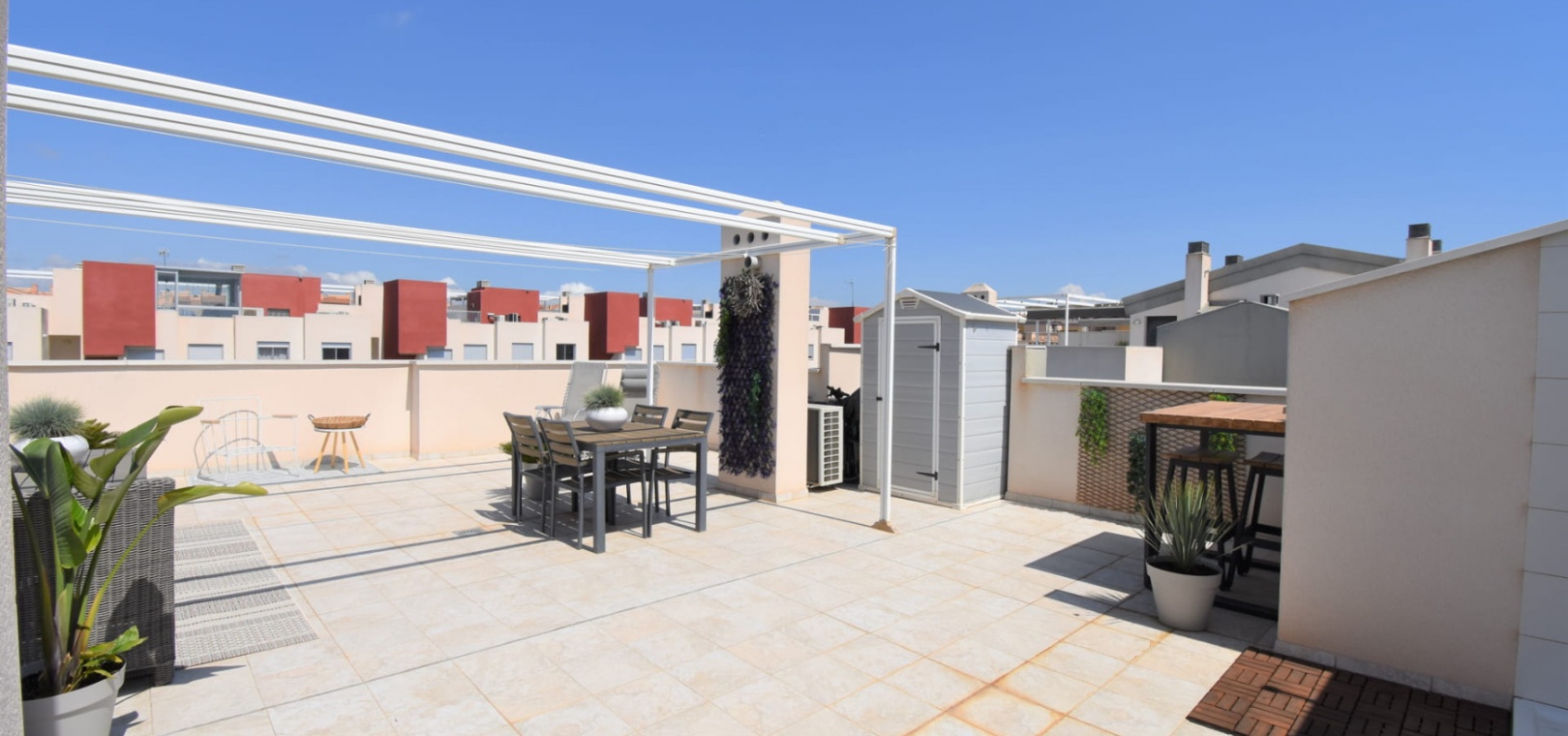 En lägenhet med 2 sovrum och 2 badrum på översta våningen med ett privat takterrass i Residencial Aqua, Aguas Nuevas, Torrevieja, Costa Blanca. Denna fastighet säljs i mycket gott skick, säljs möblerad och består mycket kortfattat av följande: - vardagsrum/matsal, fullt utrustat kök med öppen planlösning, separat tvättstuga, 2 x dubbelrum med inbyggda garderober, det största sovrummet har ett badrum svit duschrum, 1 x gästduschrum, balkong utanför loungen, privat takterrass, utsikt över den gemensamma poolen och trädgårdarna, säker gated community och mycket mer. Några extra tillbehör är toppmoderna exklusiva möbler, vitvaror och varm- och kallkanalig A/C. Lokala barer, restauranger och stormarknader ligger mycket nära fastigheten och det är cirka fem minuters bilresa till havet. Köpcentret Habaneras och Carrefour ligger mindre än 10 minuters bilresa bort och det går regelbunden busstrafik till centrala Torrevieja och La Mata. Alicantes flygplats ligger cirka 40 minuters bilresa bort.