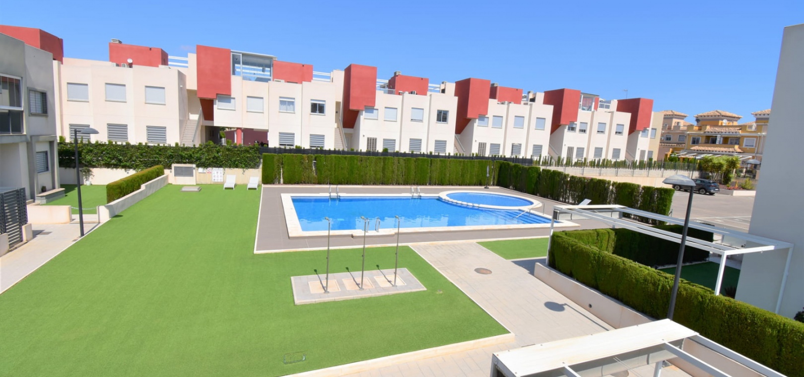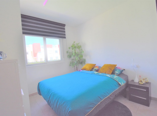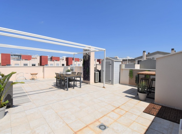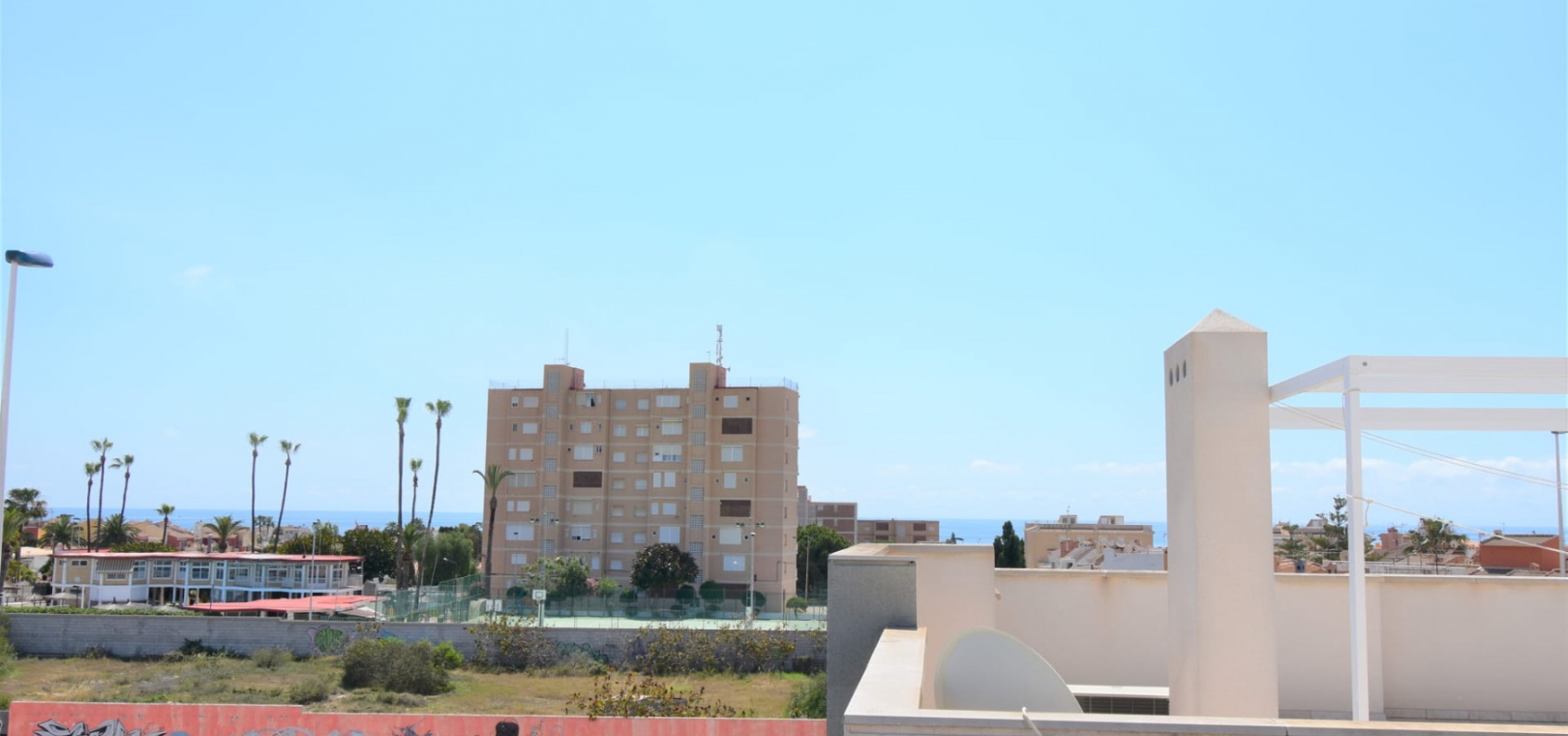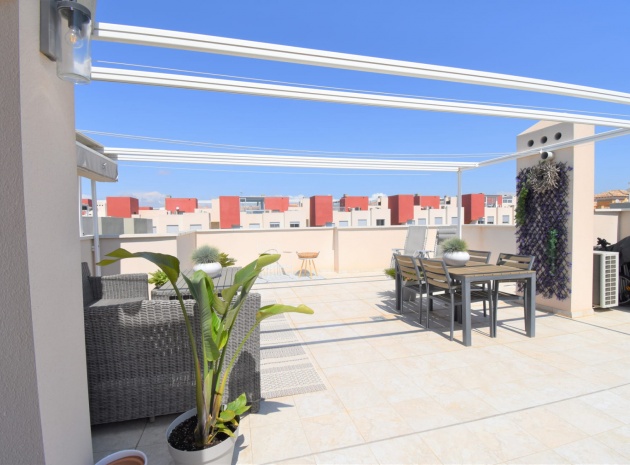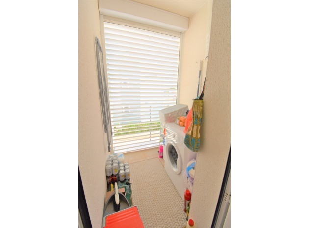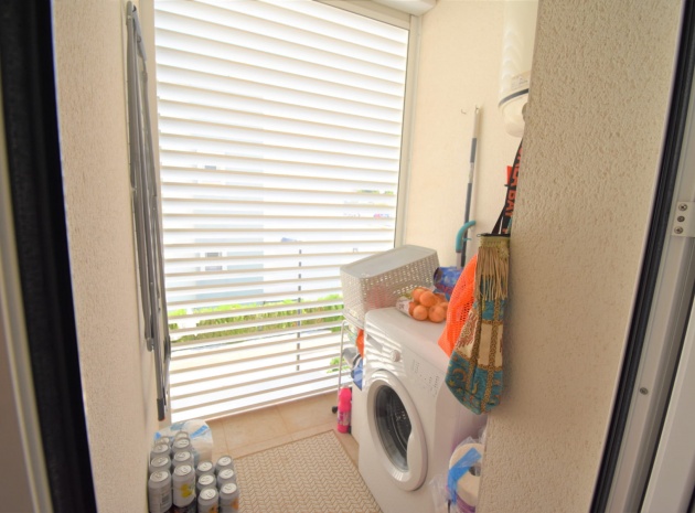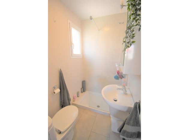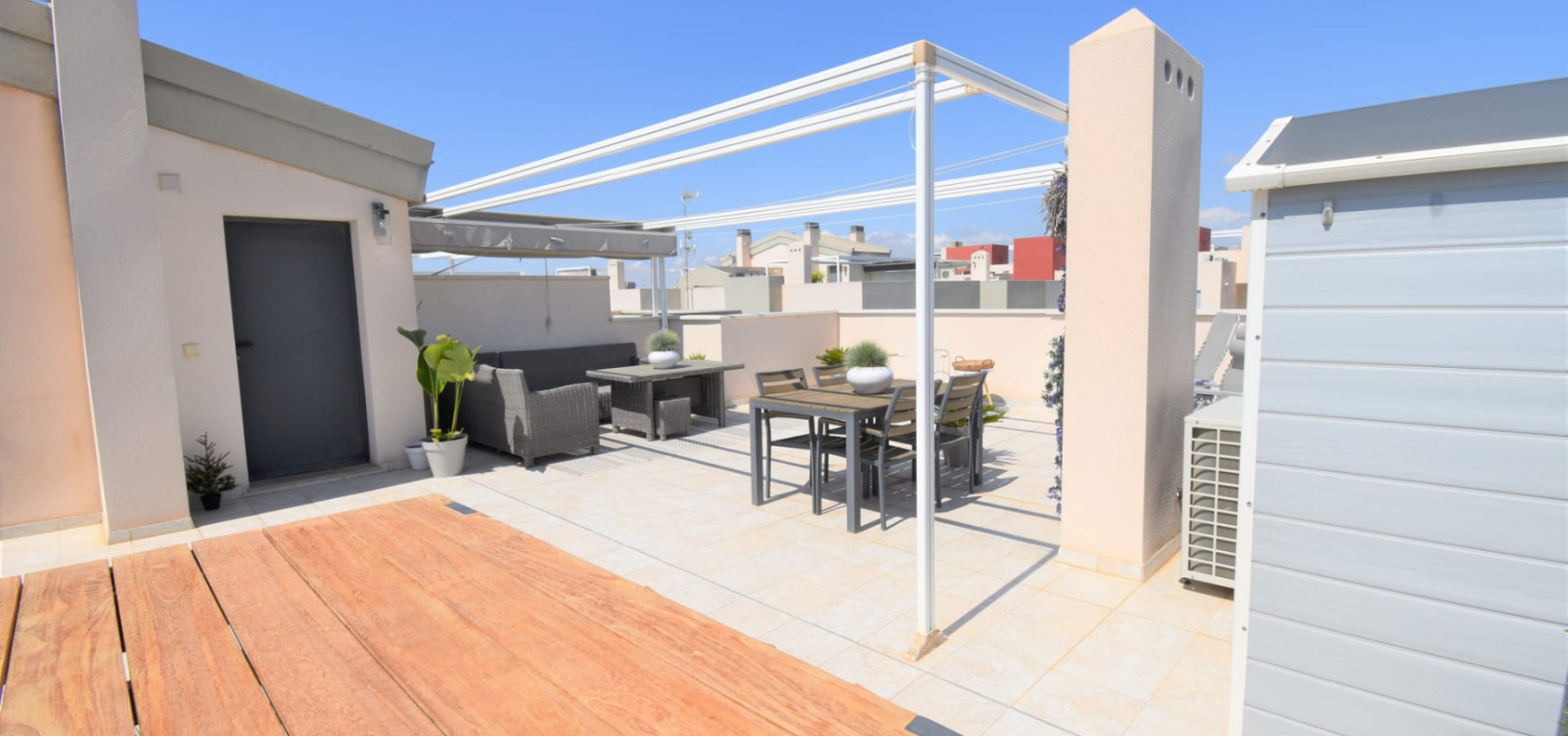 En lägenhet med 2 sovrum och 2 badrum på översta våningen med ett privat takterrass i Residencial Aqua, Aguas Nuevas, Torrevieja, Costa Blanca. Denna fastighet säljs i mycket gott skick, säljs möblerad och består mycket kortfattat av följande: - vardagsrum/matsal, fullt utrustat kök med öppen planlösning, separat tvättstuga, 2 x dubbelrum med inbyggda garderober, det största sovrummet har ett badrum svit duschrum, 1 x gästduschrum, balkong utanför loungen, privat takterrass, utsikt över den gemensamma poolen och trädgårdarna, säker gated community och mycket mer. Några extra tillbehör är toppmoderna exklusiva möbler, vitvaror och varm- och kallkanalig A/C. Lokala barer, restauranger och stormarknader ligger mycket nära fastigheten och det är cirka fem minuters bilresa till havet. Köpcentret Habaneras och Carrefour ligger mindre än 10 minuters bilresa bort och det går regelbunden busstrafik till centrala Torrevieja och La Mata. Alicantes flygplats ligger cirka 40 minuters bilresa bort.