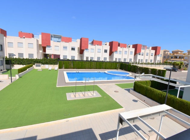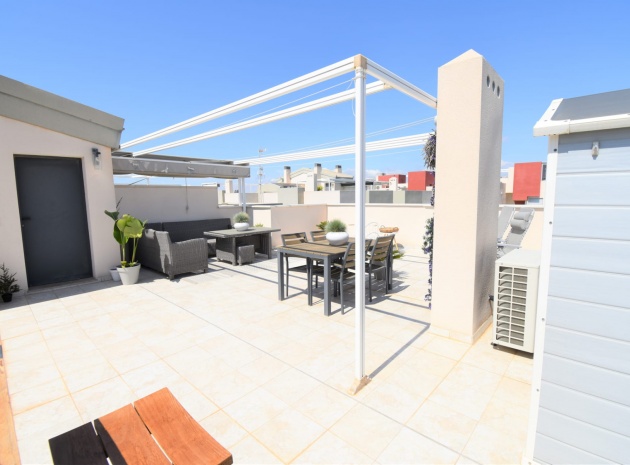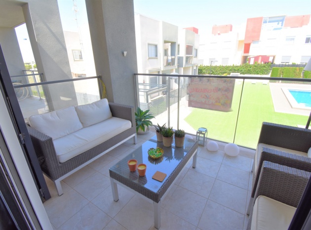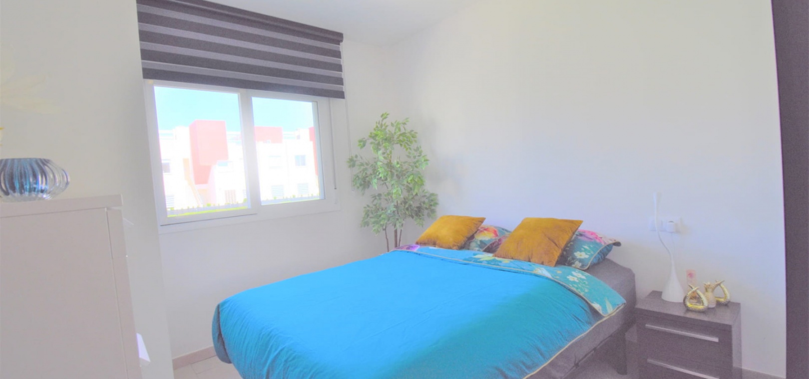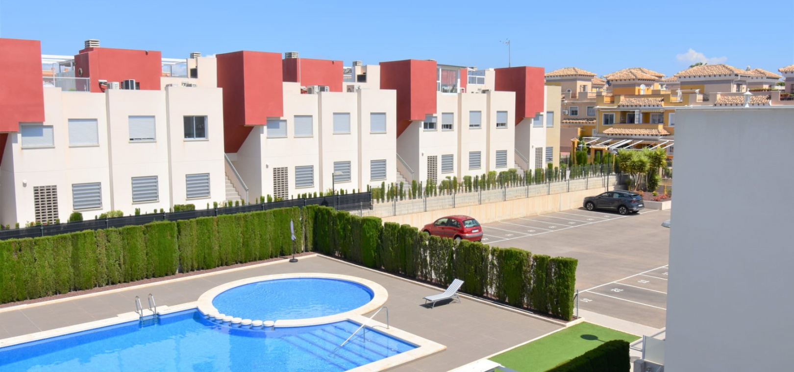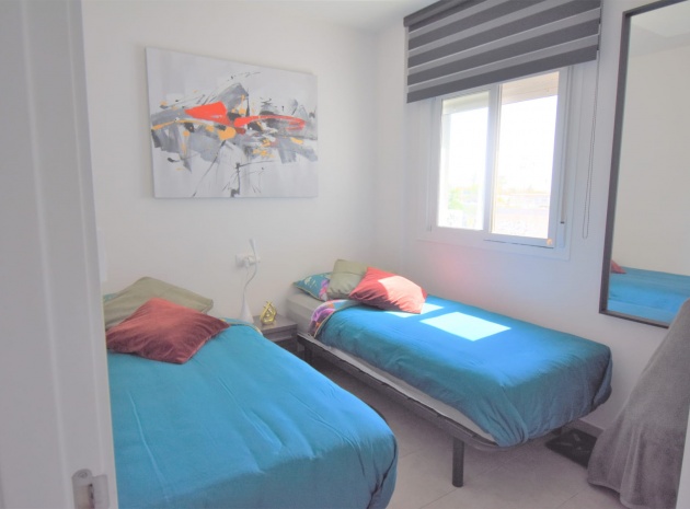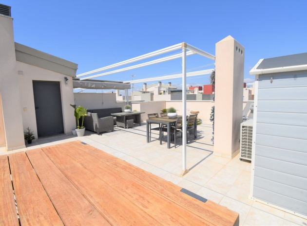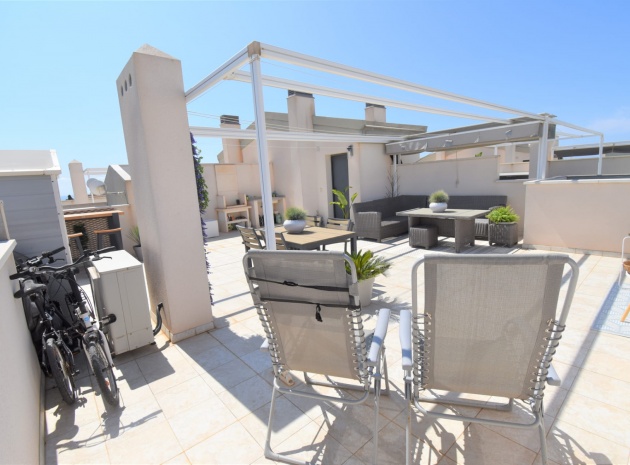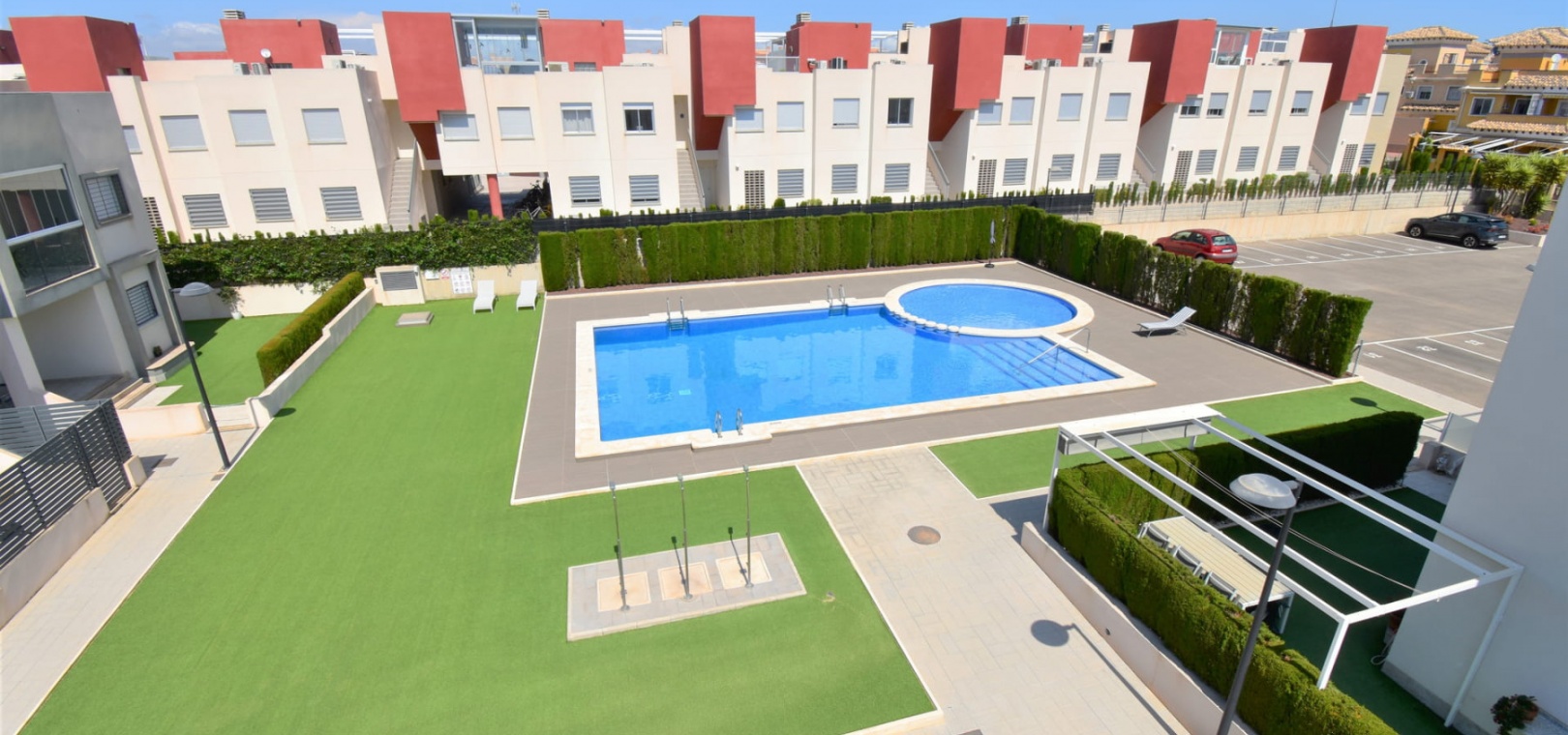 En lägenhet med 2 sovrum och 2 badrum på översta våningen med ett privat takterrass i Residencial Aqua, Aguas Nuevas, Torrevieja, Costa Blanca. Denna fastighet säljs i mycket gott skick, säljs möblerad och består mycket kortfattat av följande: - vardagsrum/matsal, fullt utrustat kök med öppen planlösning, separat tvättstuga, 2 x dubbelrum med inbyggda garderober, det största sovrummet har ett badrum svit duschrum, 1 x gästduschrum, balkong utanför loungen, privat takterrass, utsikt över den gemensamma poolen och trädgårdarna, säker gated community och mycket mer. Några extra tillbehör är toppmoderna exklusiva möbler, vitvaror och varm- och kallkanalig A/C. Lokala barer, restauranger och stormarknader ligger mycket nära fastigheten och det är cirka fem minuters bilresa till havet. Köpcentret Habaneras och Carrefour ligger mindre än 10 minuters bilresa bort och det går regelbunden busstrafik till centrala Torrevieja och La Mata. Alicantes flygplats ligger cirka 40 minuters bilresa bort.
