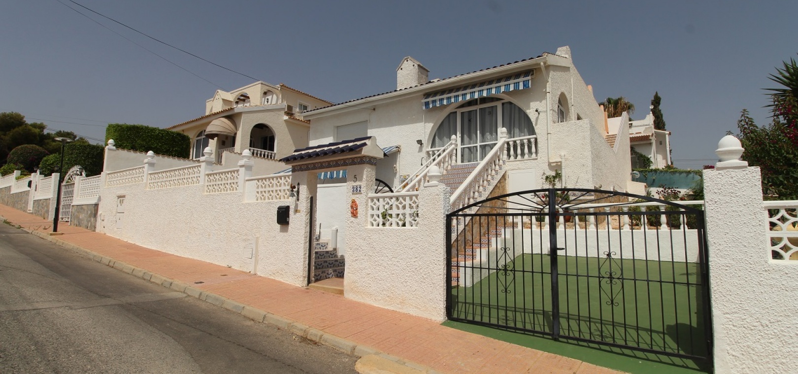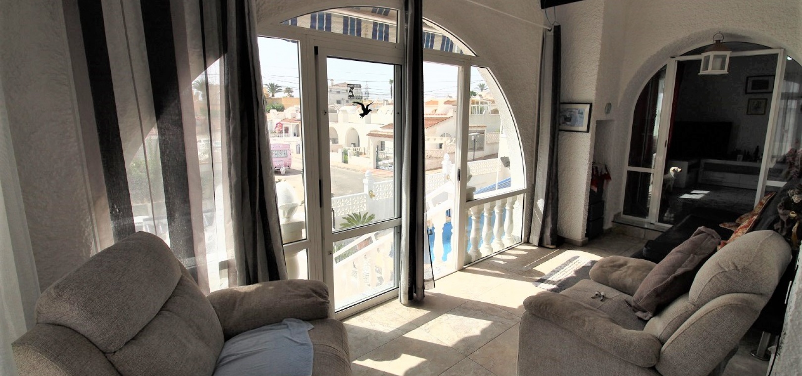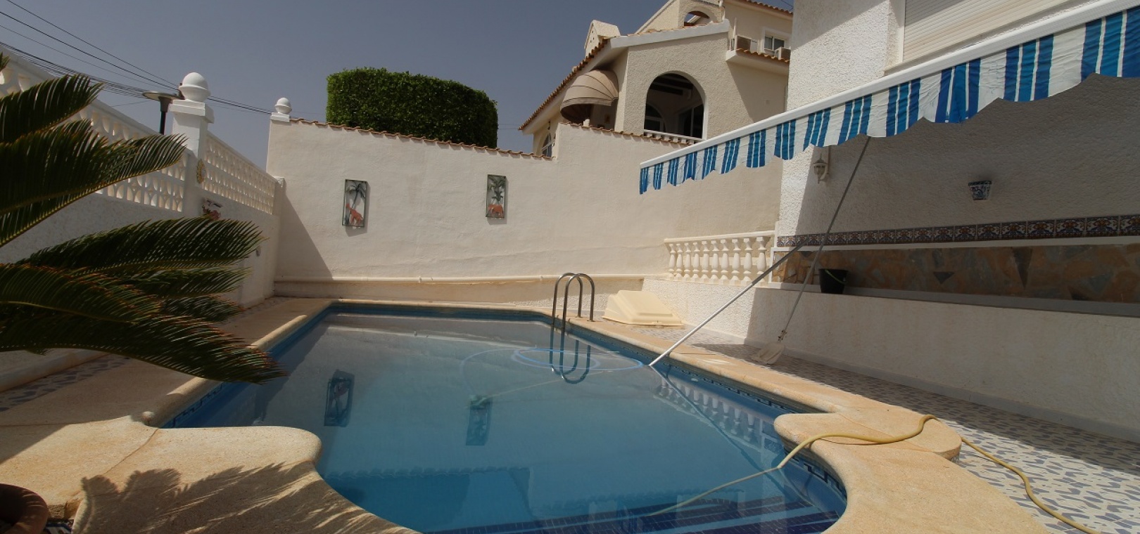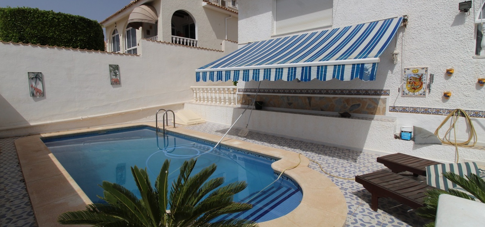 En fristående villa med 3 sovrum och 2 badrum i sydvästläge med en privat pool belägen i Blue Lagoon, Villamartin, Costa Blanca. Denna härliga fastighet säljs i gott skick, säljs möblerad och består mycket kortfattat av följande:- Lounge/matsal med varm och kall luftkonditionering, nyutrustat kök med öppen planlösning, 2 x dubbelrum, 1 x enkelrum, 1 x duschrum & 1 x familjebadrum. Utanför finns en inglasad terrass på framsidan med en soltält, privat takterrass, stor trädgård med privat pool, separat tvättstuga, off-road parkering och mycket mer. Det är varmt och kallt A/C, gas centralvärme och mycket mer. Denna fastighet ligger bara en kort promenad från lokala barer, butiker och restauranger. Stränderna Golden Orihuela Costa ligger bara 10 minuters bilresa bort eller så kan du använda den lokala bussen. Det finns 4 golfbanor alla inom 5 minuters bilresa. Murcia Corvera flygplats ligger 35 minuter bort och Alicantes flygplats ligger 40 minuters bilresa bort.