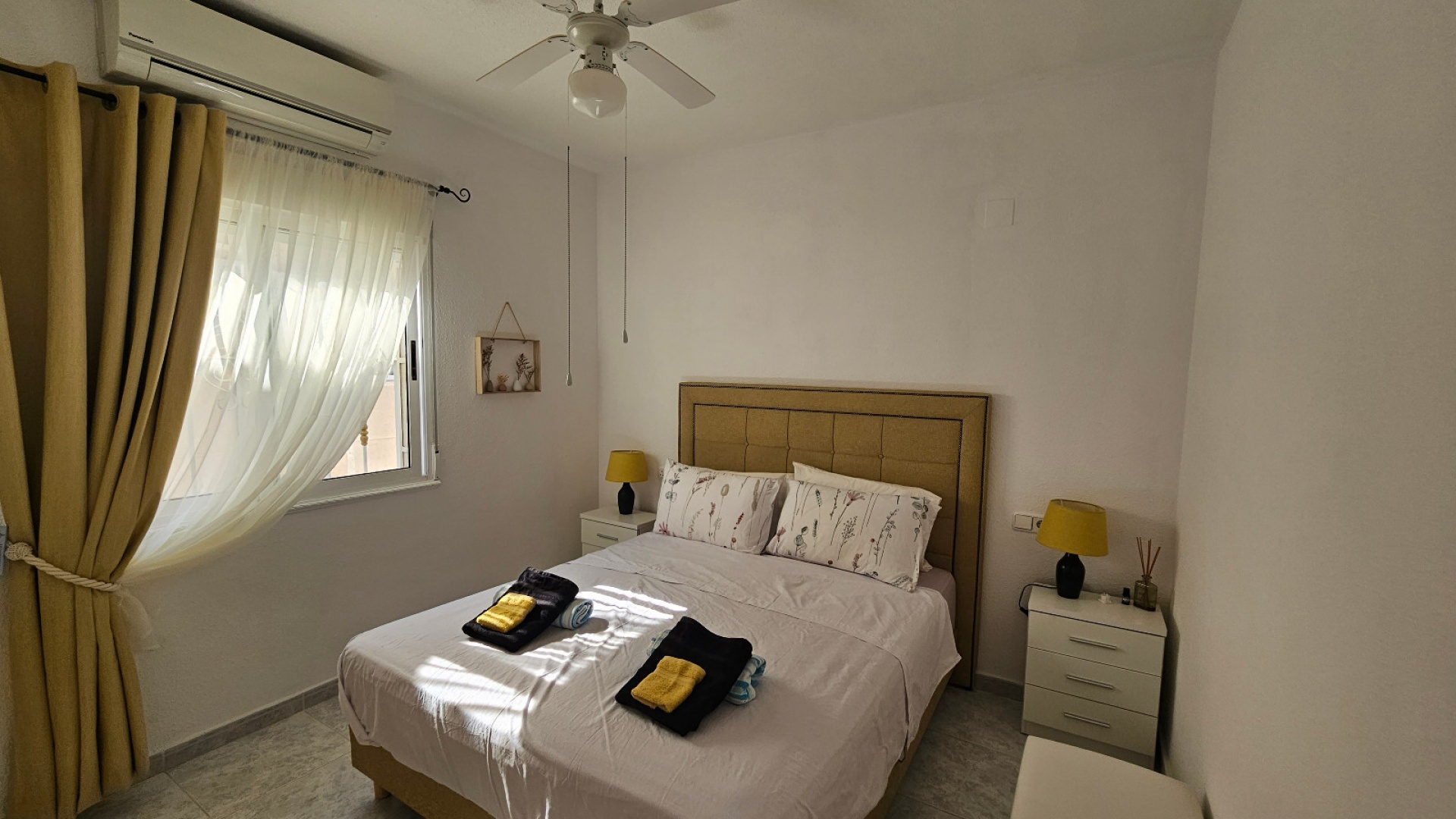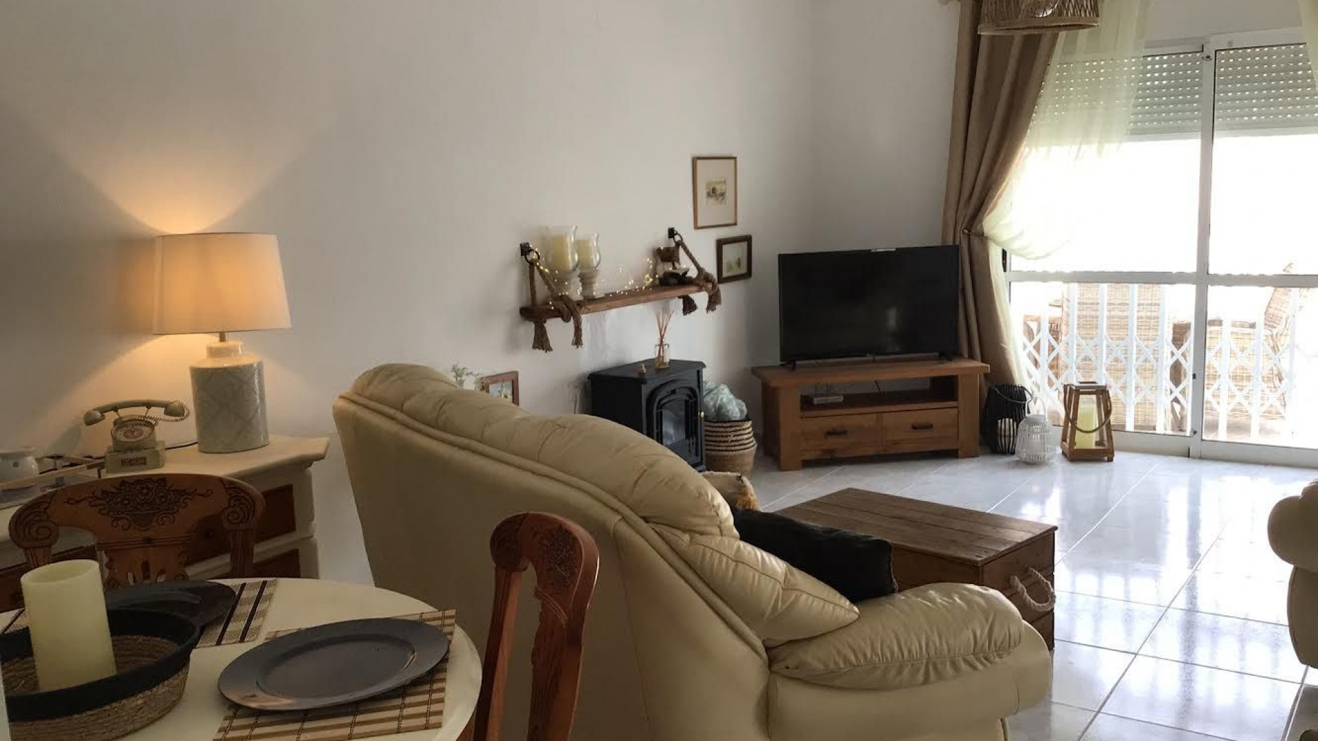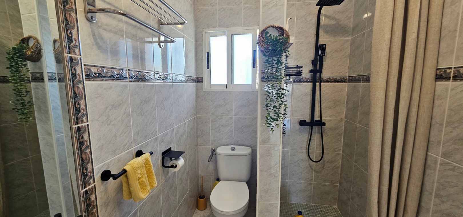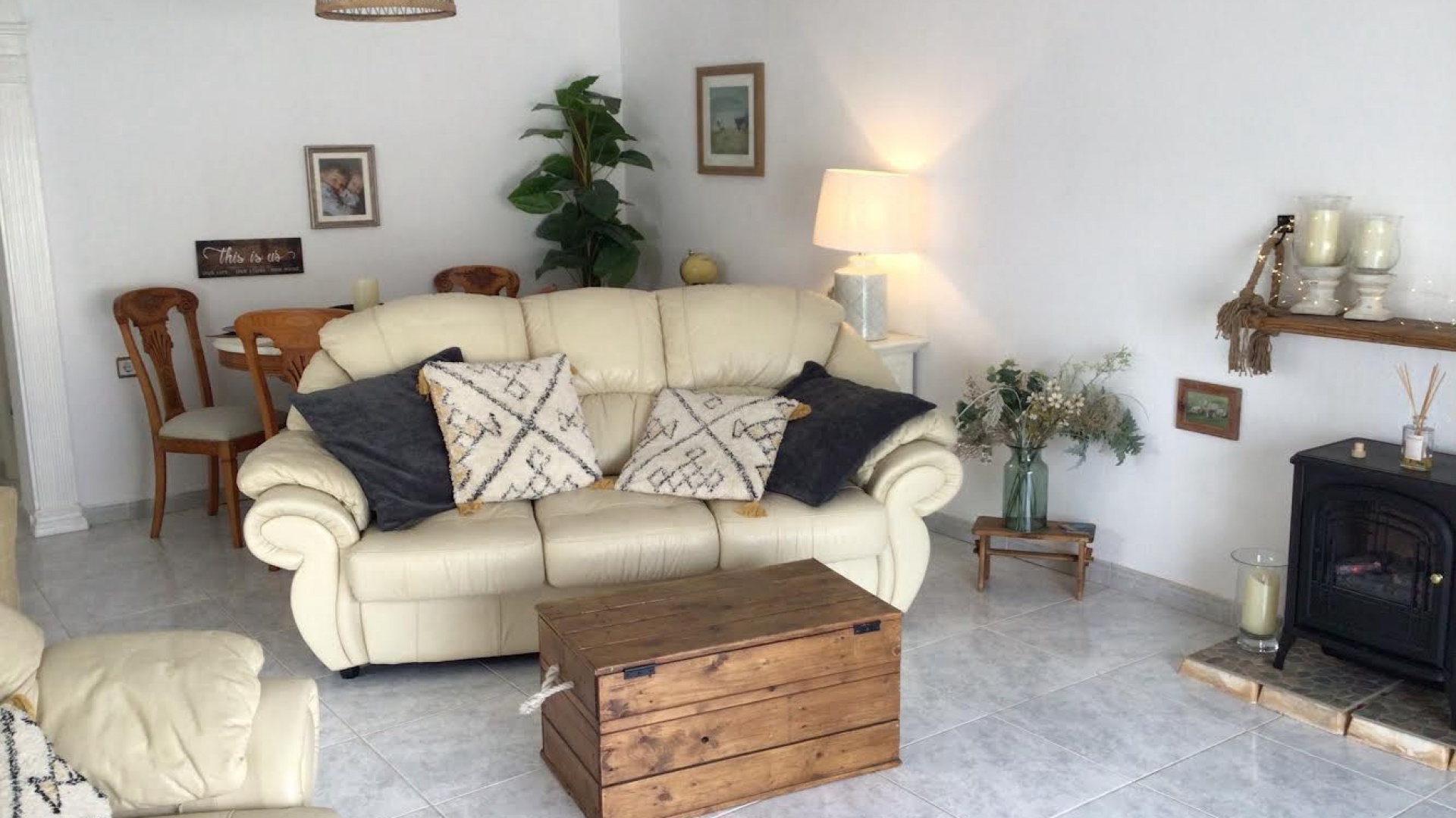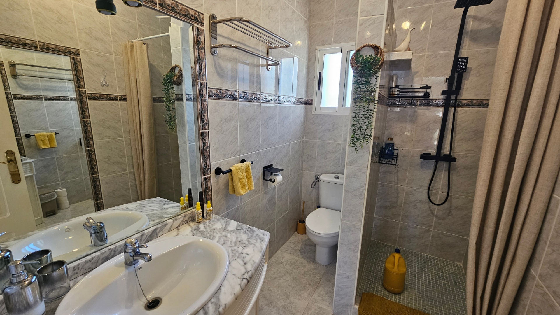 Inne i fastigheten hittar du ett stort vardagsrum/matsal, ett kök med öppen planlösning med varm och kall A/C, 2 x stora dubbelrum med inbyggda garderober och takfläktar och det största sovrummet har ett eget duschrum och varm- och kall A/C. Det finns också ett familjeduschrum som delvis har moderniserats.