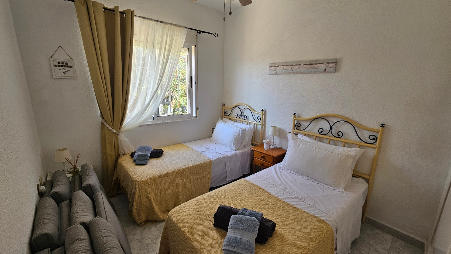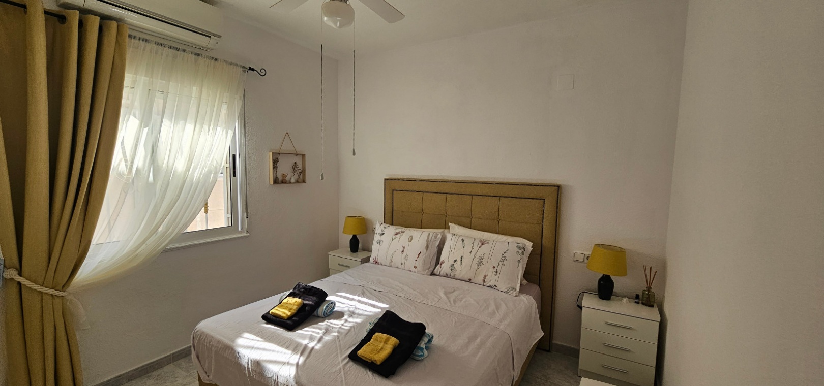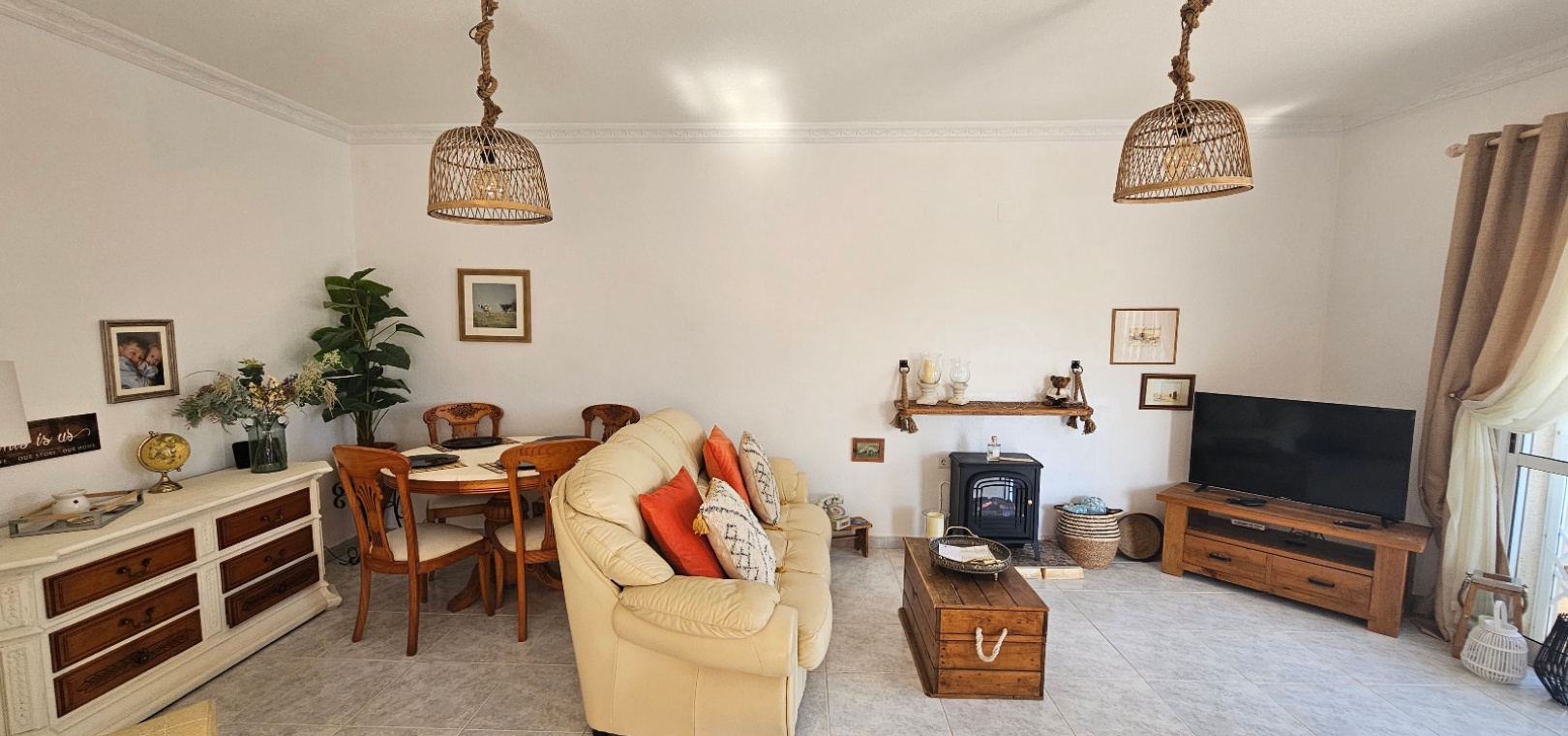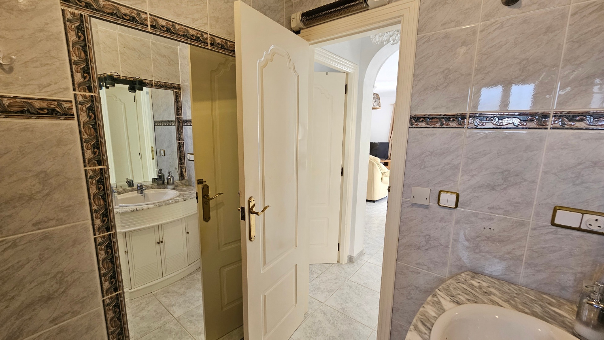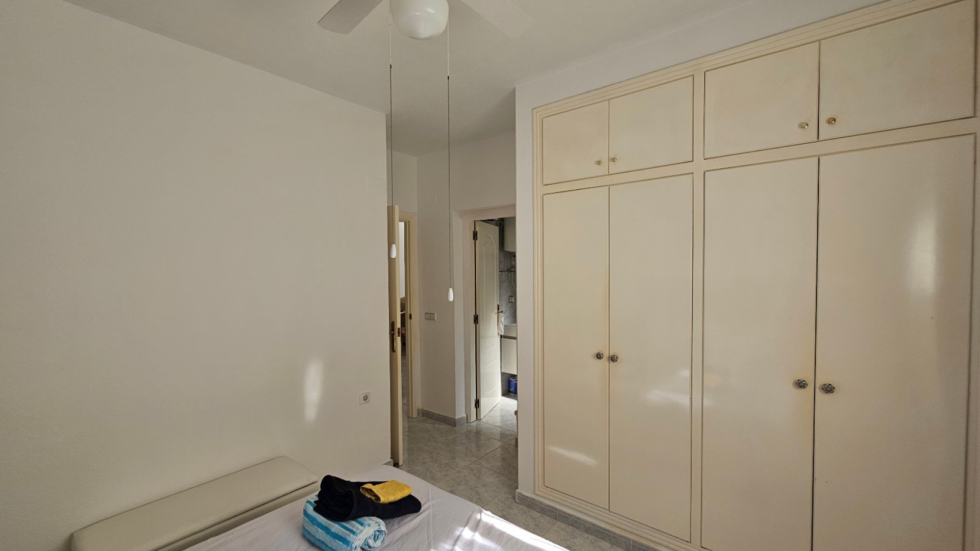 Inne i fastigheten hittar du ett stort vardagsrum/matsal, ett kök med öppen planlösning med varm och kall A/C, 2 x stora dubbelrum med inbyggda garderober och takfläktar och det största sovrummet har ett eget duschrum och varm- och kall A/C. Det finns också ett familjeduschrum som delvis har moderniserats.
