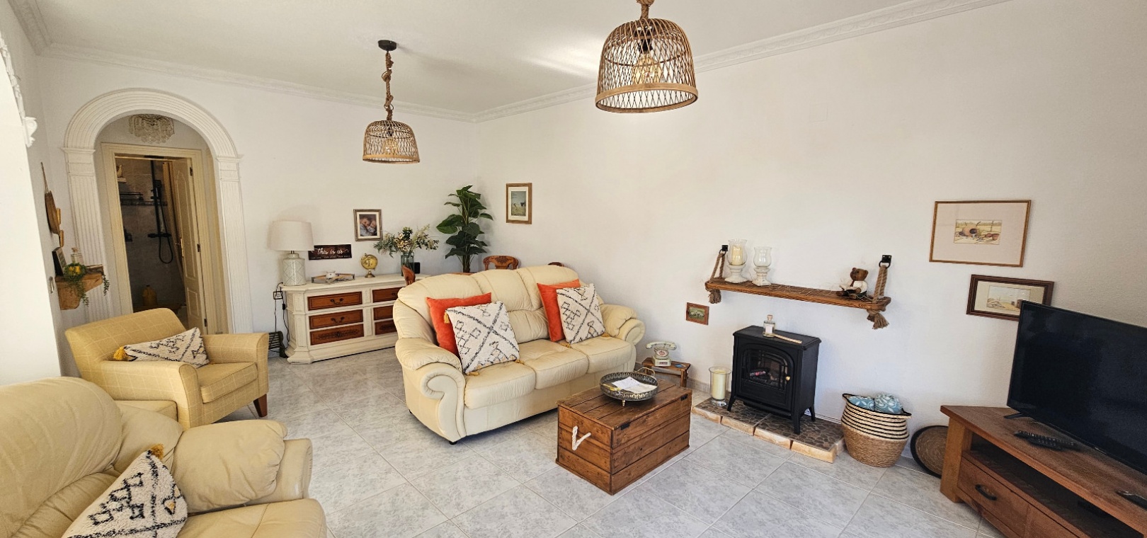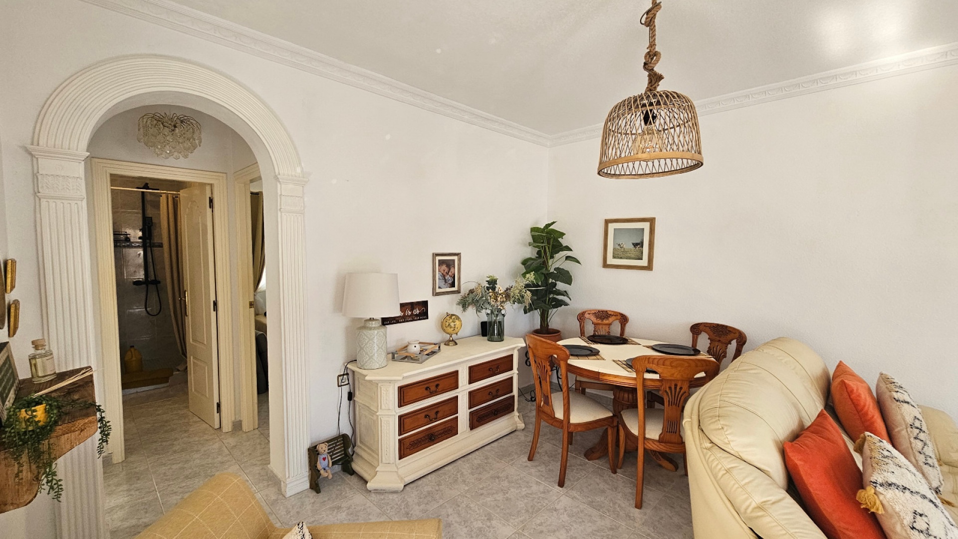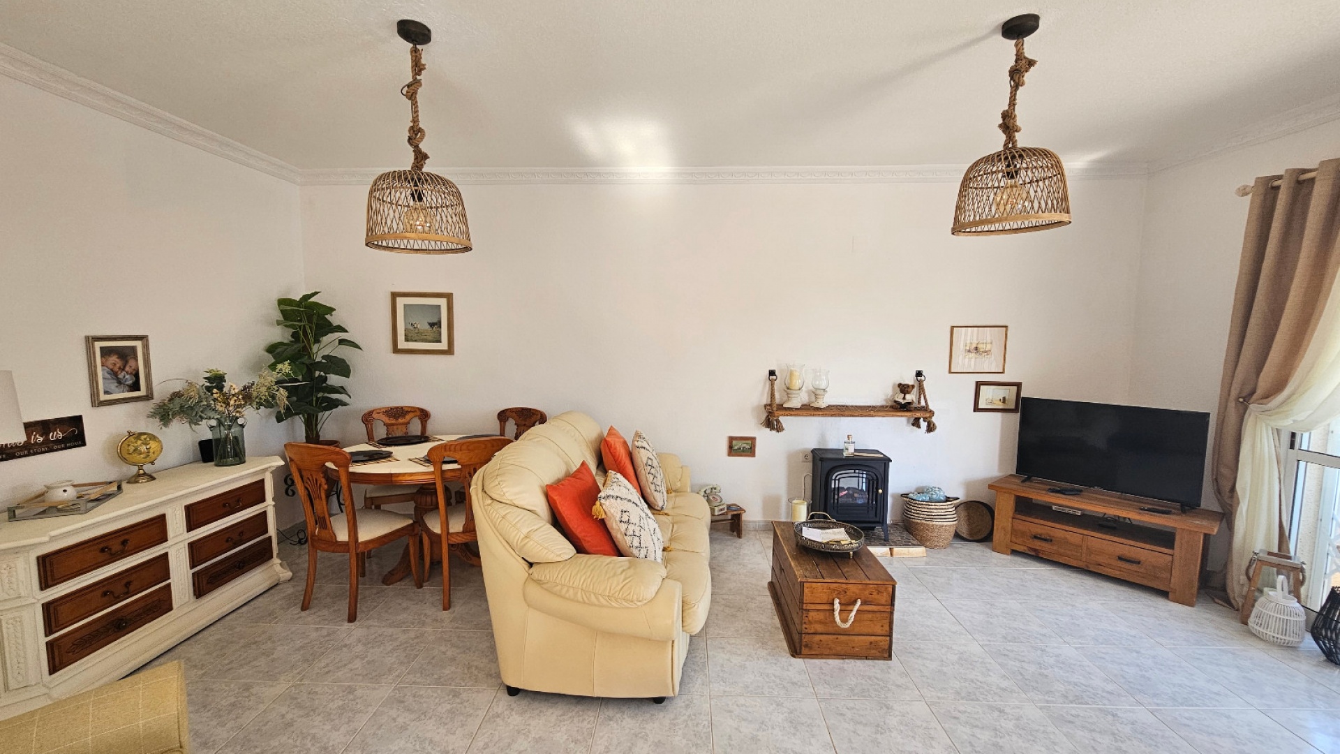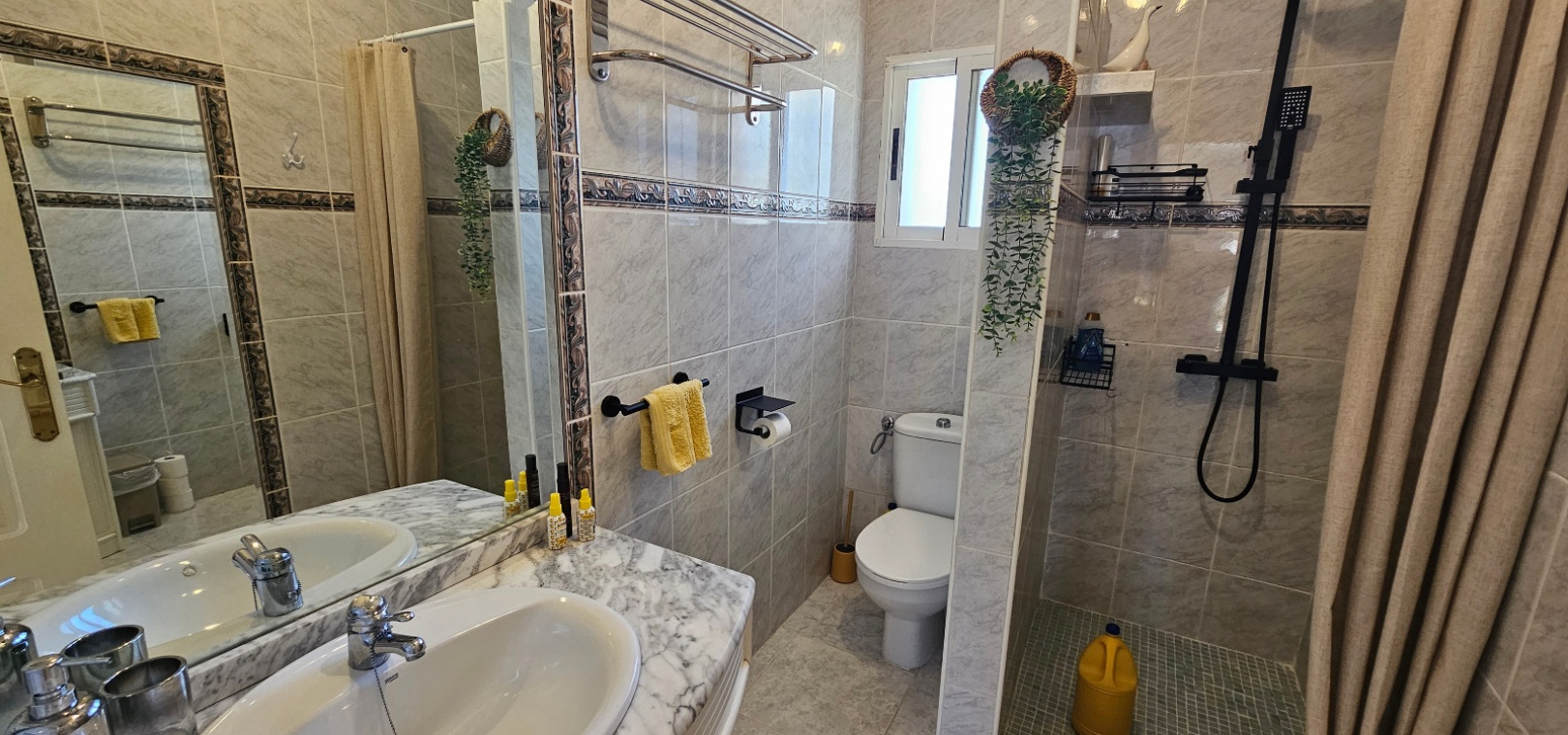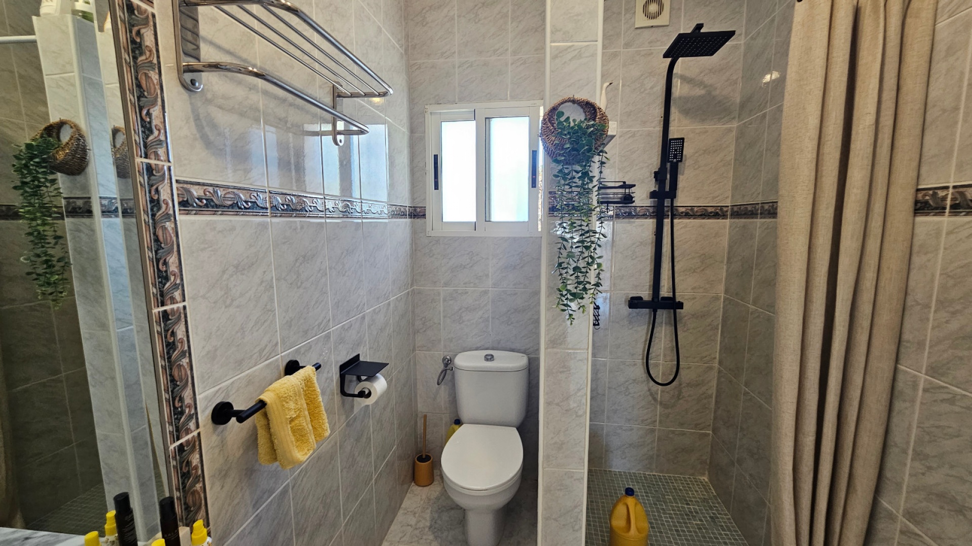 Inne i fastigheten hittar du ett stort vardagsrum/matsal, ett kök med öppen planlösning med varm och kall A/C, 2 x stora dubbelrum med inbyggda garderober och takfläktar och det största sovrummet har ett eget duschrum och varm- och kall A/C. Det finns också ett familjeduschrum som delvis har moderniserats.