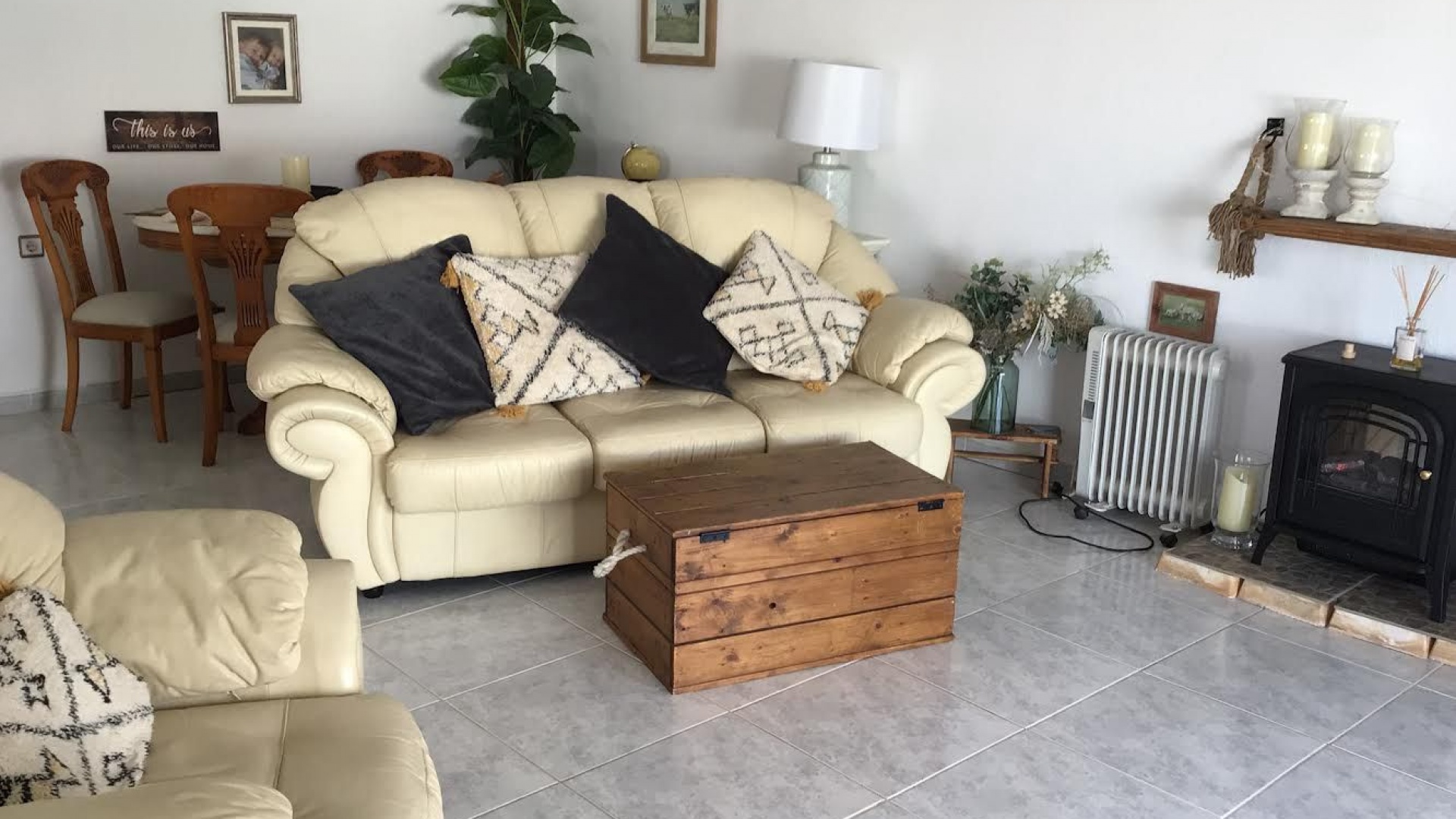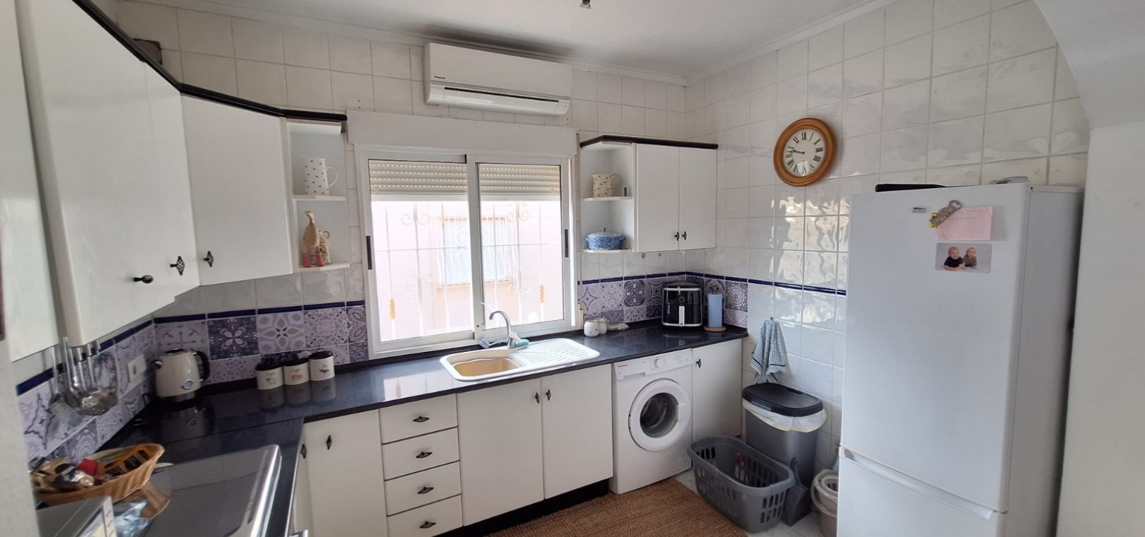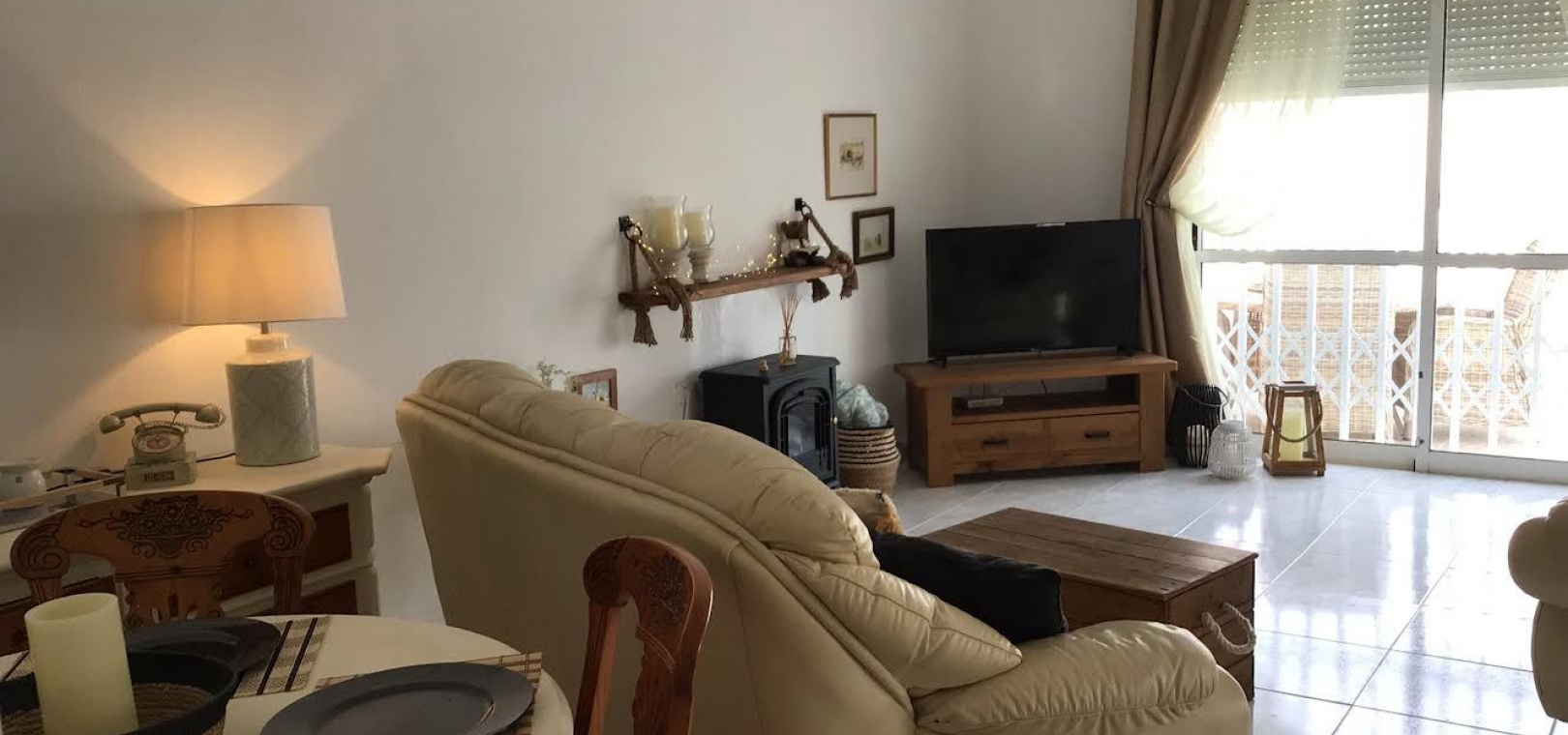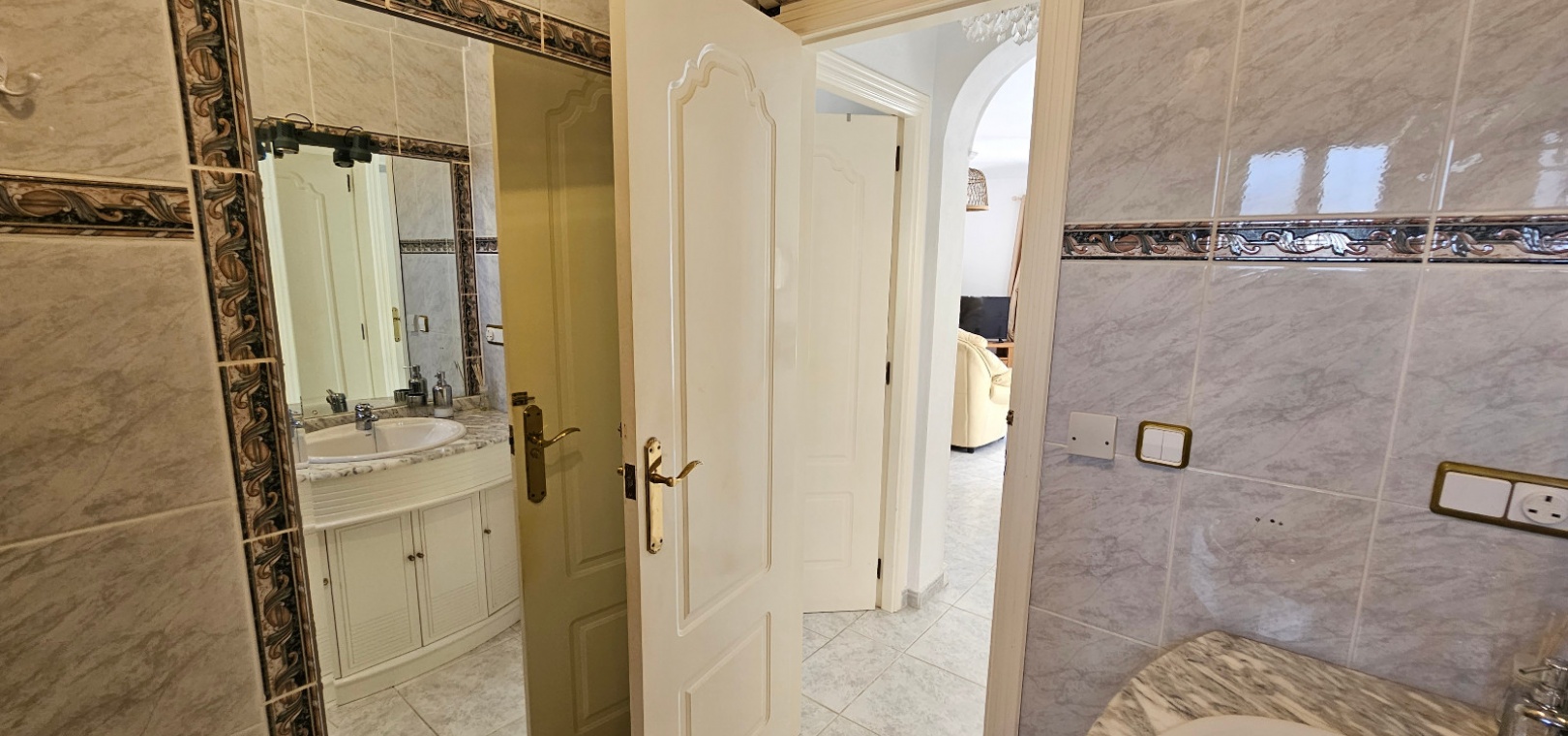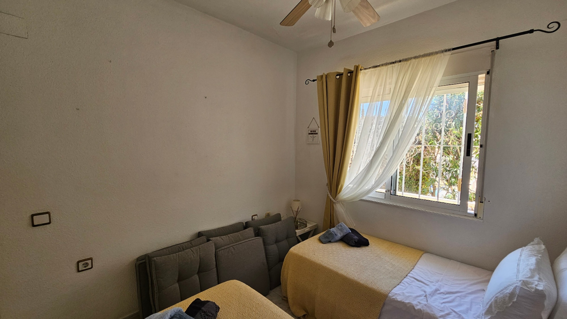 Inne i fastigheten hittar du ett stort vardagsrum/matsal, ett kök med öppen planlösning med varm och kall A/C, 2 x stora dubbelrum med inbyggda garderober och takfläktar och det största sovrummet har ett eget duschrum och varm- och kall A/C. Det finns också ett familjeduschrum som delvis har moderniserats.