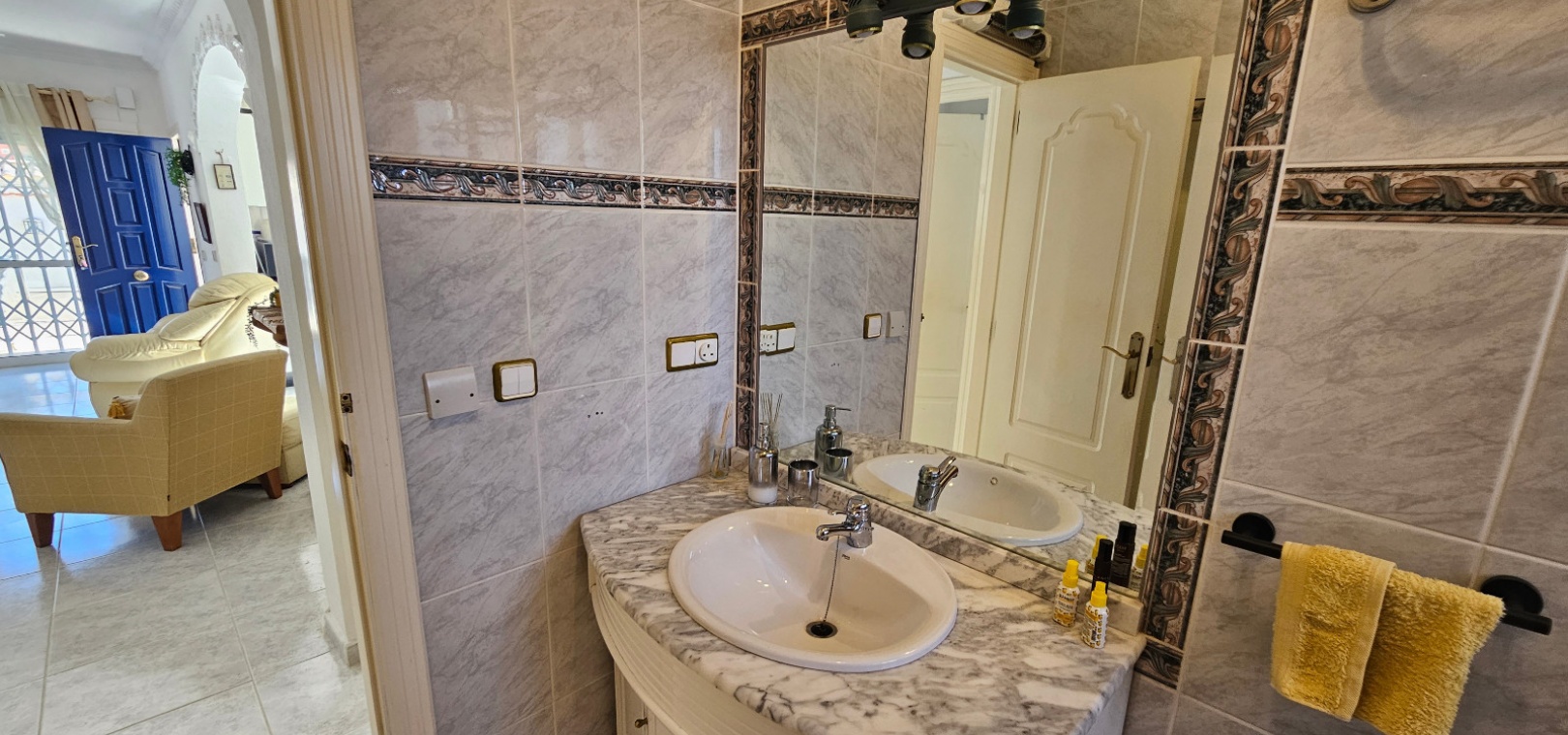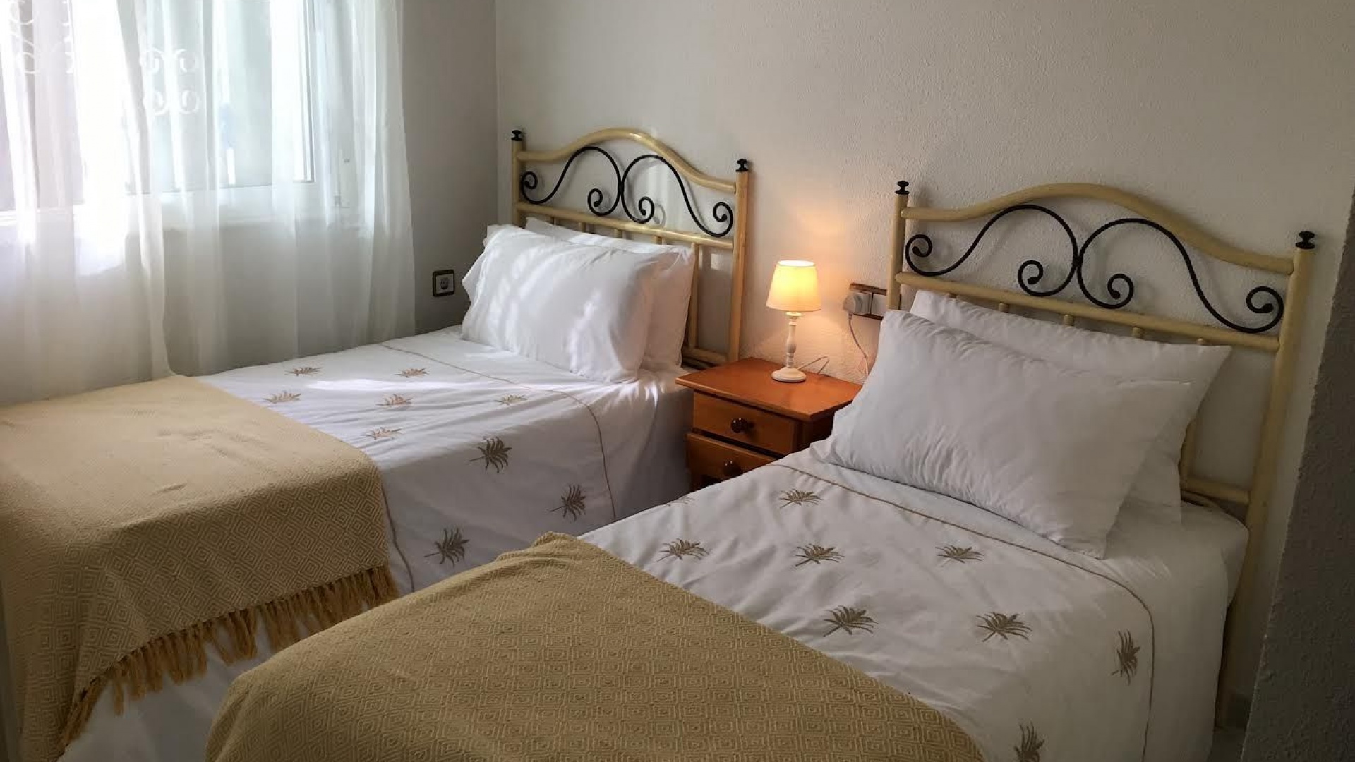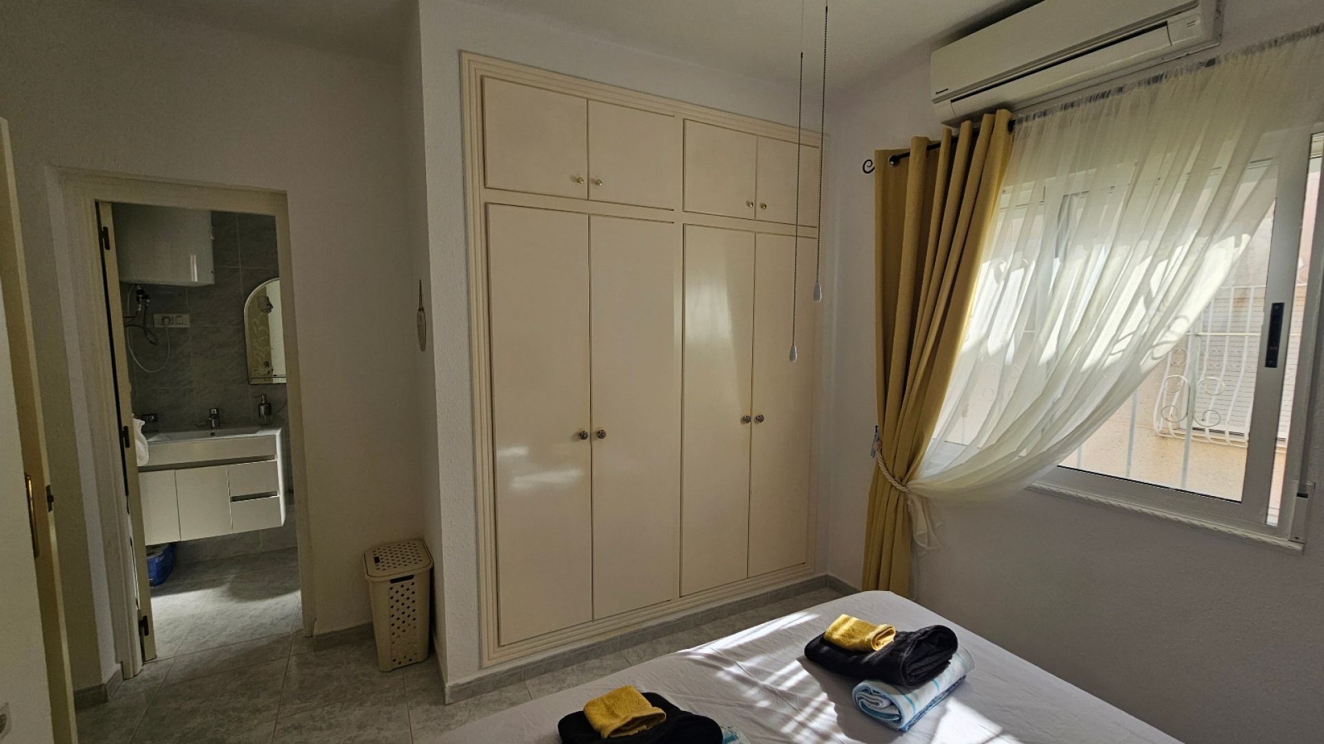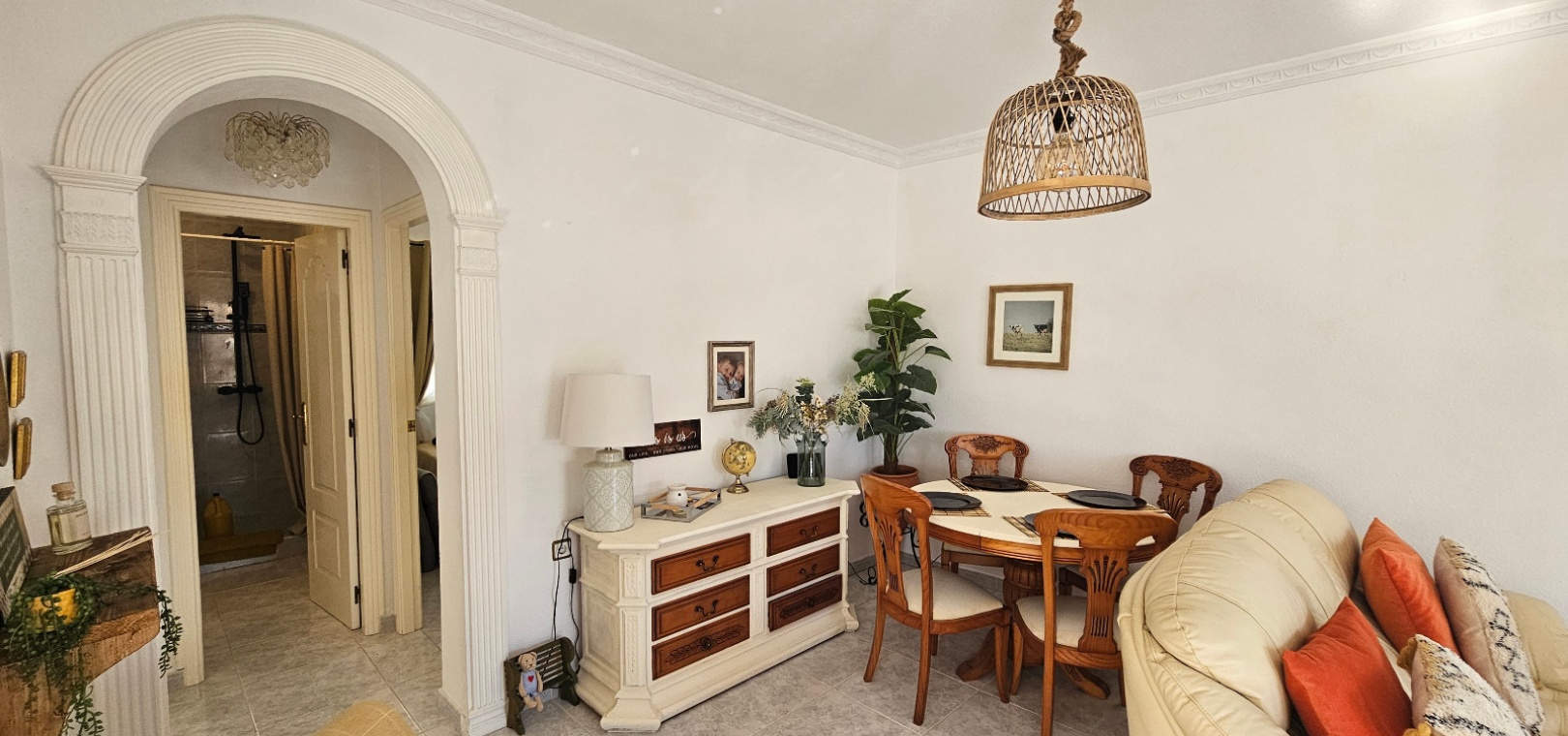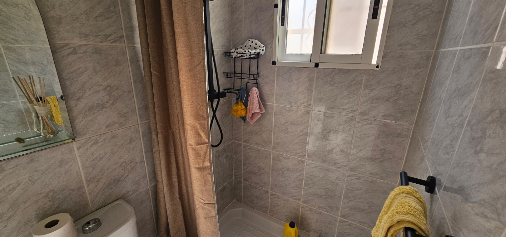 Inne i fastigheten hittar du ett stort vardagsrum/matsal, ett kök med öppen planlösning med varm och kall A/C, 2 x stora dubbelrum med inbyggda garderober och takfläktar och det största sovrummet har ett eget duschrum och varm- och kall A/C. Det finns också ett familjeduschrum som delvis har moderniserats.