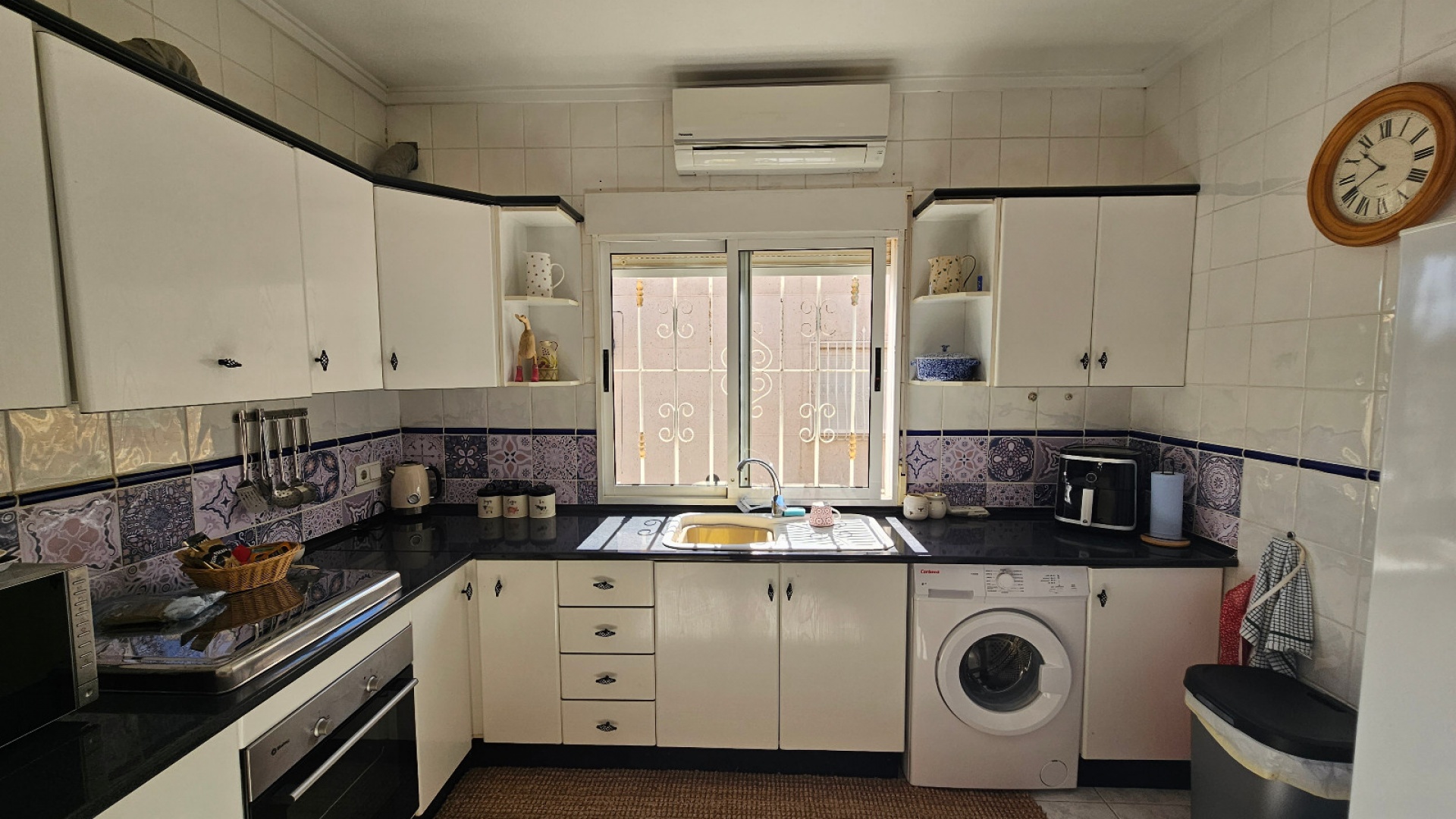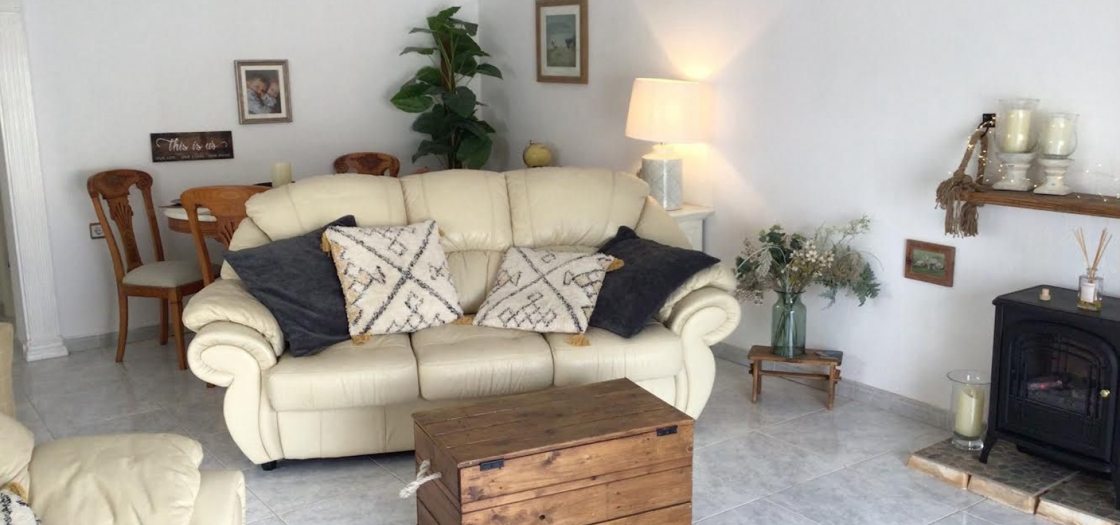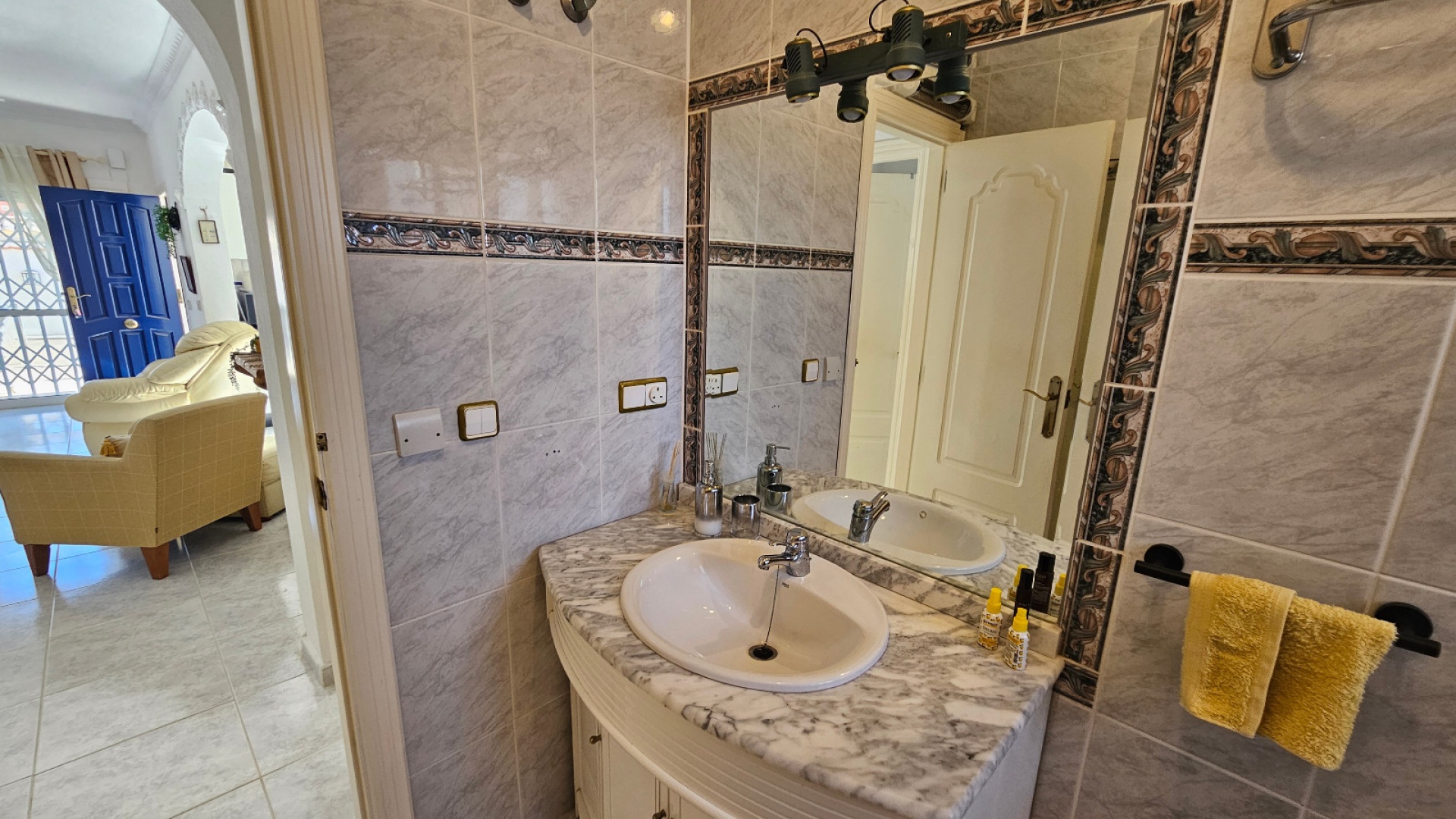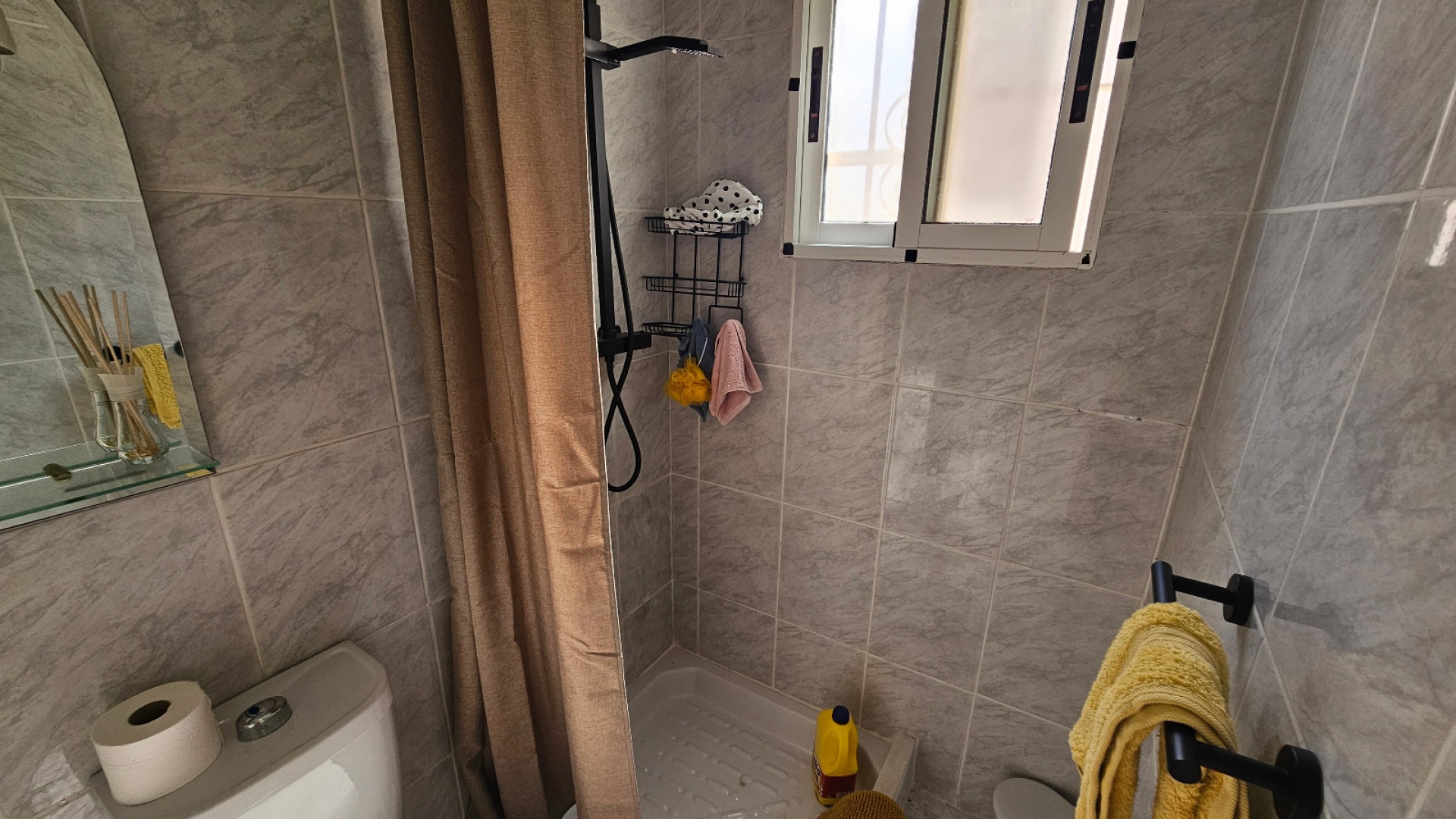 Inne i fastigheten hittar du ett stort vardagsrum/matsal, ett kök med öppen planlösning med varm och kall A/C, 2 x stora dubbelrum med inbyggda garderober och takfläktar och det största sovrummet har ett eget duschrum och varm- och kall A/C. Det finns också ett familjeduschrum som delvis har moderniserats.