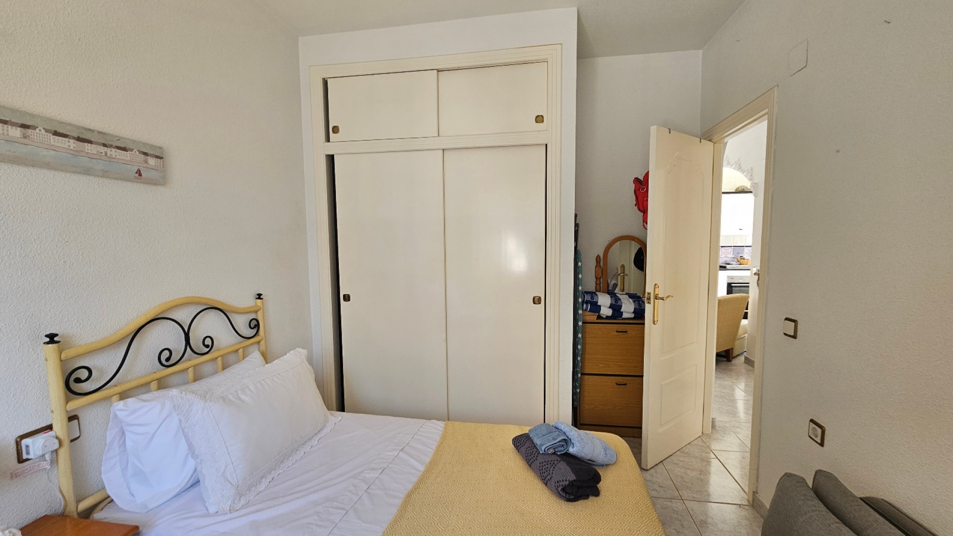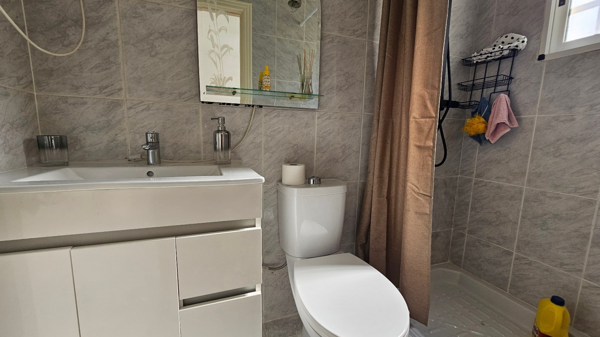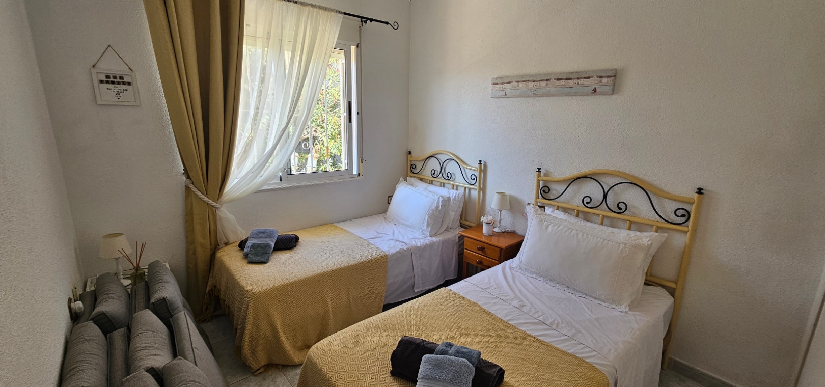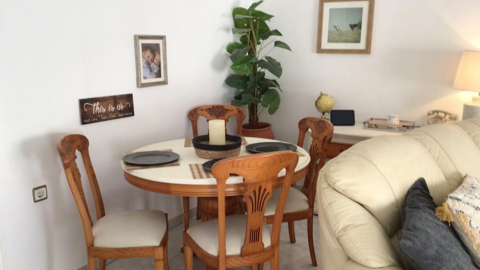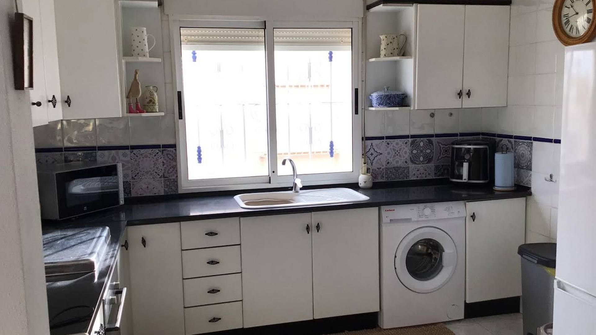 Inne i fastigheten hittar du ett stort vardagsrum/matsal, ett kök med öppen planlösning med varm och kall A/C, 2 x stora dubbelrum med inbyggda garderober och takfläktar och det största sovrummet har ett eget duschrum och varm- och kall A/C. Det finns också ett familjeduschrum som delvis har moderniserats.