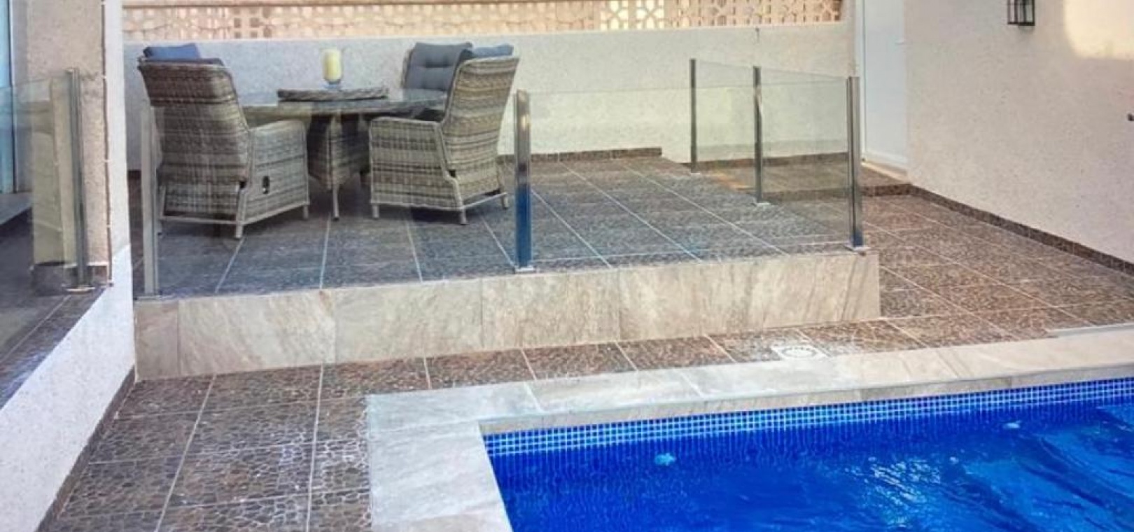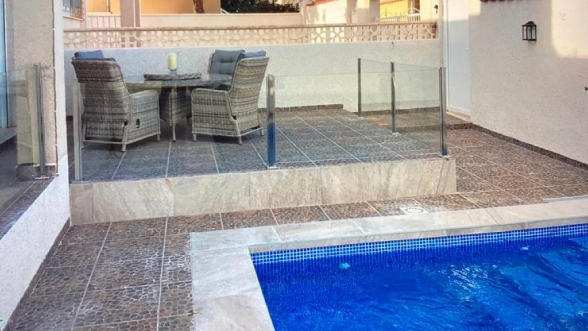 På framsidan av denna vackra enplansfastighet finns en helt ny privat pool och terrass med glaspaneler.