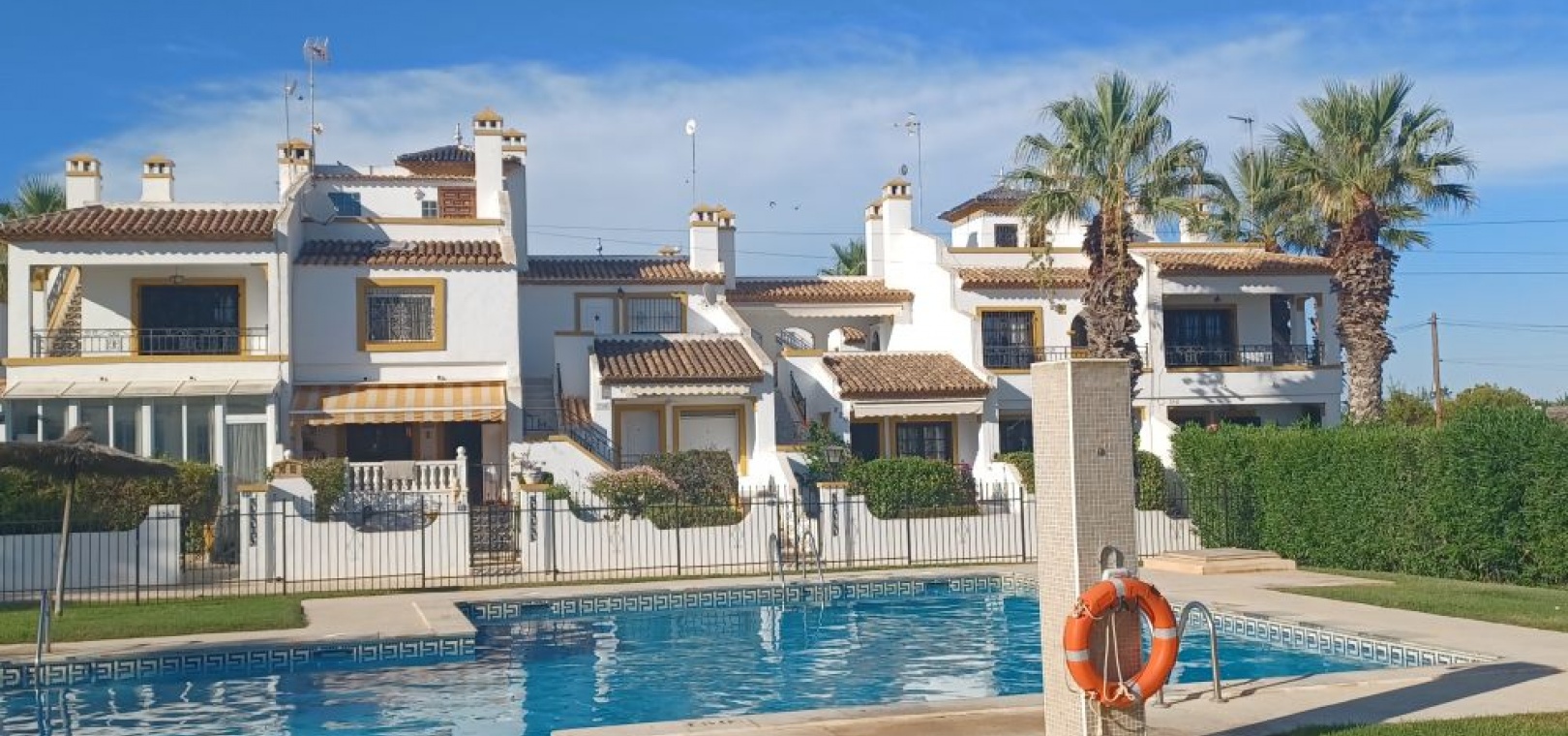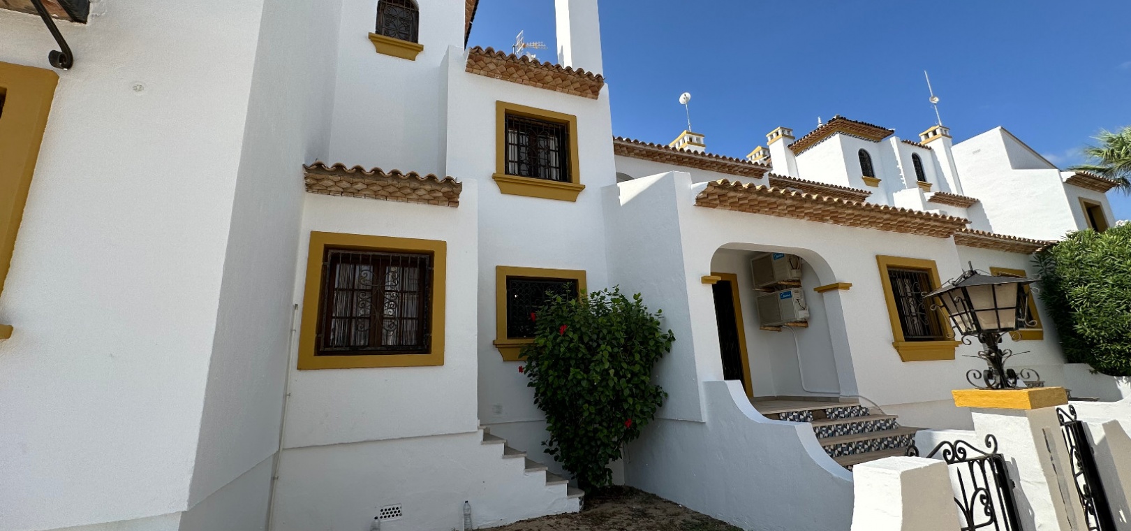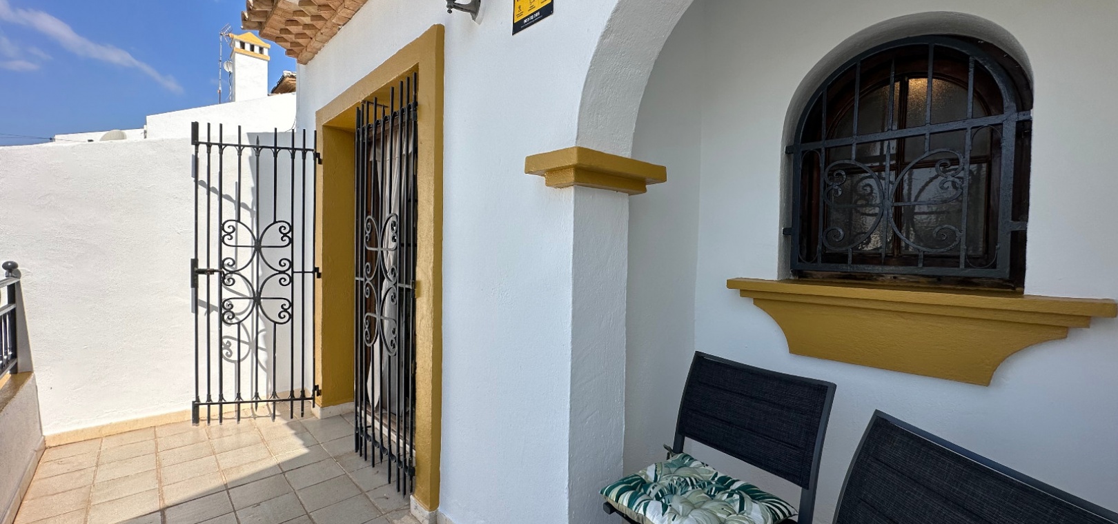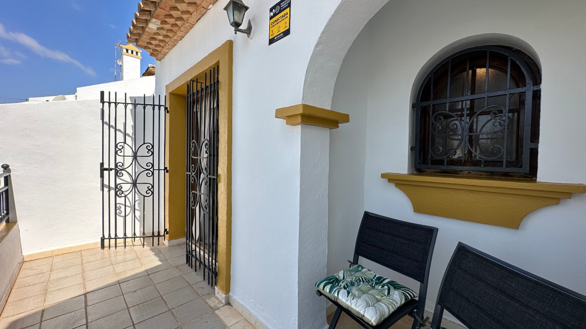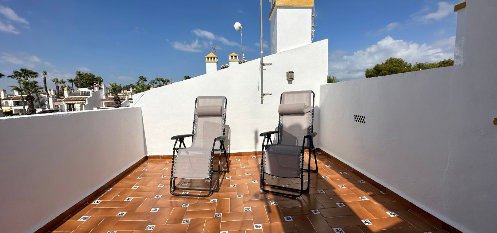 Ett radhus i söderläge med 2 sovrum och 1,5 badrum i Sofia stil med ett privat takterrass med utsikt över den gemensamma poolen i Valencias, Villamartin, Costa Blanca.