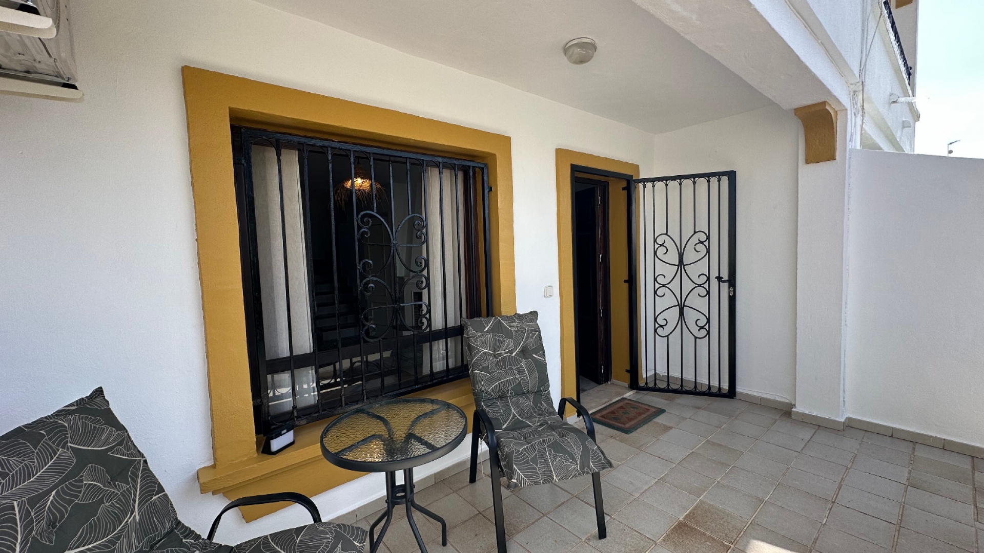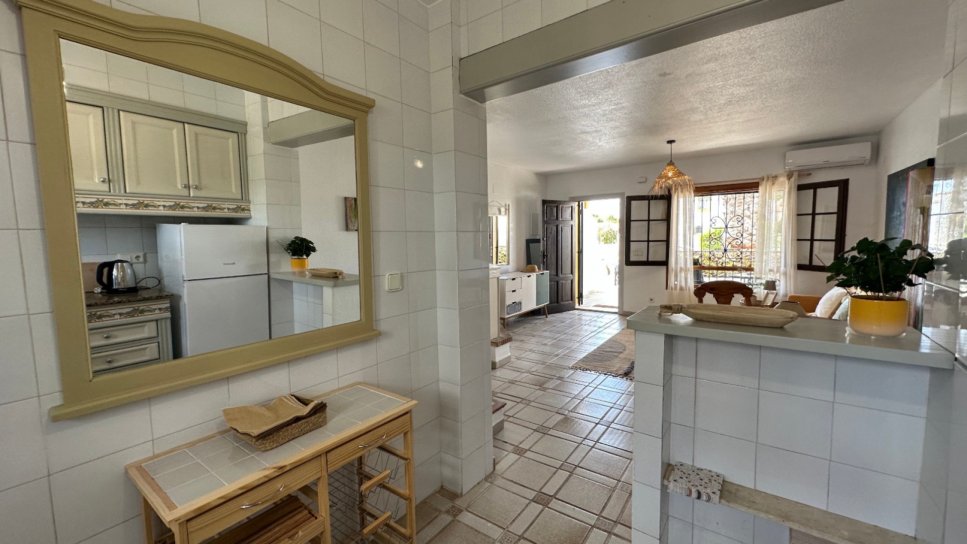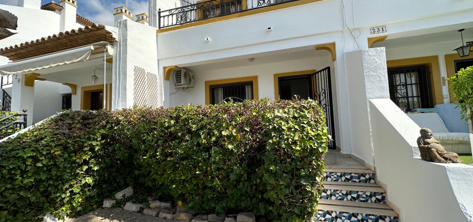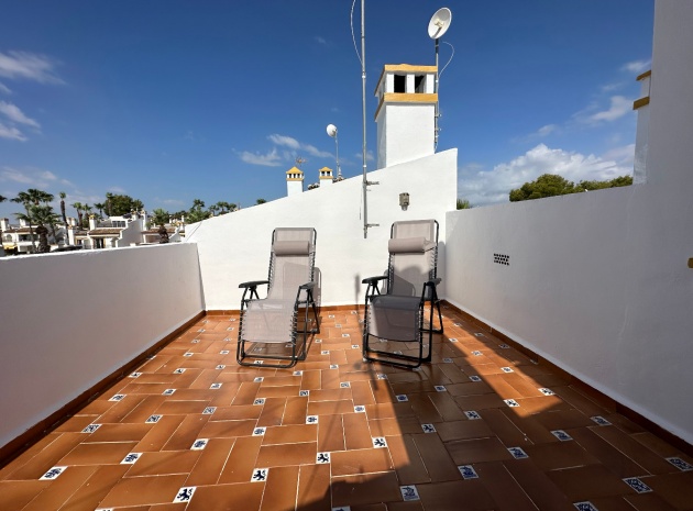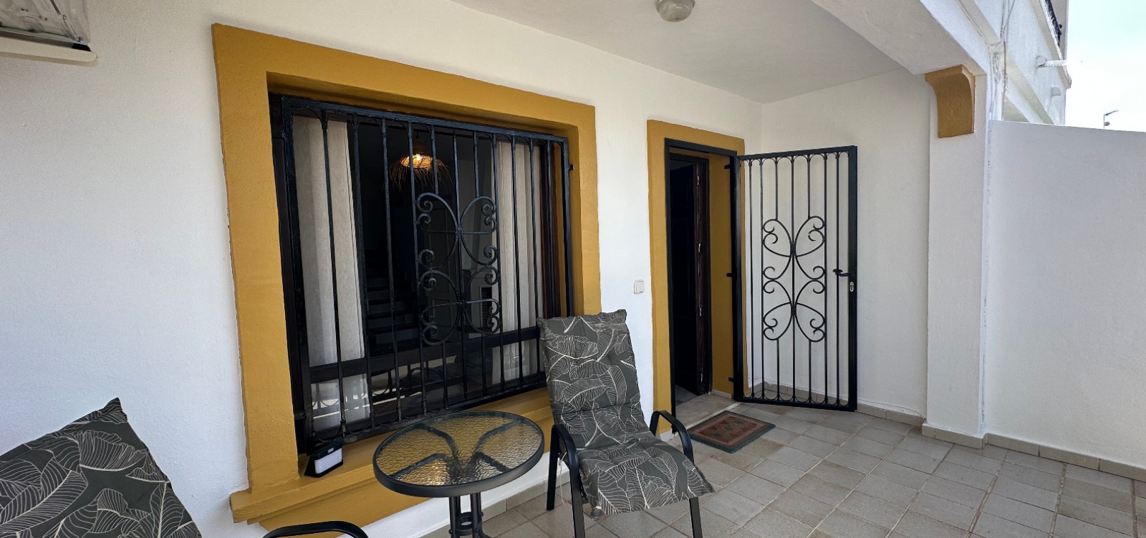 Ett radhus i söderläge med 2 sovrum och 1,5 badrum i Sofia stil med ett privat takterrass med utsikt över den gemensamma poolen i Valencias, Villamartin, Costa Blanca.