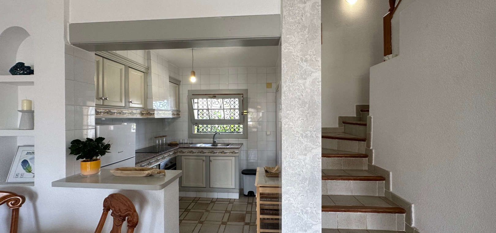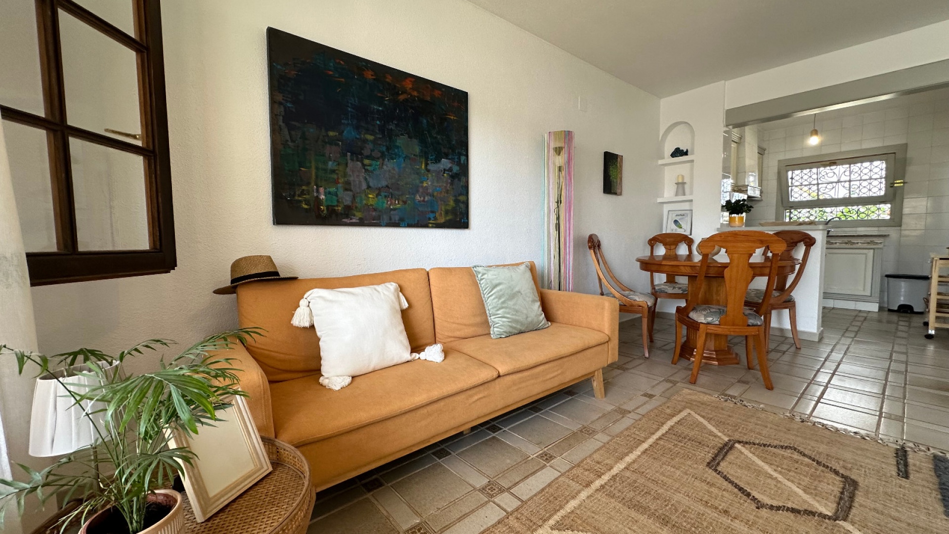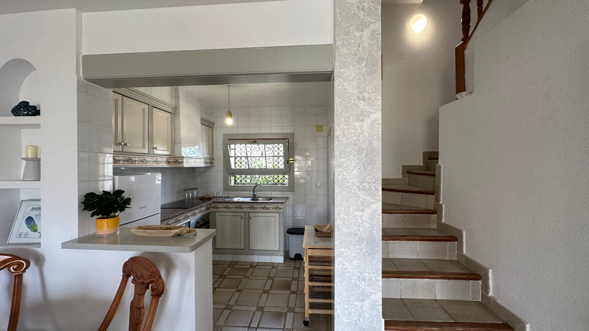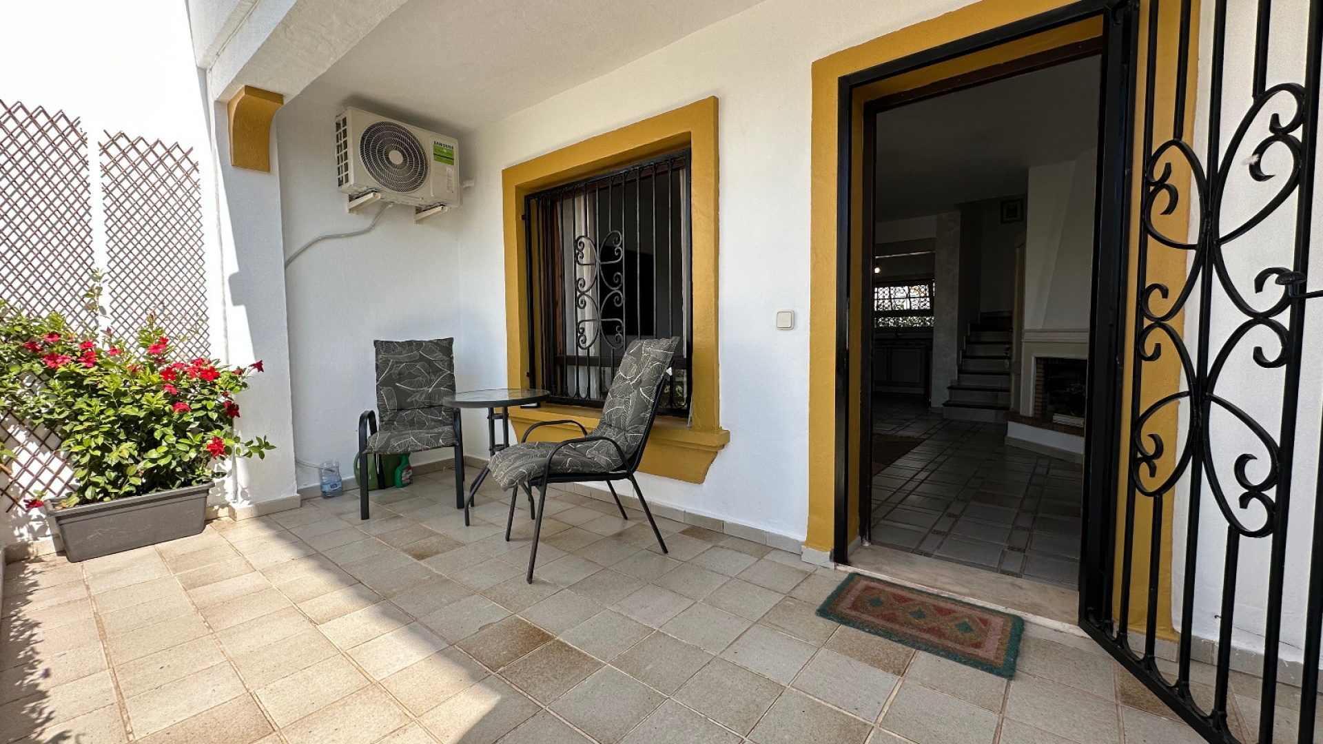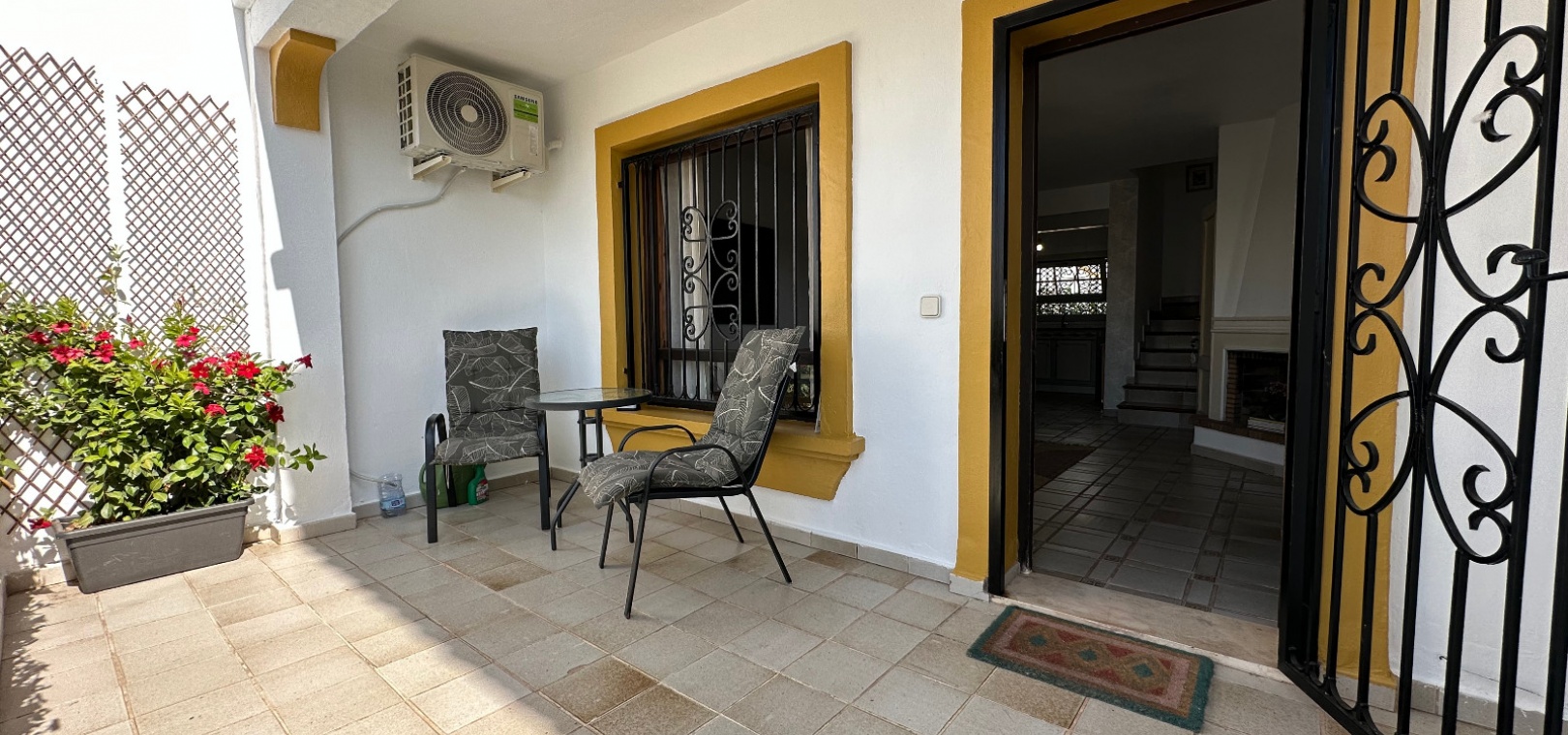 Ett radhus i söderläge med 2 sovrum och 1,5 badrum i Sofia stil med ett privat takterrass med utsikt över den gemensamma poolen i Valencias, Villamartin, Costa Blanca.