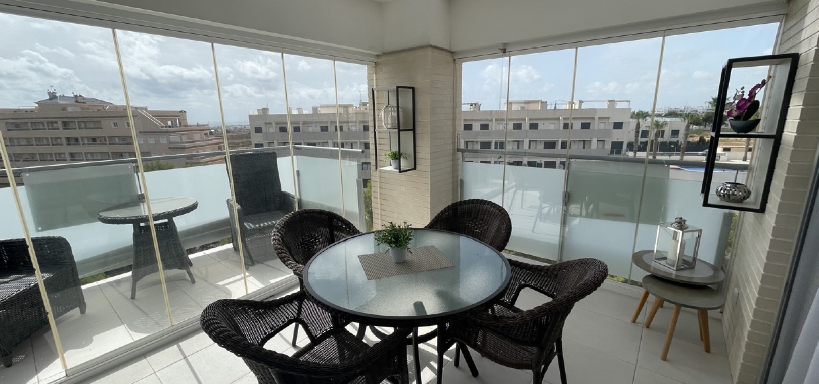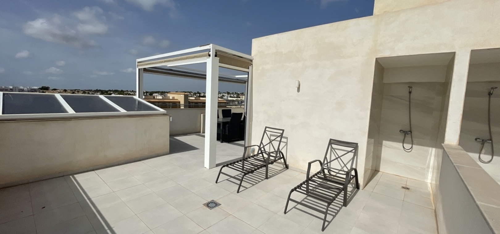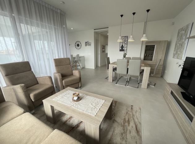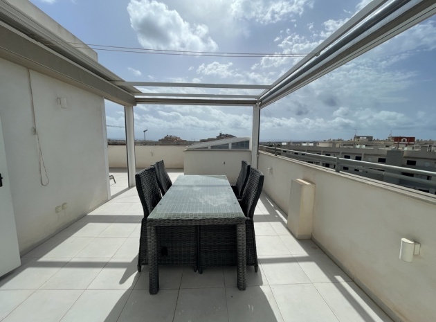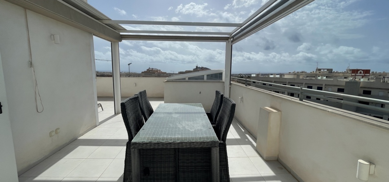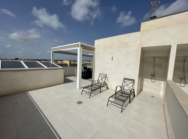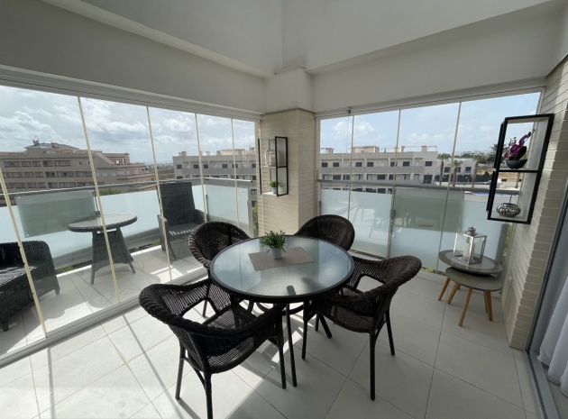 En lyxig lägenhet på översta våningen med 3 bäddar och 2 badrum i sydost med ett privat takterrass i Res. Mirador de Villamartin, Los Dolses, Villamartin, Costa Blanca. Denna härliga fastighet i modern stil säljs i nyskick, säljs möblerad och består mycket kortfattat av följande: - Stort vardagsrum/matsal, kök med öppen planlösning, 2 x dubbelrum med inbyggda garderober, 1 x enkelrum, det största Sovrummet har ett eget duschrum, 1 x moderna duschrum, stor inglasad terrass på framsidan, stort privat takterrass med öppen utsikt, 2 x gemensamma pooler och trädgårdar, gemensam parkering och mycket mer. Denna fastighet är idealiskt belägen inom gångavstånd till affärer, barer och restauranger. Stränderna i La Zenia och Playa Flamenca ligger bara några minuter bort med bil - liksom köpcentret Zenia Boulevard. Alicantes flygplats ligger 50 minuters bilresa bort.