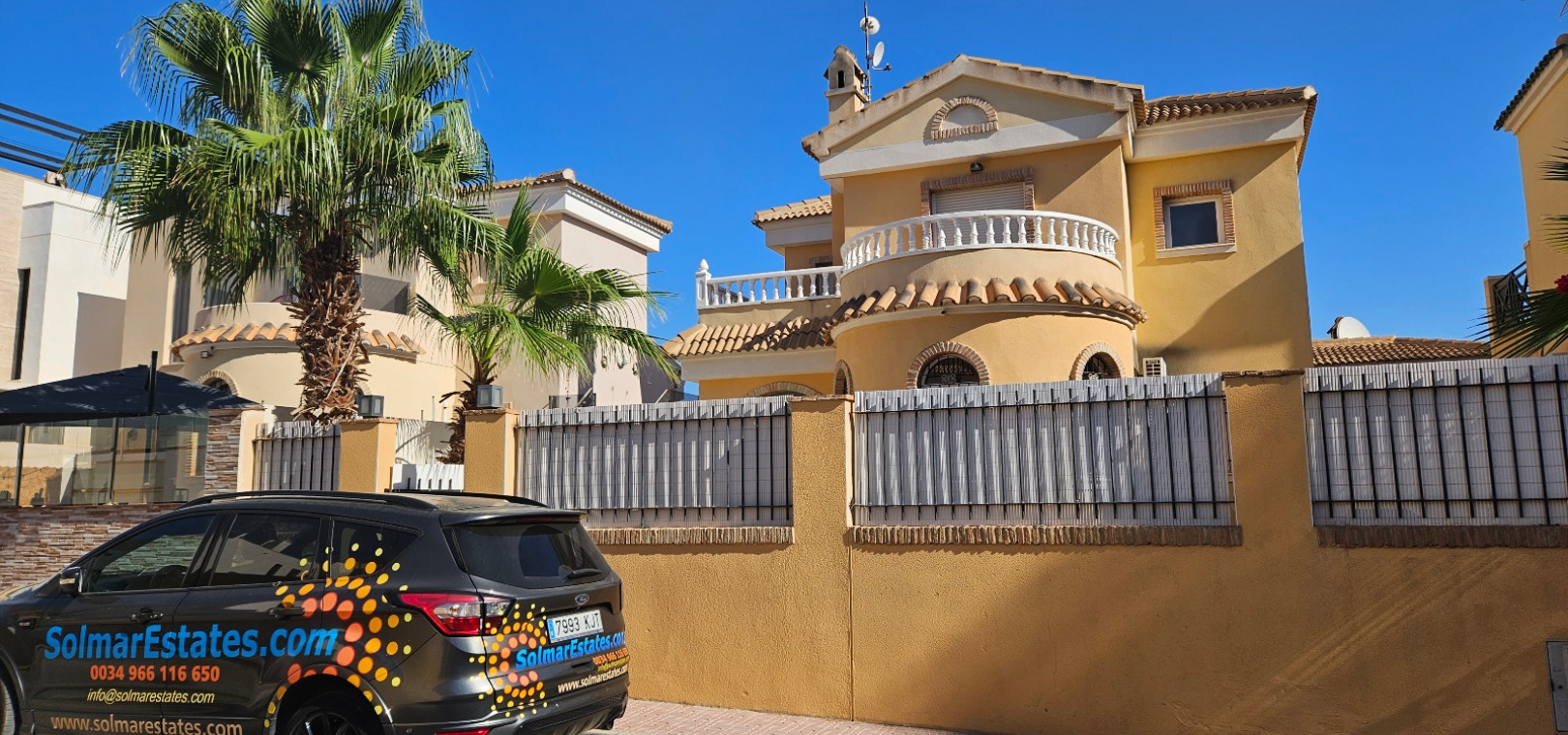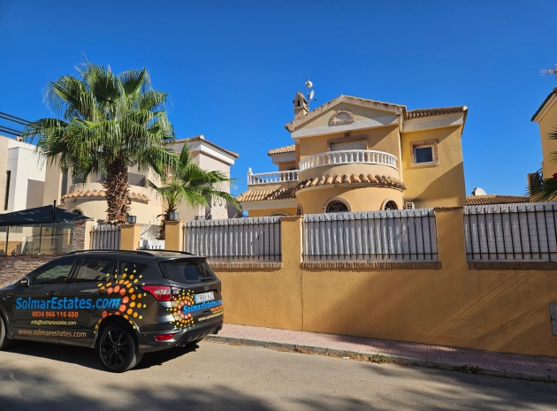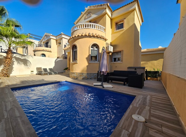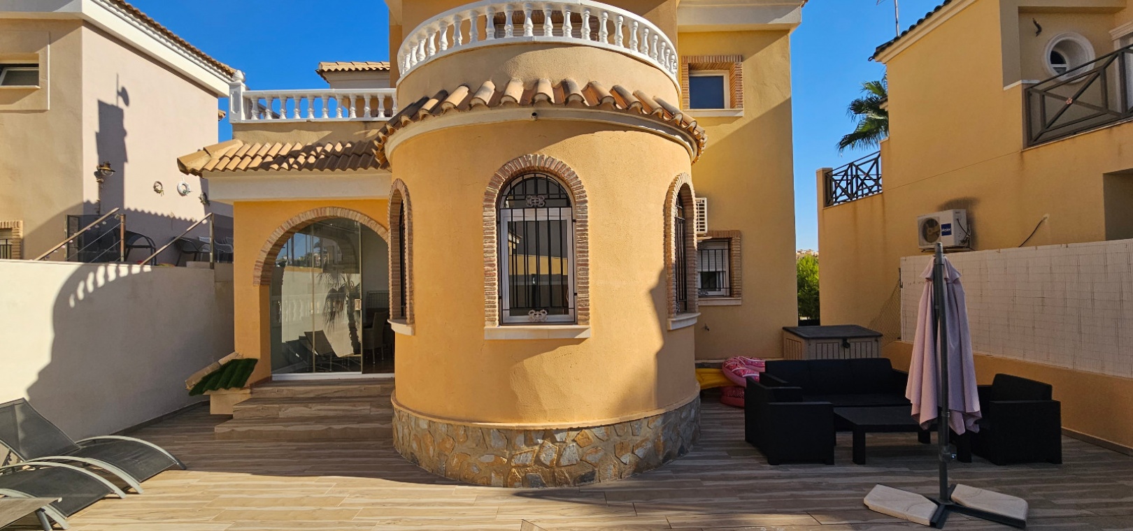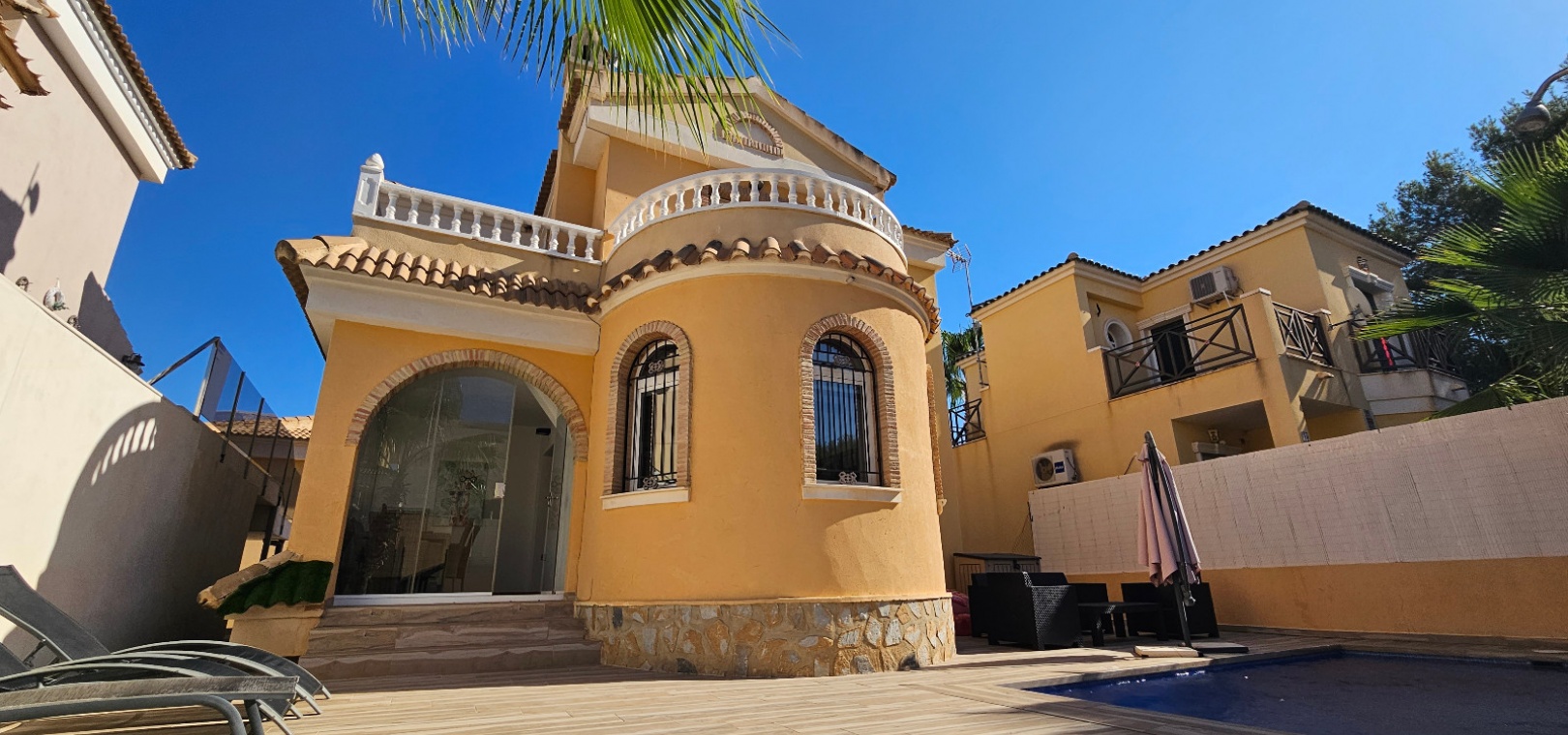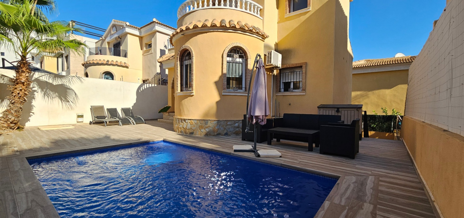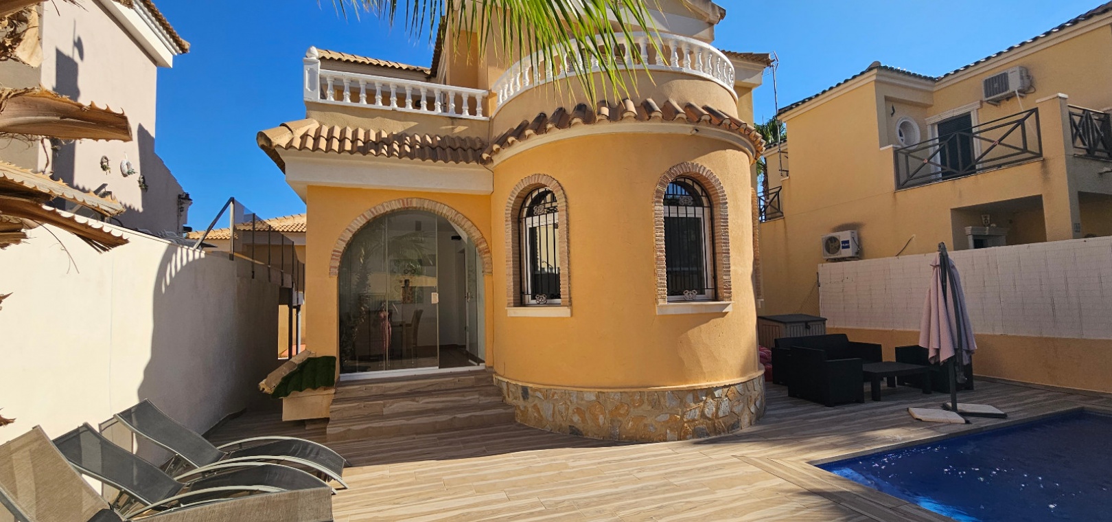 En fristående villa med 3 sovrum och 2 badrum i söderläge med privat pool i Las Filipinas, Villamartin, Costa Blanca. Denna härliga fastighet ligger i en återvändsgränd och säljs i mycket gott skick, säljs möblerad och består mycket kortfattat av följande:- På bottenvåningen finns en lounge/matsal med varm och kall A/C , en takfläkt och träbjälkar i taket, ett fullt utrustat kök i öppen planlösning, 1 x dubbelrum med inbyggda garderober, varm och kall luftkonditionering och takfläkt och 1 x duschrum. På första våningen finns 2 x stora dubbelrum båda med inbyggda garderober, varm och kall A/C, takfläktar och privata balkonger och 1 x familjebadrum. Utanför finns en inglasad terrass på framsidan, nykaklat trädgårdsområde med privat pool och mycket mycket mer. Det finns också en stor underbyggnad med en separat entré med ett stort vardagsrum/matrum, 1 x duschrum och 1 x litet sovrum, detta har utmärkt potential att bli en fristående lägenhet. Denna fastighet har utmärkt uthyrnings-/investeringspotential eftersom den har en turistlicens. Denna fastighet ligger bara en kort promenad till alla bekvämligheter, 5 minuter med bil till stranden La Zenia eller så kan du hoppa på lokalbussen, Mindre än 5 minuter med bil till 4 golfbanor och 50 minuter till Alicantes flygplats.