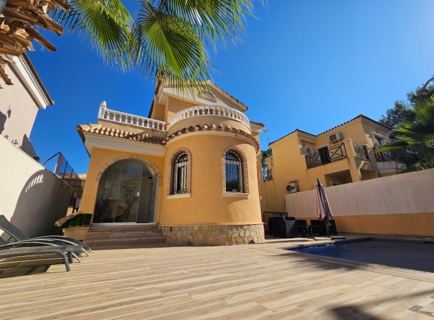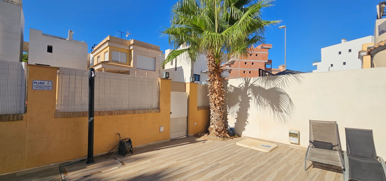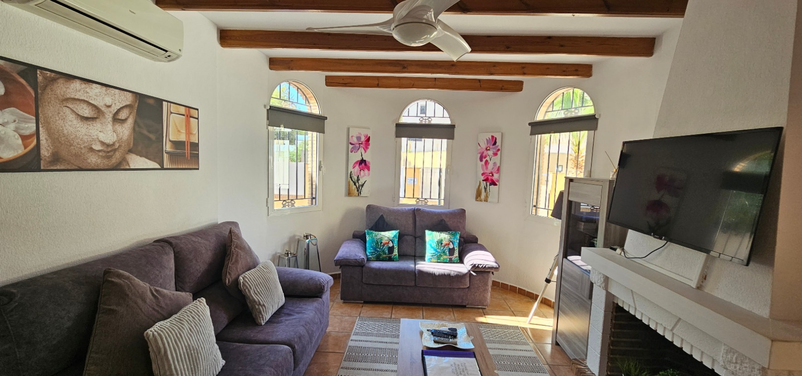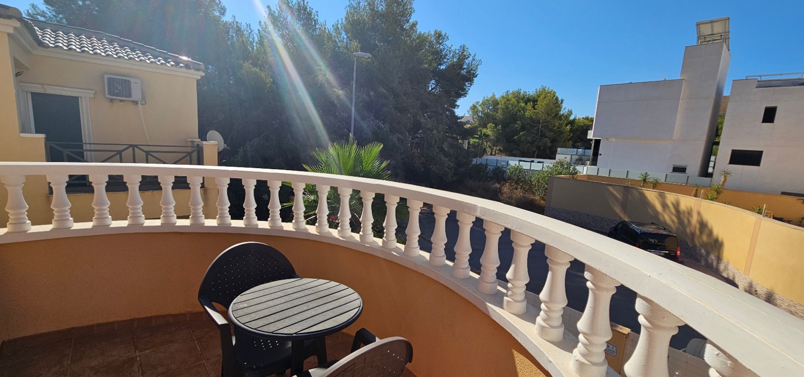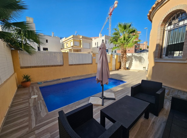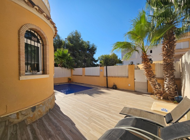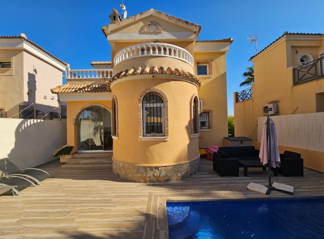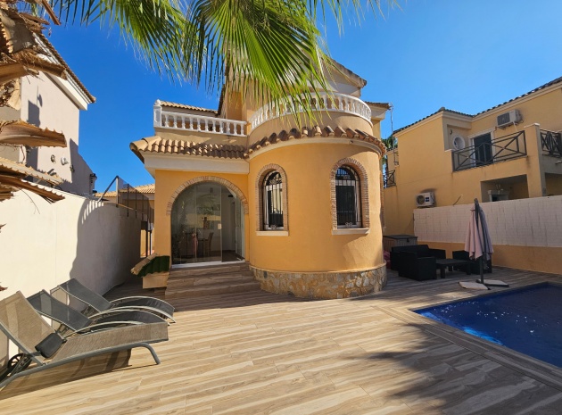 En fristående villa med 3 sovrum och 2 badrum i söderläge med privat pool i Las Filipinas, Villamartin, Costa Blanca. Denna härliga fastighet ligger i en återvändsgränd och säljs i mycket gott skick, säljs möblerad och består mycket kortfattat av följande:- På bottenvåningen finns en lounge/matsal med varm och kall A/C , en takfläkt och träbjälkar i taket, ett fullt utrustat kök i öppen planlösning, 1 x dubbelrum med inbyggda garderober, varm och kall luftkonditionering och takfläkt och 1 x duschrum. På första våningen finns 2 x stora dubbelrum båda med inbyggda garderober, varm och kall A/C, takfläktar och privata balkonger och 1 x familjebadrum. Utanför finns en inglasad terrass på framsidan, nykaklat trädgårdsområde med privat pool och mycket mycket mer. Det finns också en stor underbyggnad med en separat entré med ett stort vardagsrum/matrum, 1 x duschrum och 1 x litet sovrum, detta har utmärkt potential att bli en fristående lägenhet. Denna fastighet har utmärkt uthyrnings-/investeringspotential eftersom den har en turistlicens. Denna fastighet ligger bara en kort promenad till alla bekvämligheter, 5 minuter med bil till stranden La Zenia eller så kan du hoppa på lokalbussen, Mindre än 5 minuter med bil till 4 golfbanor och 50 minuter till Alicantes flygplats.