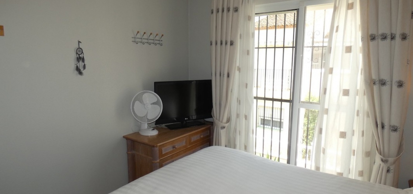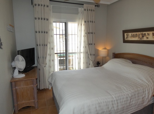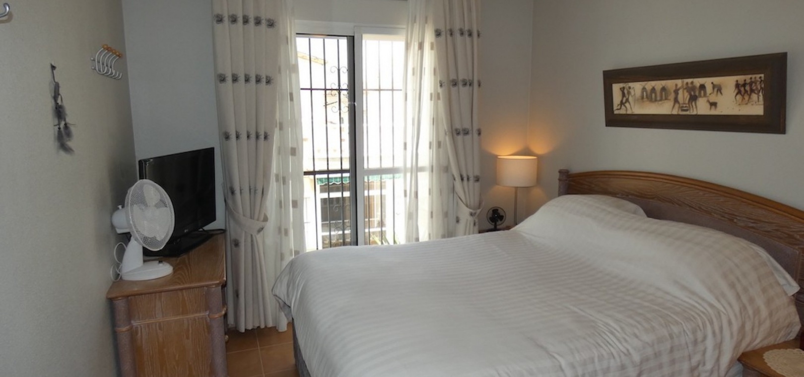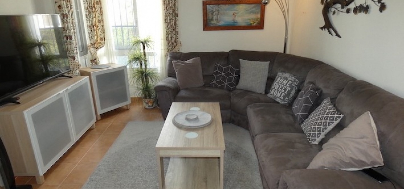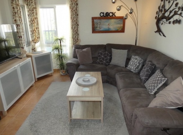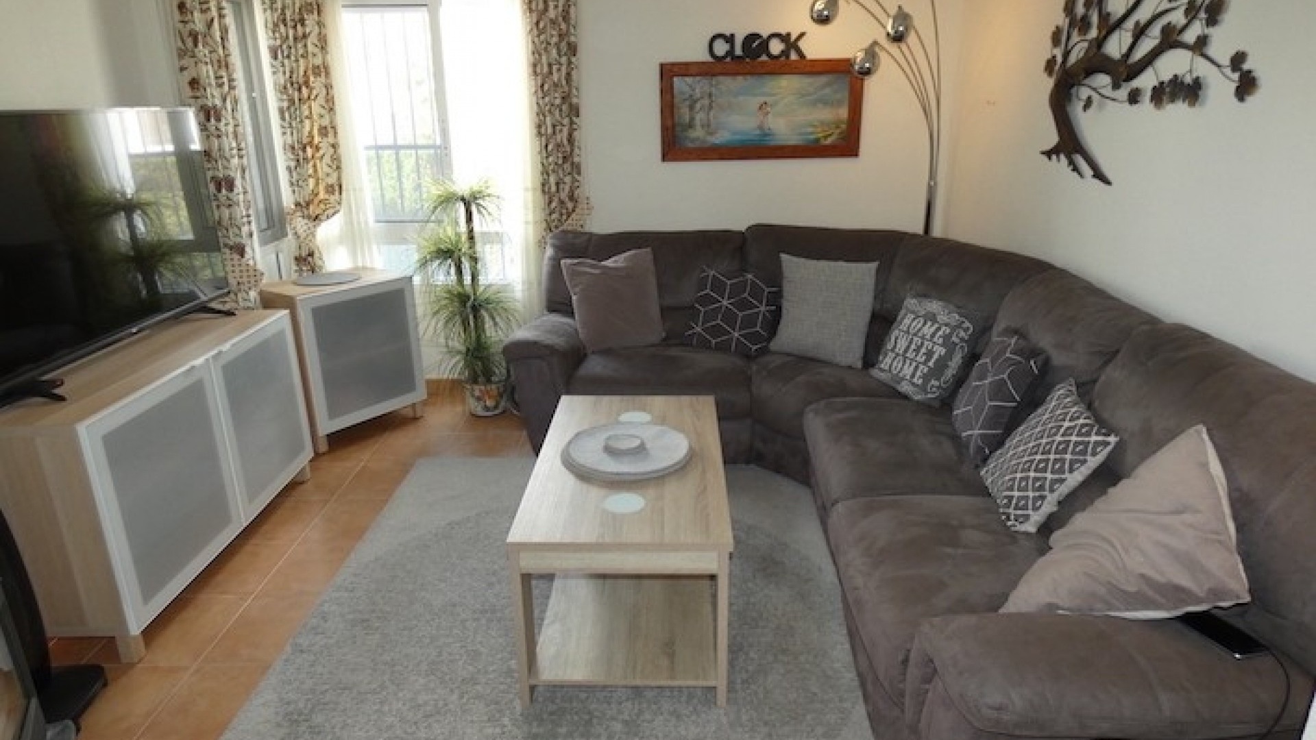 Stort vardagsrum/matsal med en funktionsplats, separat fullt utrustat kök, 3 x dubbelrum, 1 x duschrum, 1 x familjebadrum, inglasad terrass på framsidan, balkong, privat takterrass, trädgård med uppfart för off-road parkering, gemensam pool och mycket mer.