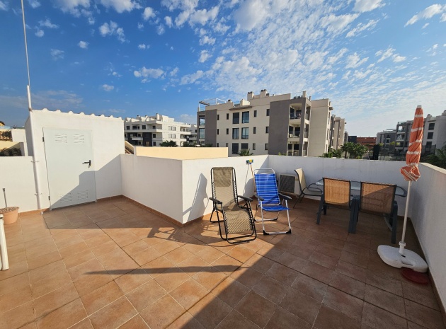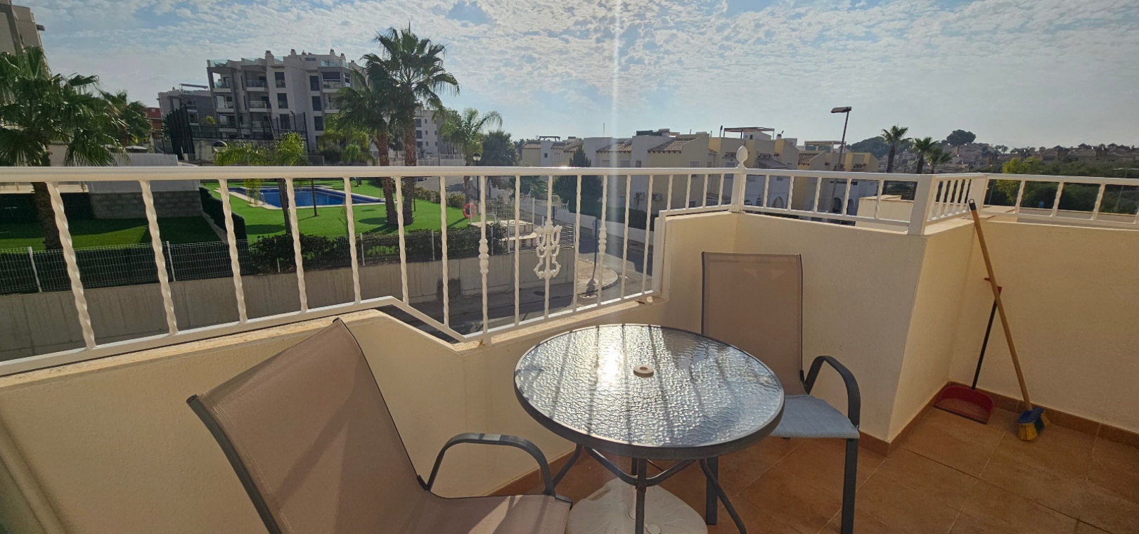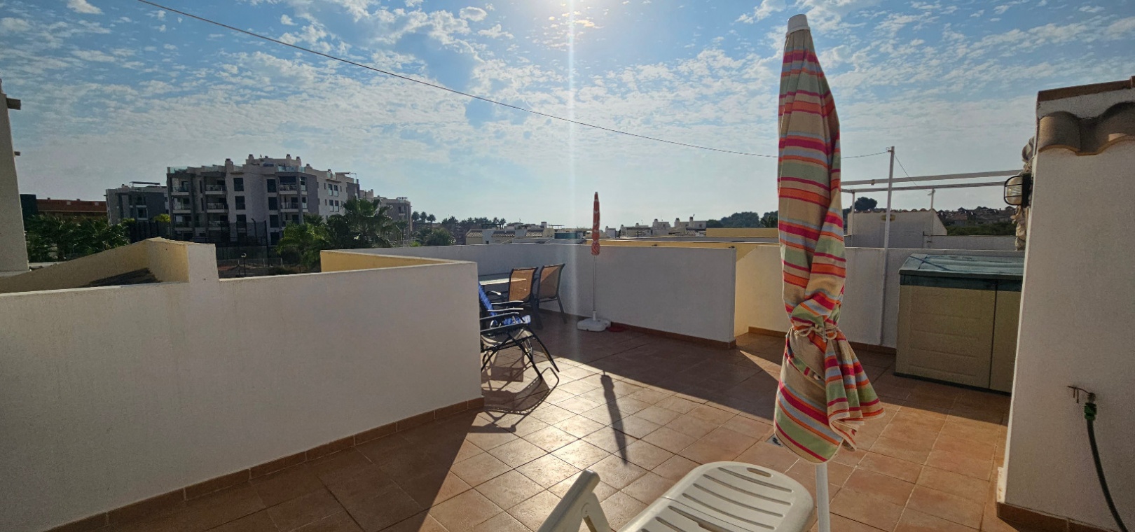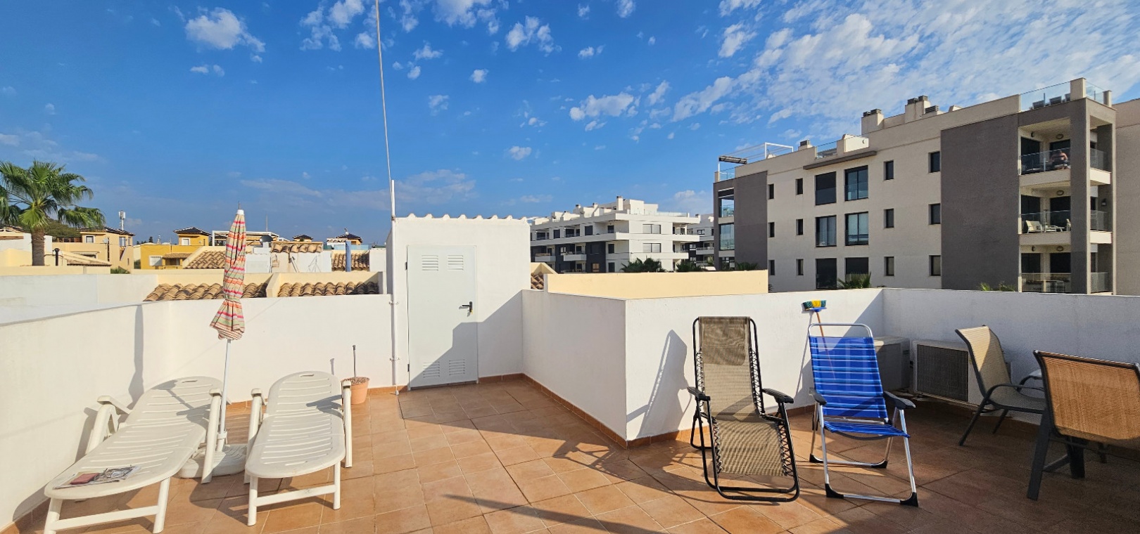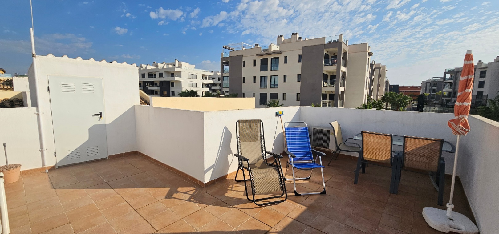 En lägenhet med 3 sovrum och 2 badrum på översta våningen med ett stort privat taksolarium belägen i Panorama Golf, Villamartin, Costa Blanca South.